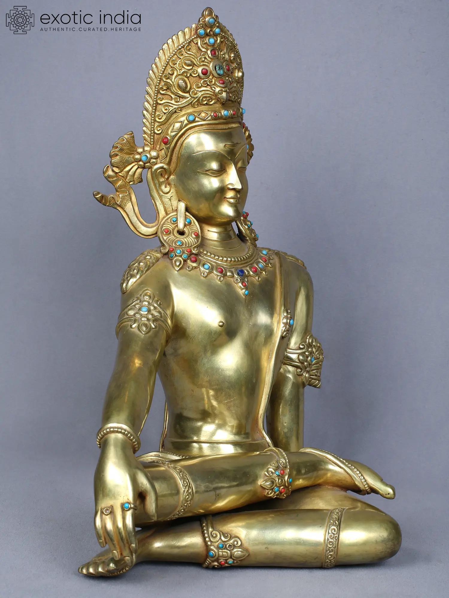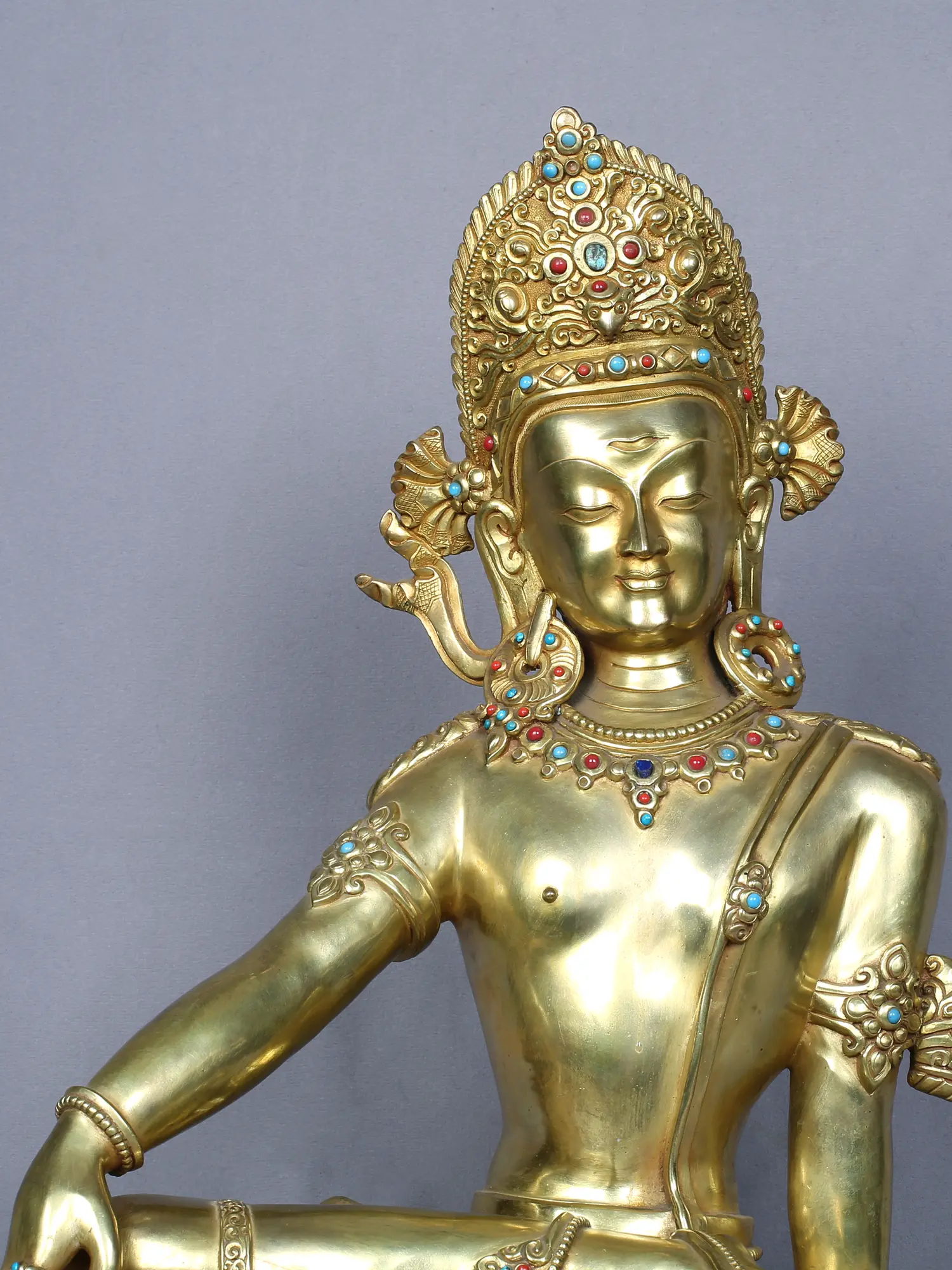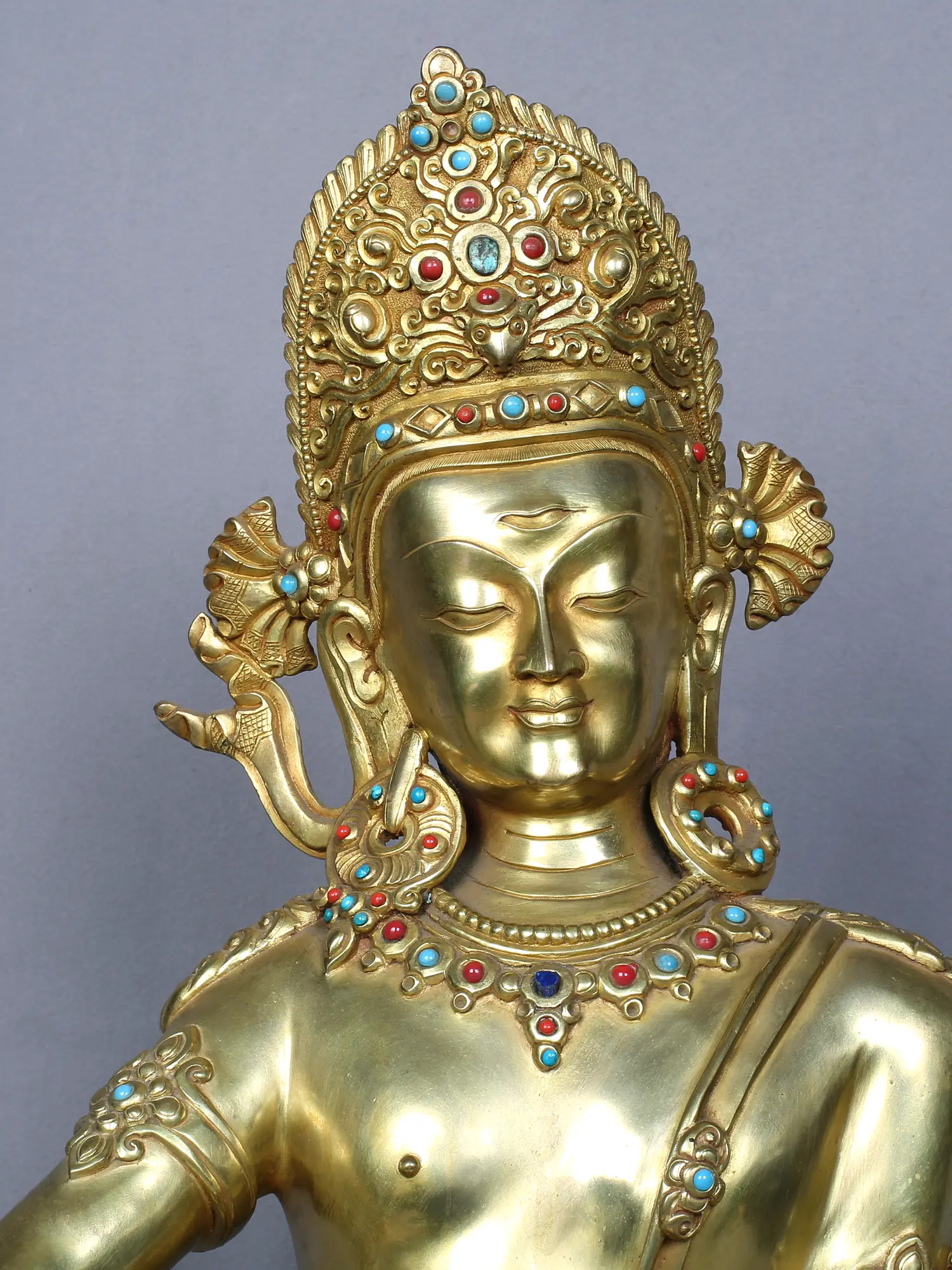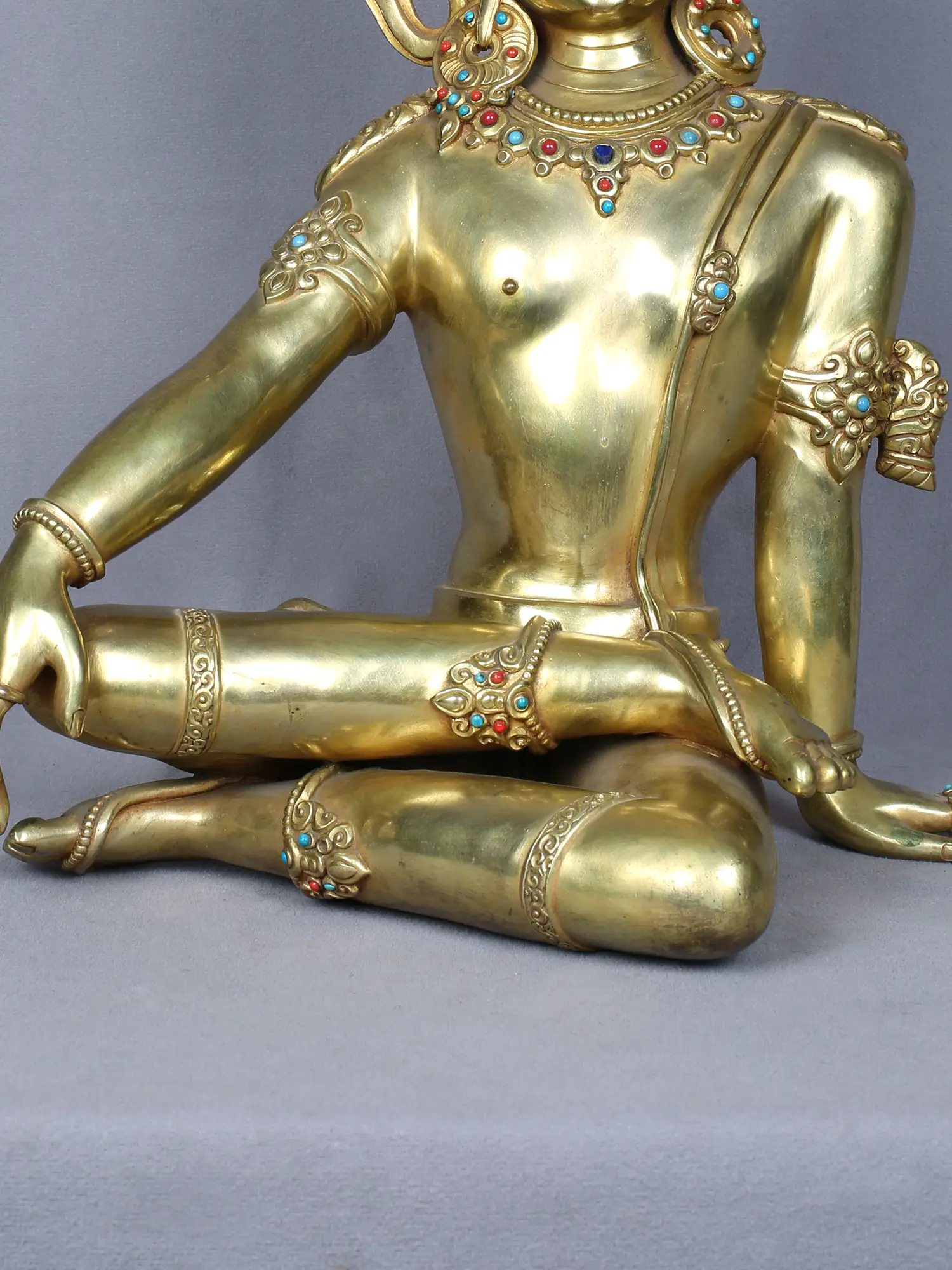 This glistening gilded copper statue of Indra from Nepal depicts him in the regal Maharajalilasana, a pose that exudes a sense of grandeur. With finesse, the artists have captured the regal essence of the Lord of gods, adorning him with an ornate crown with delicate tassels, circular gemmed earrings, necklace, armlets, a golden sacred thread, anklets, and rings. Indra's body balances youthfulness with a warrior's strength, which are the perfect qualities in a sovereign according to Hindu traditions.