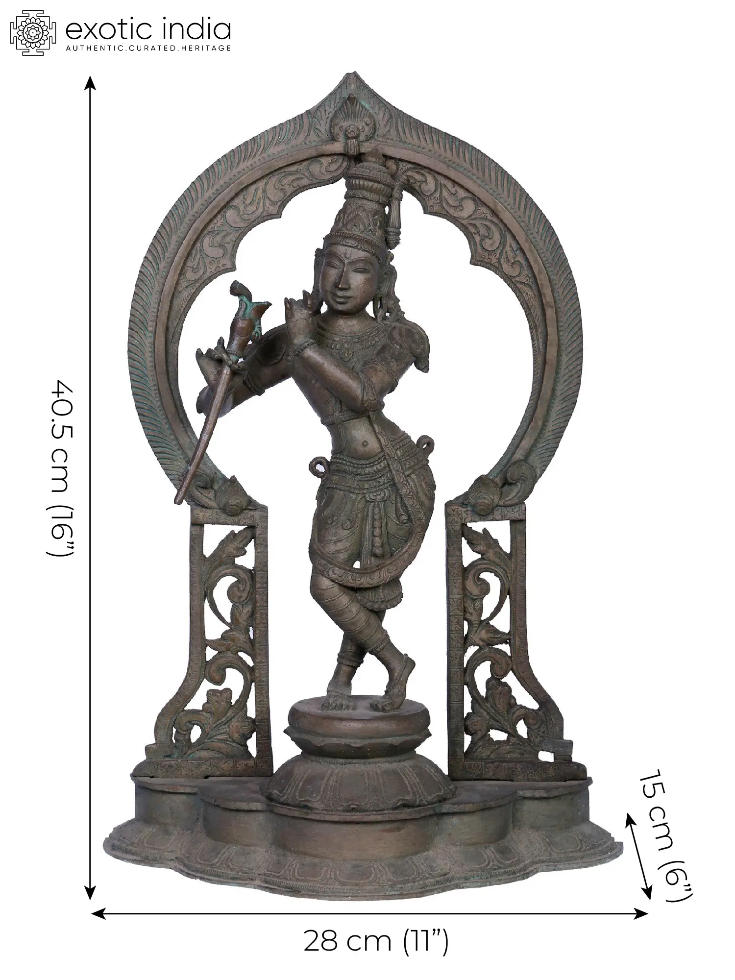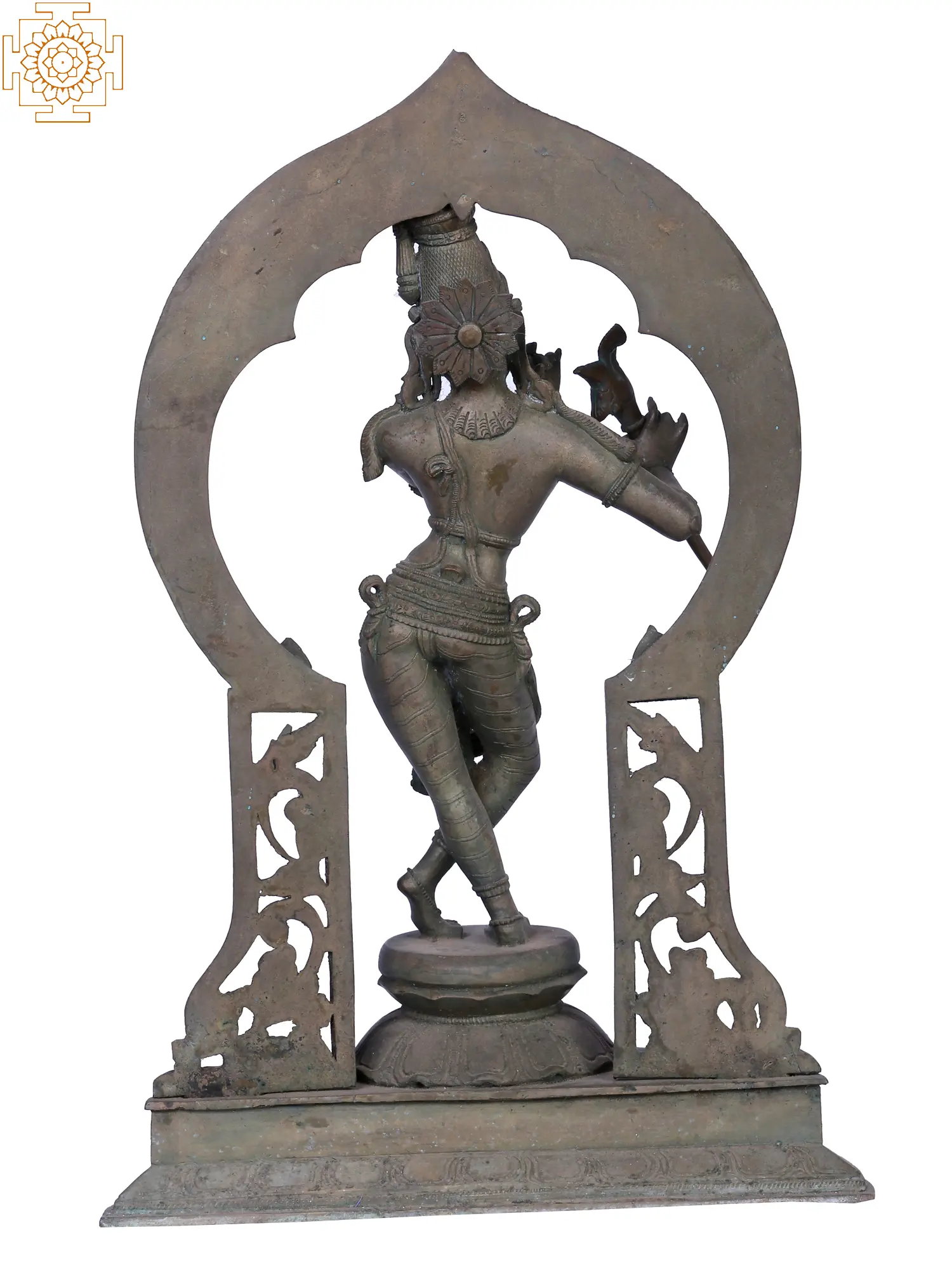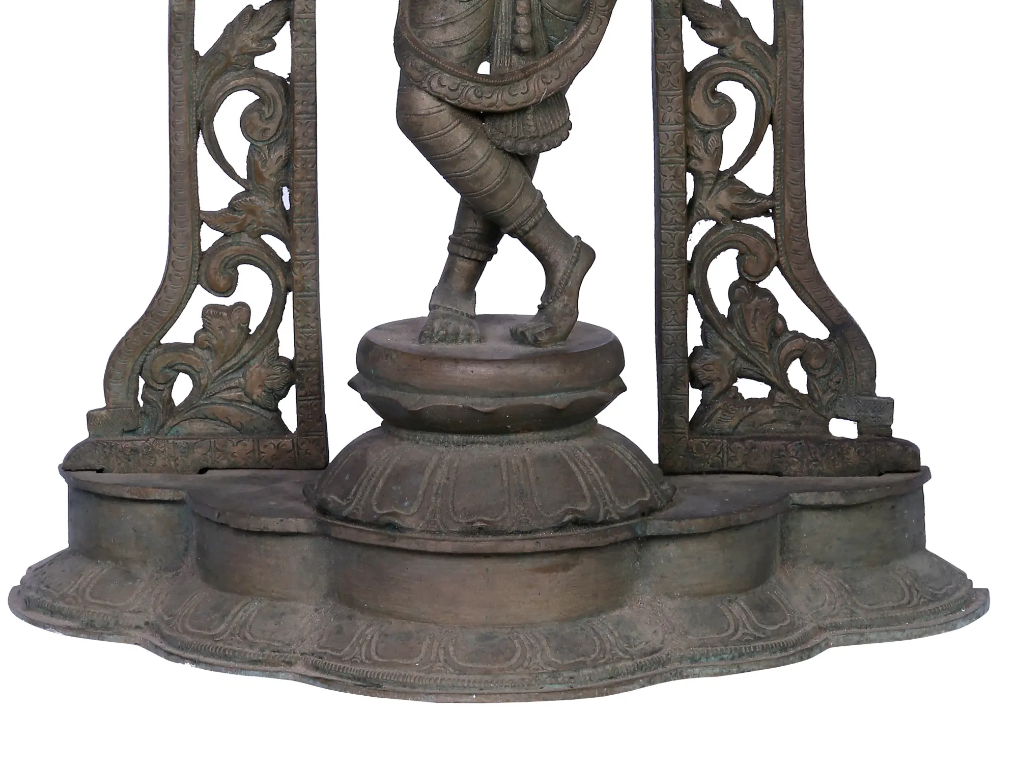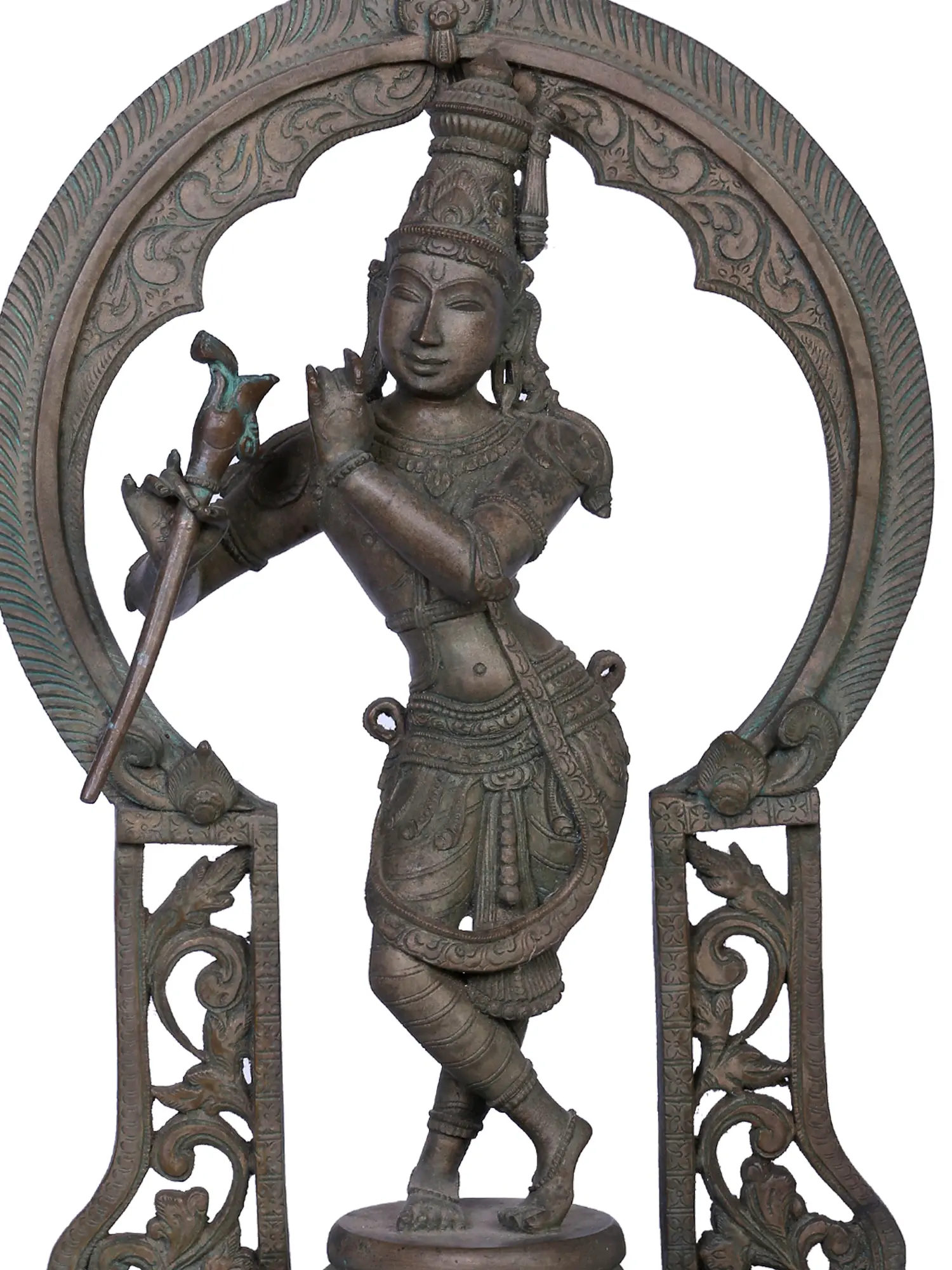 In Indian art tradition, Tribhanga Murari, or triple bent fluting Krishna is the pinnacle of divine charm and beauty. With his heavenly form gently balanced on one foot as the other bends to create an enchanting posture, Krishna in this Panchaloha statue presents the iconic Tribhanga Murari. The fineness of Tamil Sthapatis is visible in the ornate ornamentation of Krishna- his elongated crown, fine jewelry, delicate dhoti, and long, swaying garland. The movement and stillness of Tribhanga posture, which highlights the grace of human form, is beautifully brought to light by Krishna’s appearance. Enriched by the ambrosia of his beauty, nature blooms in eternal spring, forming a marvelous aureole around the bronze statue, embellished by flowing vines whose suppleness is mesmerically captured in the solid metal by the trained master artists of Swamimalai.