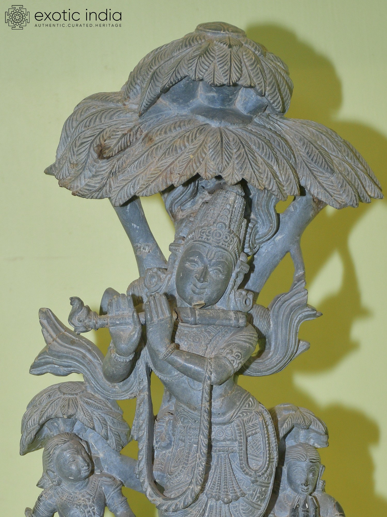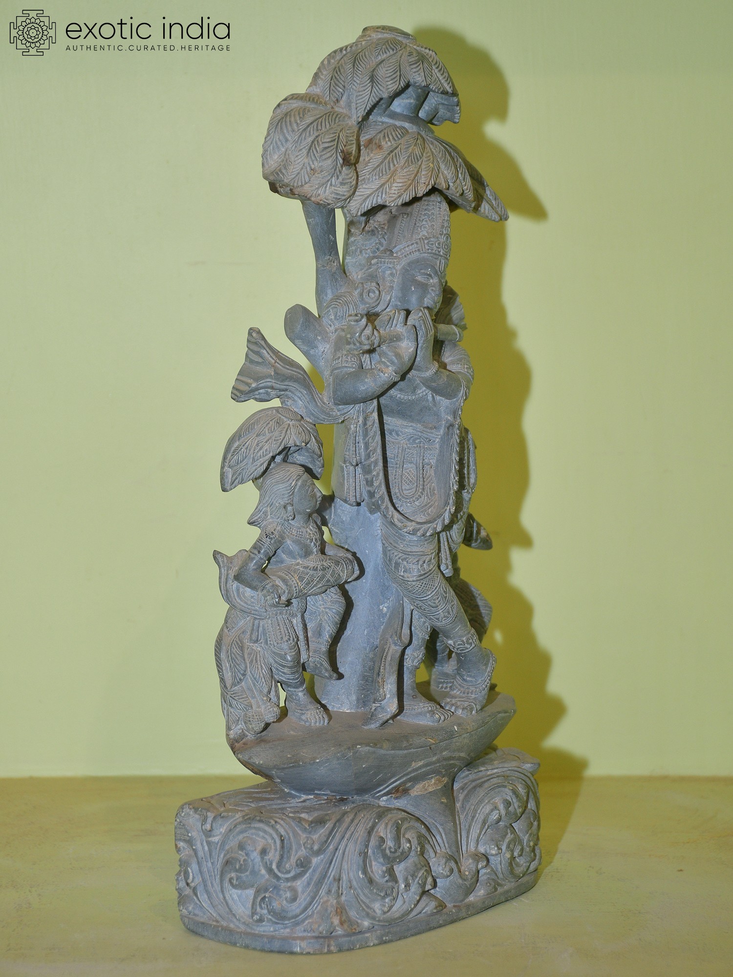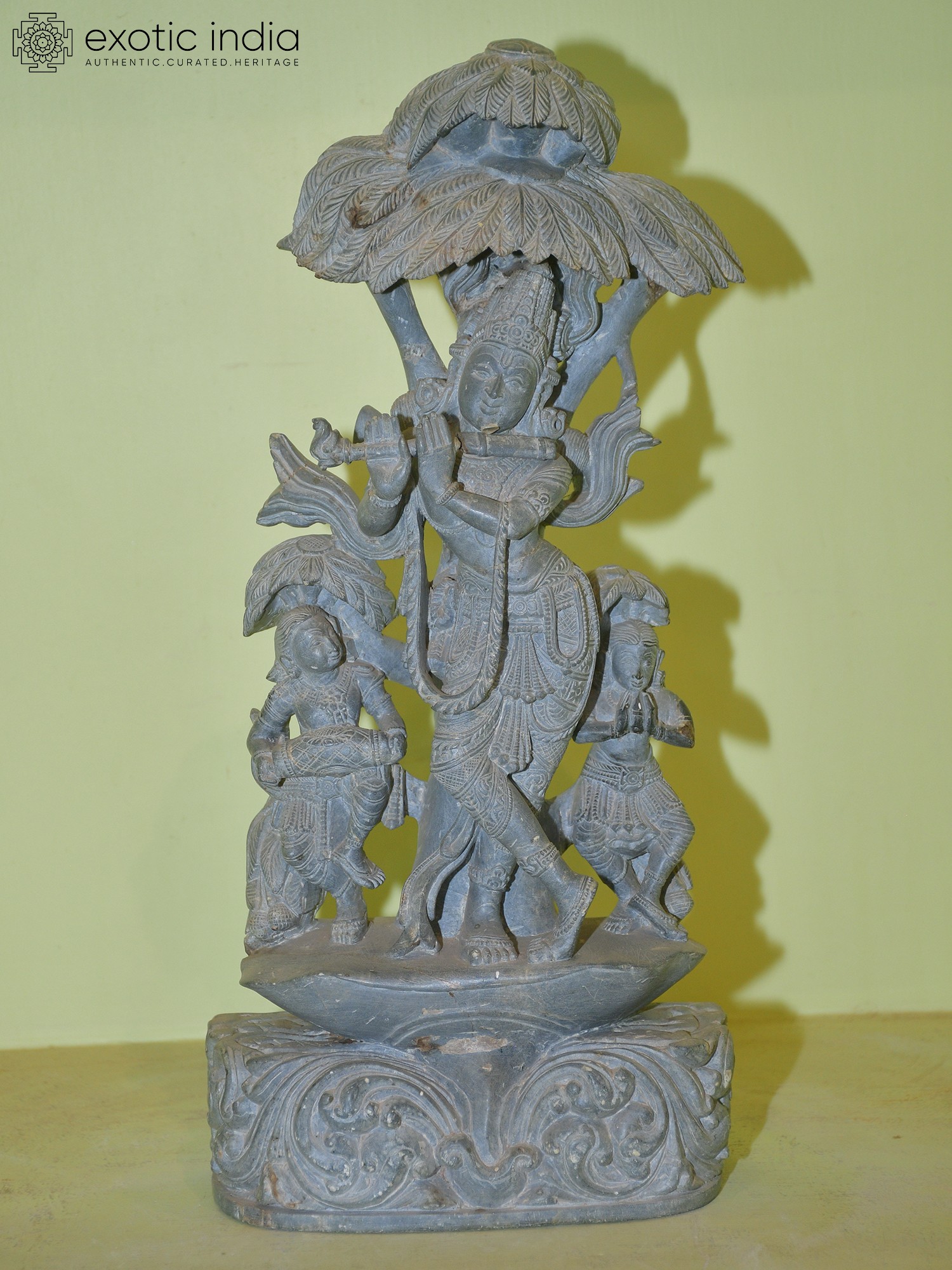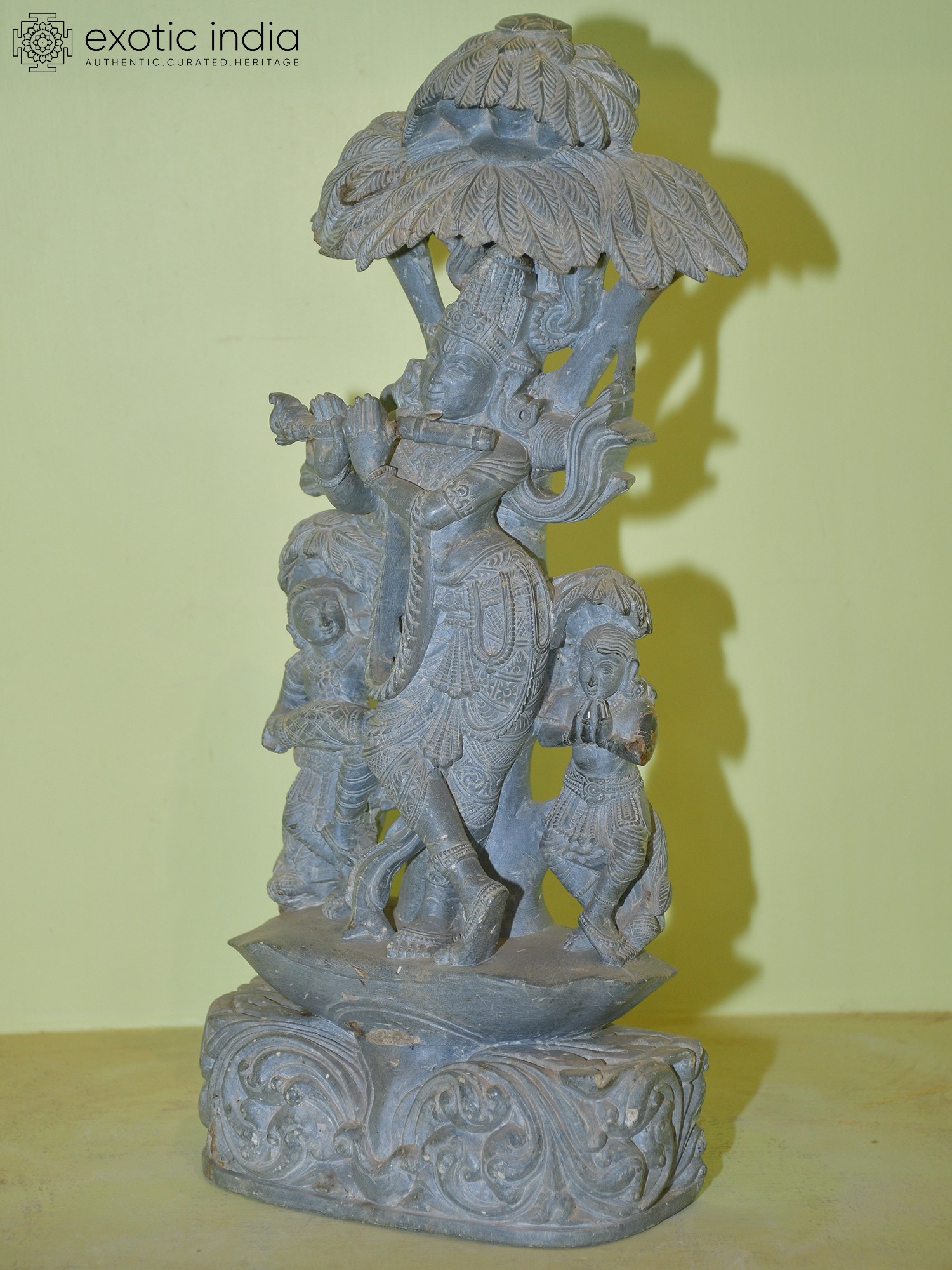 This exquisite stone sculpture captures a timeless moment of divine play, depicting Lord Krishna in his most beloved persona as the divine flautist of Vrindavan. Carved from the rich, earthy tones of Orissa stone, this artwork is a testament to the enduring artistic traditions of India, particularly the intricate stone carving techniques honed in the region. The statue stands at a commanding sixteen inches, its presence commanding a serene yet vibrant energy that draws the viewer into the heart of the sylvan groves of Braja. Lord Krishna, the eighth avatar of Vishnu, is often depicted as a mischievous and charming cowherd boy whose enchanting melodies on his flute, the *bansuri*, captivated the hearts of the *gopis* (cowherd maidens) and the very animals of the forest. This sculpture masterfully portrays that essence, with Krishna's posture fluid and graceful, his eyes conveying a sense of joyous rapture as he brings forth music that transcends the ordinary. The flute is held delicately to his lips, poised to release notes that, according to legend, could soothe any sorrow, inspire devotion, and even make the rivers flow backwards. ––––––––––