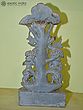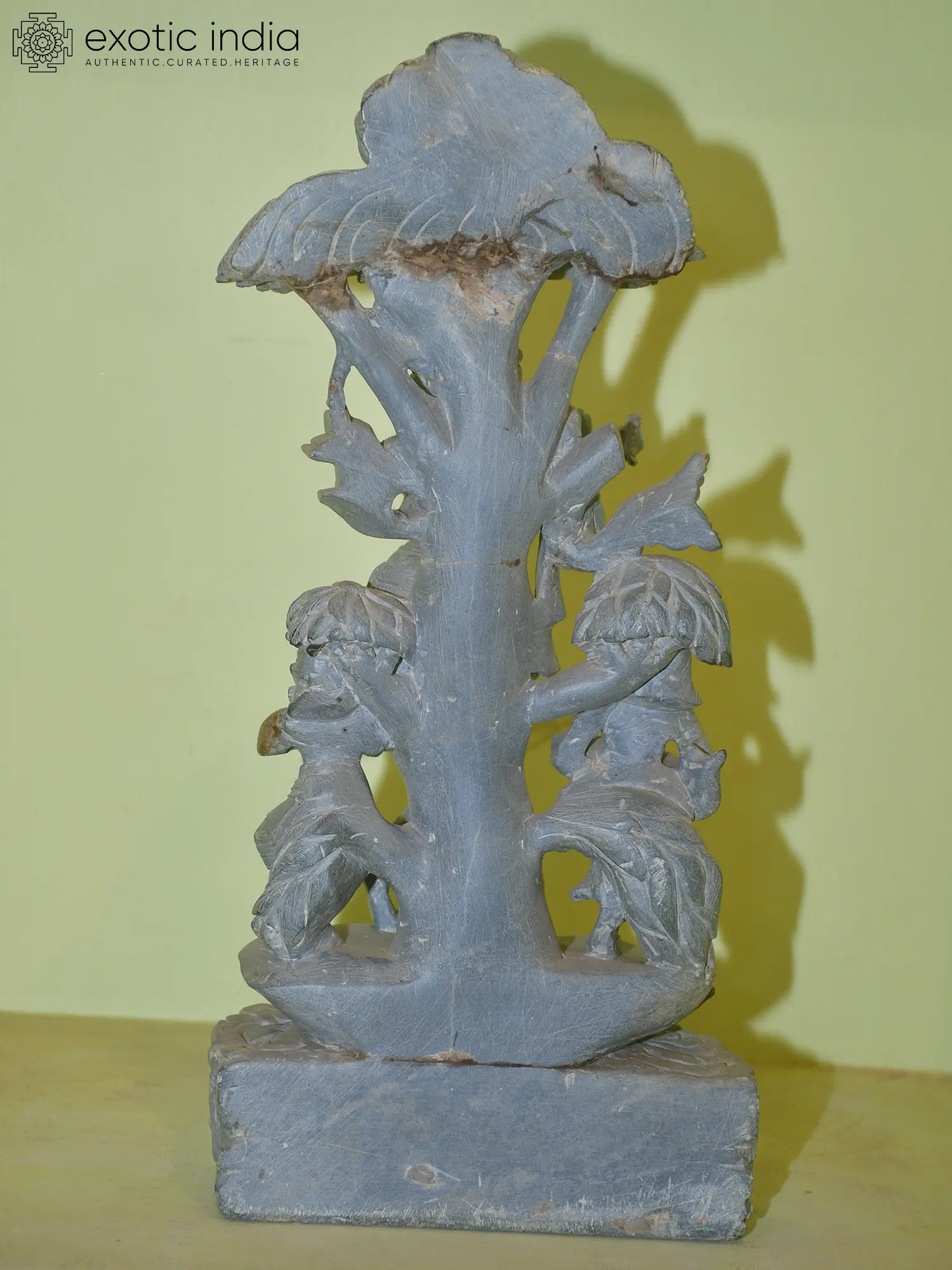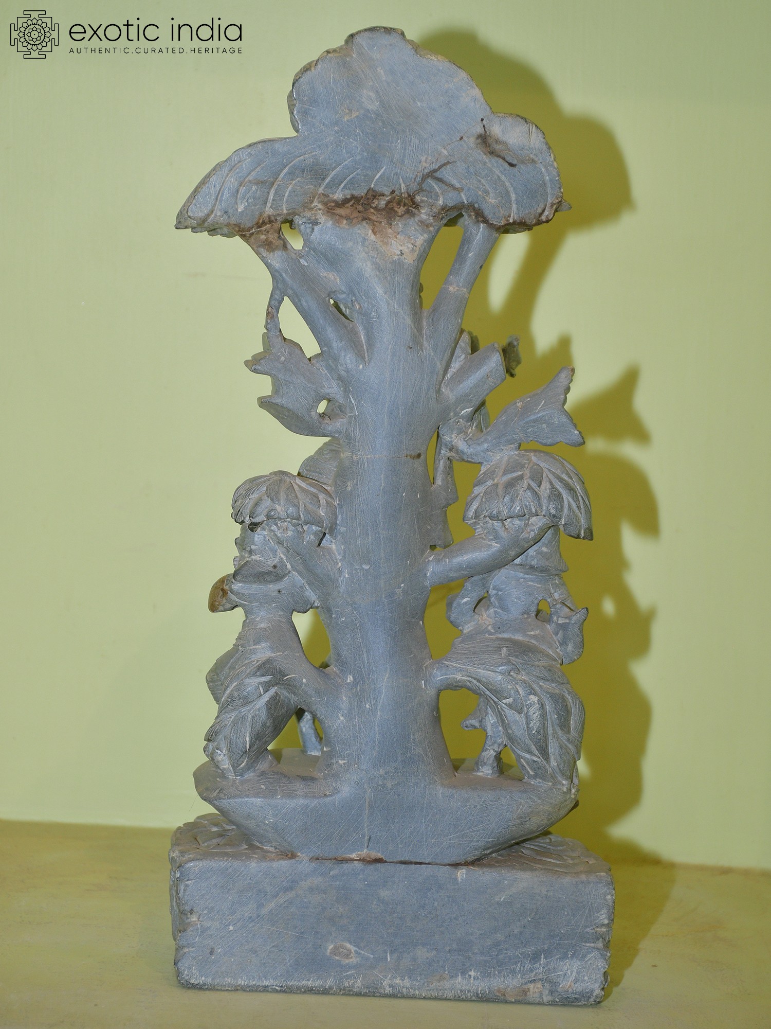Flanking Lord Krishna are two figures, likely representing devoted *gopis* or perhaps celestial attendants, drawn into the divine performance. One figure on the left is depicted playing a drum, her movements suggesting a rhythmic accompaniment to Krishna's melody. The other, on the right, stands with her hands clasped in adoration, her form conveying deep reverence and a sense of being lost in the transcendental sound. The interplay between the figures creates a dynamic tableau, a visual representation of the spiritual ecstasy that Krishna's music evoked, a phenomenon known as *kirtan* – the ecstatic chanting or singing of divine names and glories. The ornate details of their attire, the graceful folds of their garments, and the delicate adornments speak volumes about the skill of the artisan. The entire composition is framed by lush foliage, hinting at the verdant beauty of the sacred forests of Vrindavan where Krishna spent his youth. These trees are rendered with an almost organic sensibility, their leaves intricately carved, adding to the immersive quality of the scene. The base upon which the figures stand is also richly ornamented, reflecting the meticulous craftsmanship that went into every aspect of this creation. This statue is more than just an idol; it is a portal to a spiritual realm, a tangible manifestation of devotion and divine love that has resonated through centuries of Indian culture and belief. It brings with it the spirit of ancient tales, of a divine being whose earthly sojourn was marked by unparalleled charm, profound wisdom, and the sweet, soul-stirring music of his flute.