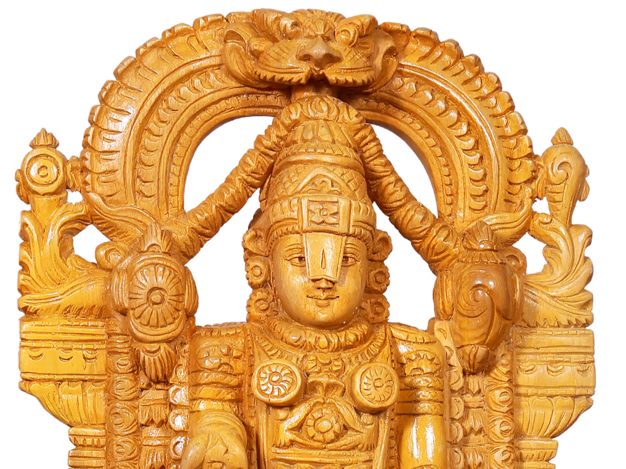 Placing this Lord Tirupati Balaji idol in your home is believed to attract good fortune, remove obstacles, and bestow peace and prosperity. It serves as a constant reminder of devotion, a source of spiritual solace, and a beautiful work of art that embodies divine blessings. Whether as a gift for a loved one or a cherished addition to your personal sacred space, this wooden statue of Lord Tirupati Balaji is sure to inspire awe and reverence. Its enduring beauty and spiritual resonance make it a truly special piece for any devotee or admirer of Indian art and culture.