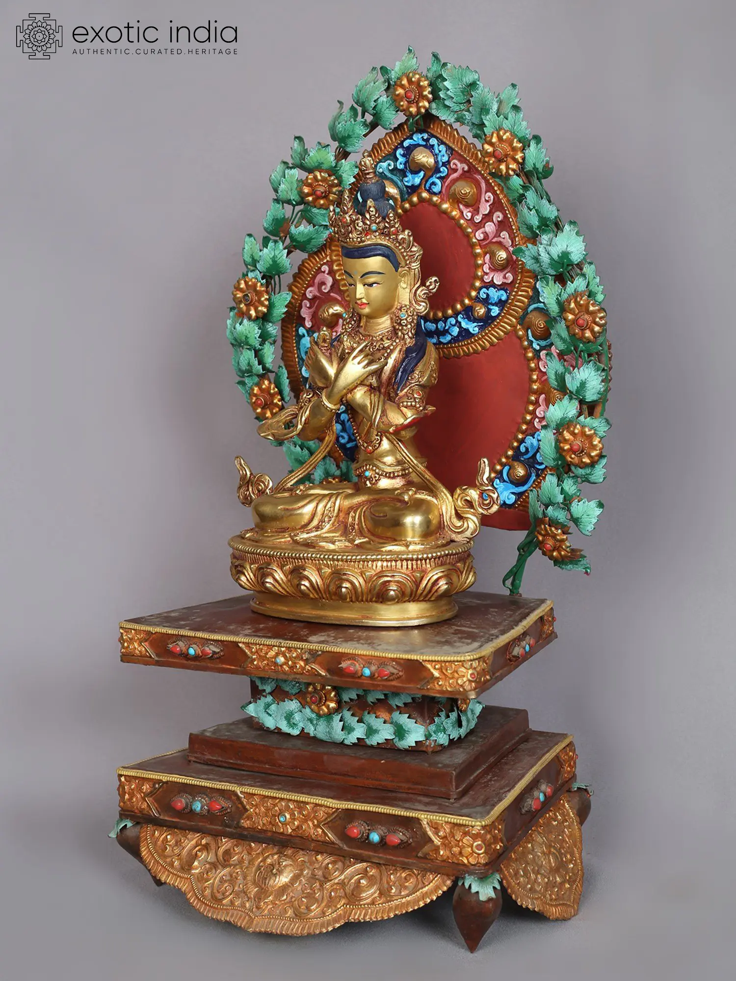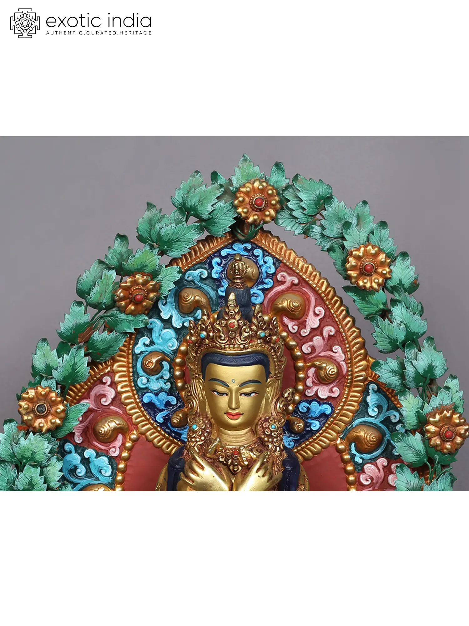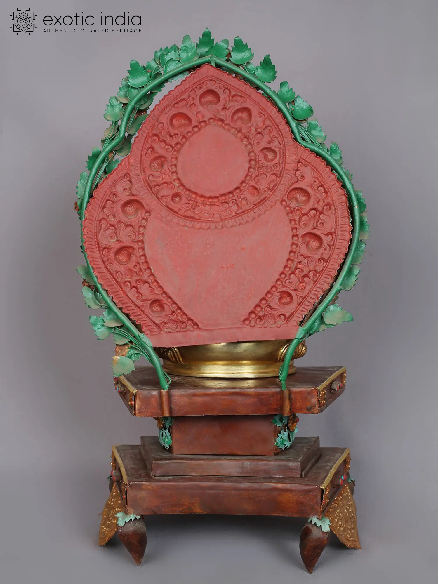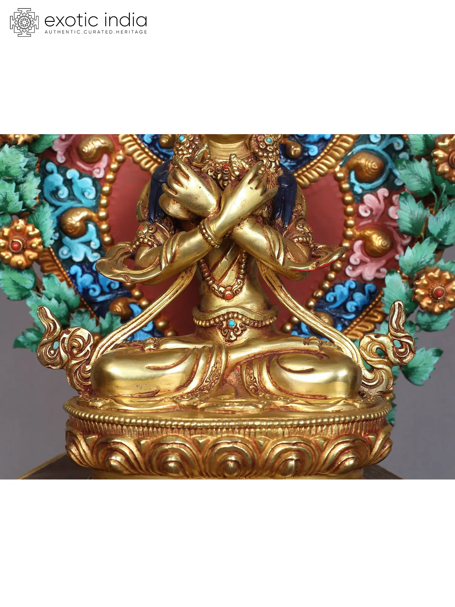 Adorned with resplendent gold jewelry, including earrings, necklaces, bracelets, anklets, and a girdle, all in shades of blue and red, Vajradhara radiates opulence. Seated in the vajra posture with interlocked legs, he rests upon a moon disc and a lotus pedestal.