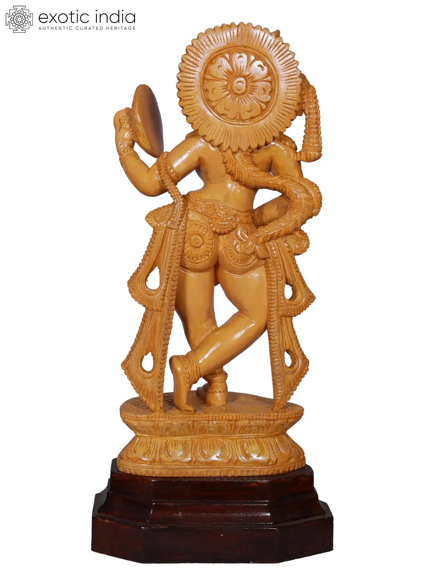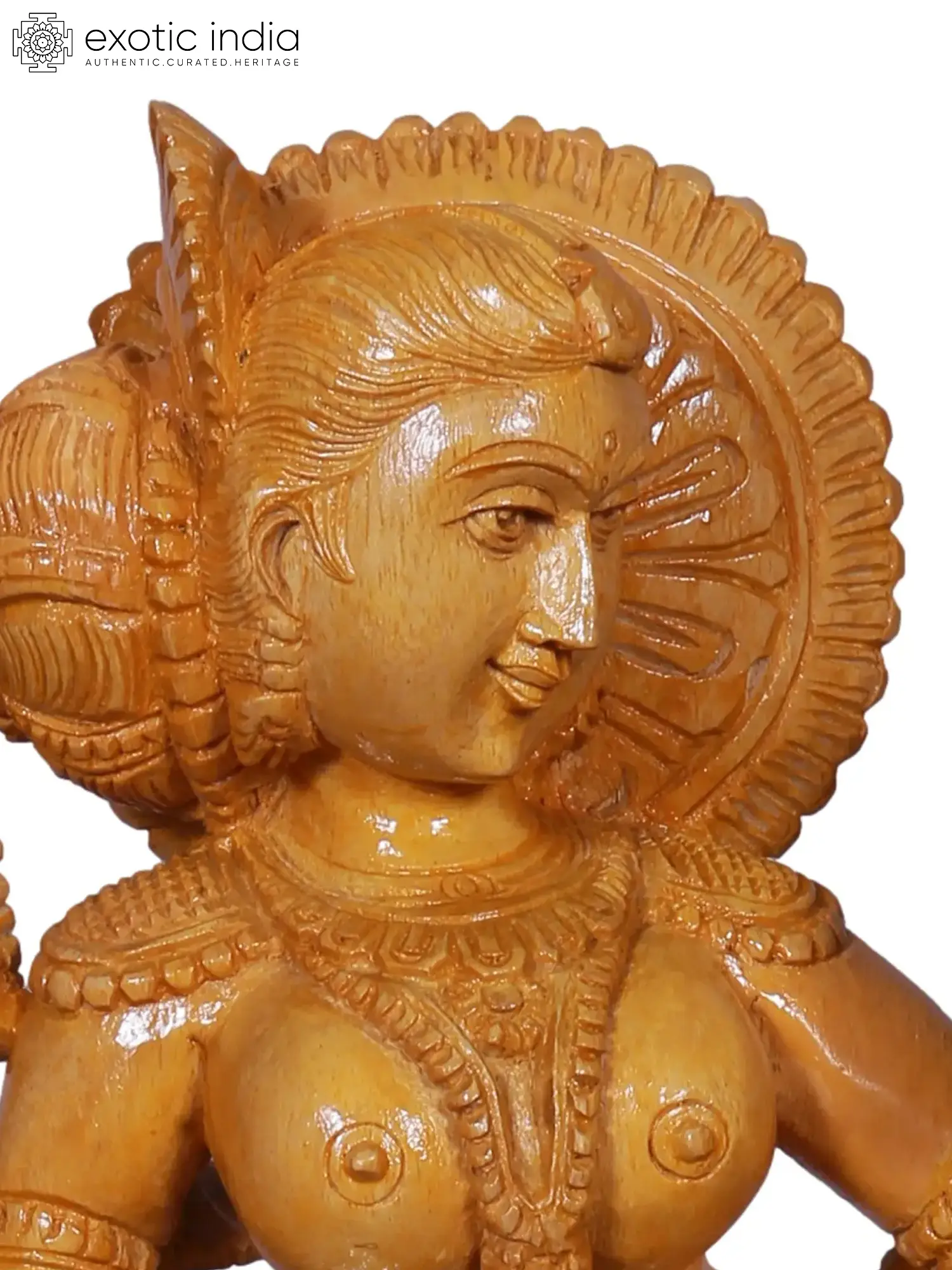 This Madanika Staring at Mirror is a wooden statue that is a tribute to the image of Madanika from the temples of Belur. The statue is depicted in wood and carries a natural tone. The stylized depiction of the Madanika forces the beholder to keep thinking about the marvelous craftsmanship of Indian artists and the beauty of the temples of India.