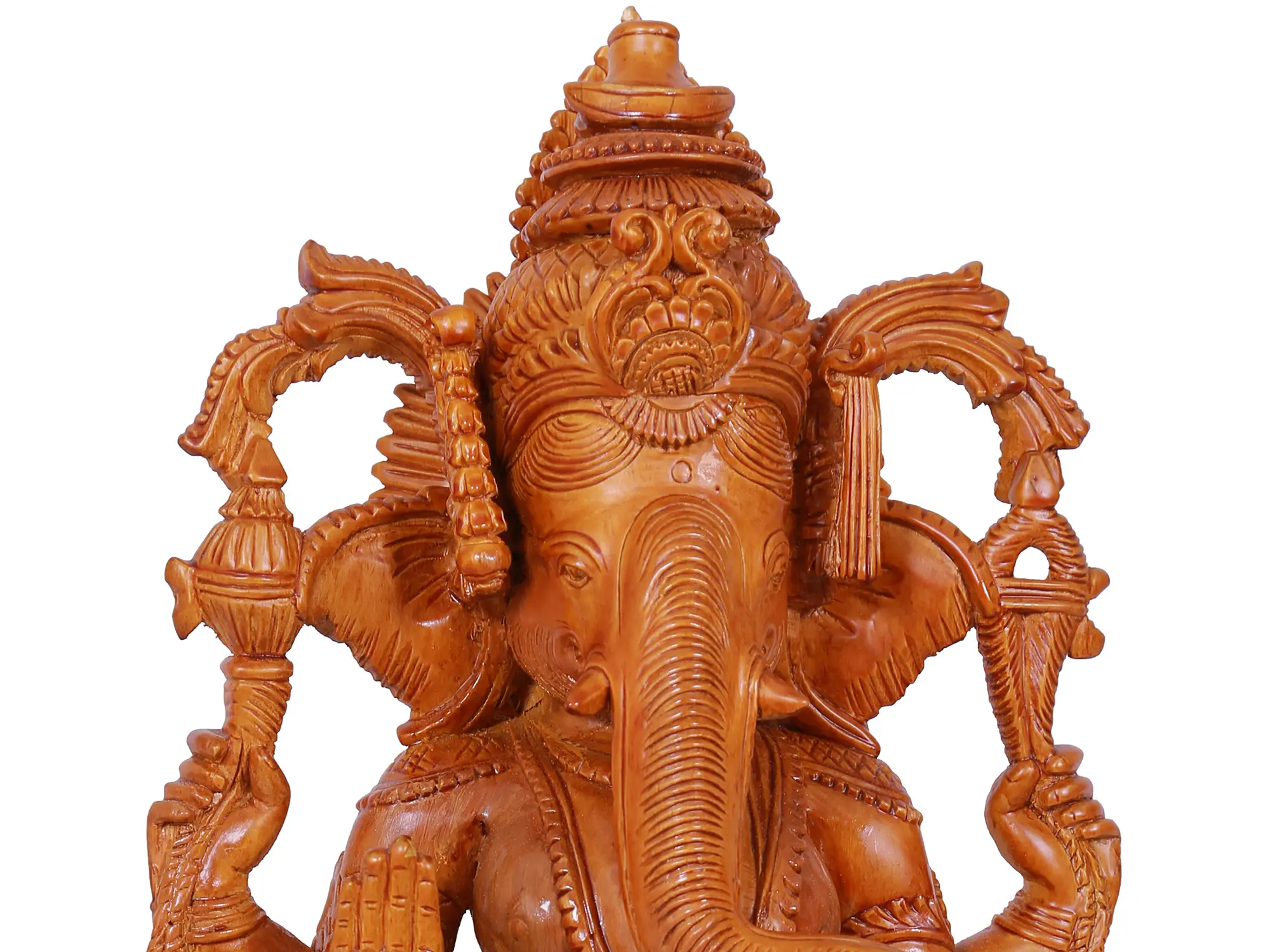 In this sculpture, carved from the purest white wood, Chaturbhuja Lord Ganesha, the lord of wisdom and auspicious beginnings, captivates hearts with his divine elegance. As he sits in the graceful “Utkutakasana” pose, his divine presence exudes an aura of serenity and power. His right hand, adorned with a “Discus”, symbolises the cosmic cycle, while his upper left hand holds a “Noose”, a gentle reminder of life’s complexities. With a benevolent gaze, his front right hand offers blessings, bestowing hope and solace. In his lower left hand, a modak, the sweet delight, represents earthly pleasures. This sacred sculpture breathes life into the sublime essence of Lord Ganesha, a tribute to devotion and craftsmanship.