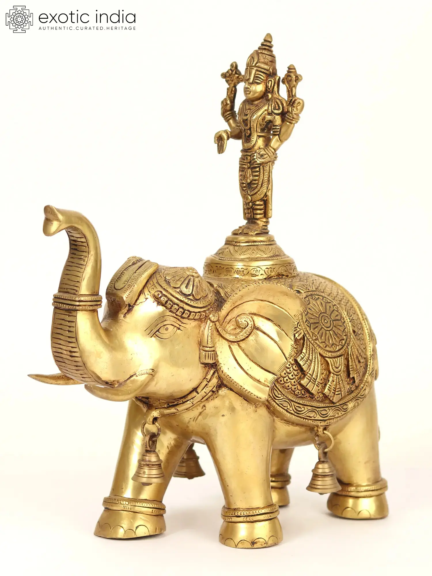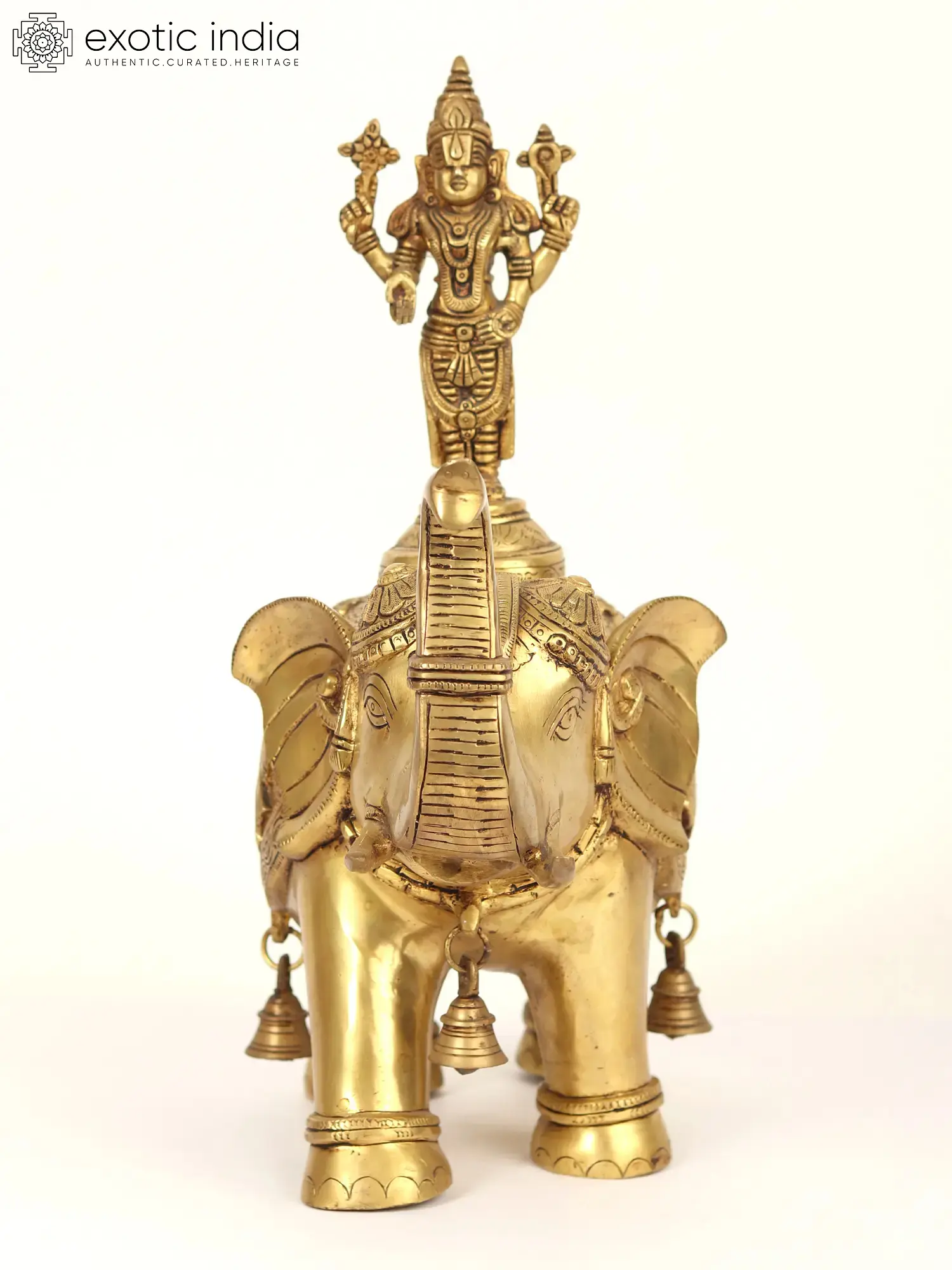 Lord Tirupati Balaji, a manifestation of Lord Vishnu, stands tall and dazzling atop an elephant in this brass statue. His appearance, adorned with beautiful jewellery and magnificent clothes, conveys compassion, calmness, and divine authority. With his right hand lifted in blessing and his left hand resting on his waist, he bestows love, protection, and fulfilment of desires on his believers. The elephant's back is also adorned with an excellent Sudarshan Chakra design. The depiction of an elephant carrying Lord Tirupati Balaji represents his patronage of good luck, protection, and prosperity, which is typically associated with an elephant with an upright trunk. An elephant is also directly associated with the characteristic of leadership hence making this brass statue an epitome of power and victory.