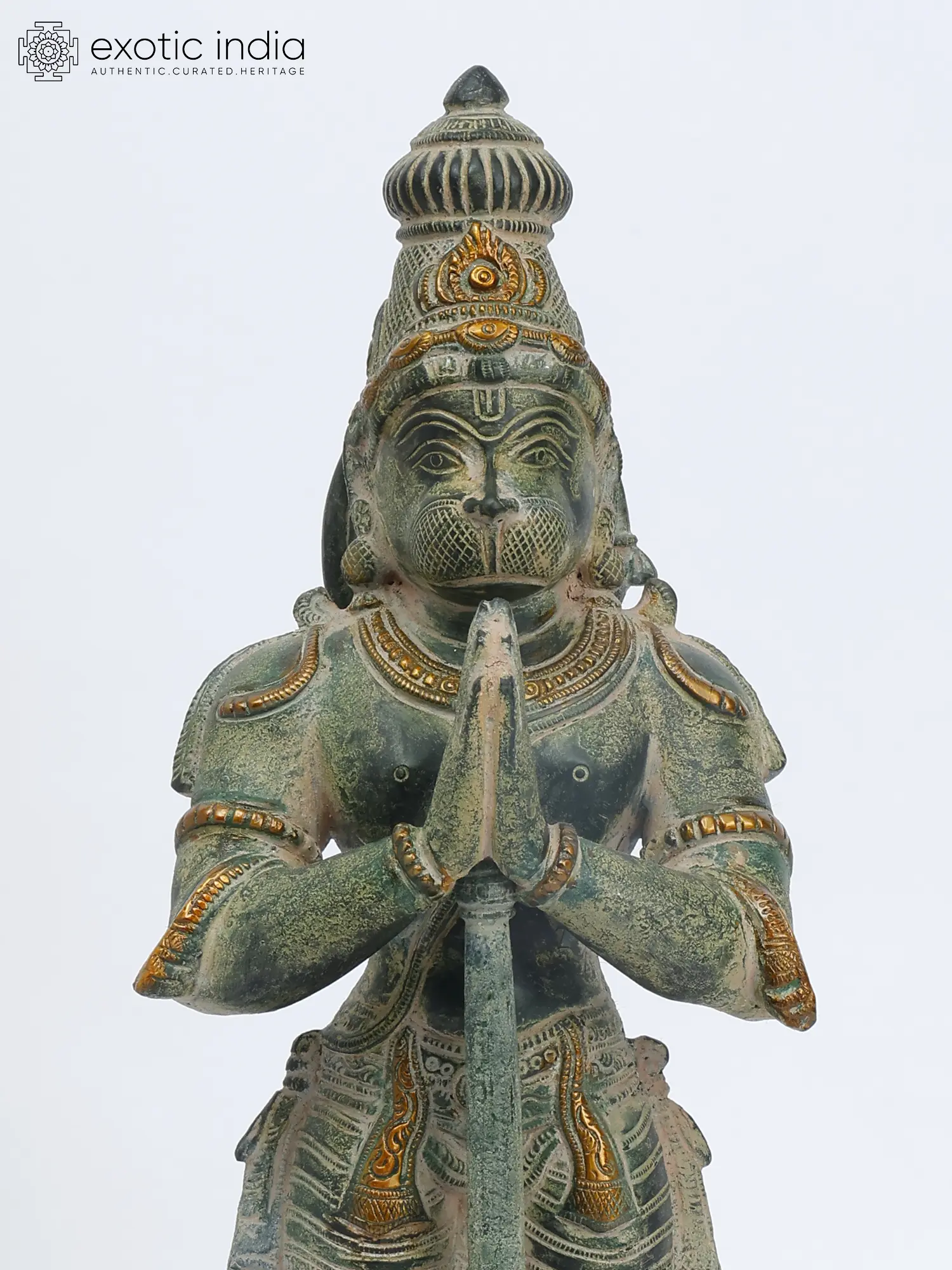 The Standing Hanuman Brass Idol, meticulously handcrafted in India, portrays Lord Hanuman in all his glory. Hanuman, the symbol of devotion and unwavering loyalty, stands tall. His uplifted mace signifies strength and his hands pressed together in prayer symbolize devotion.