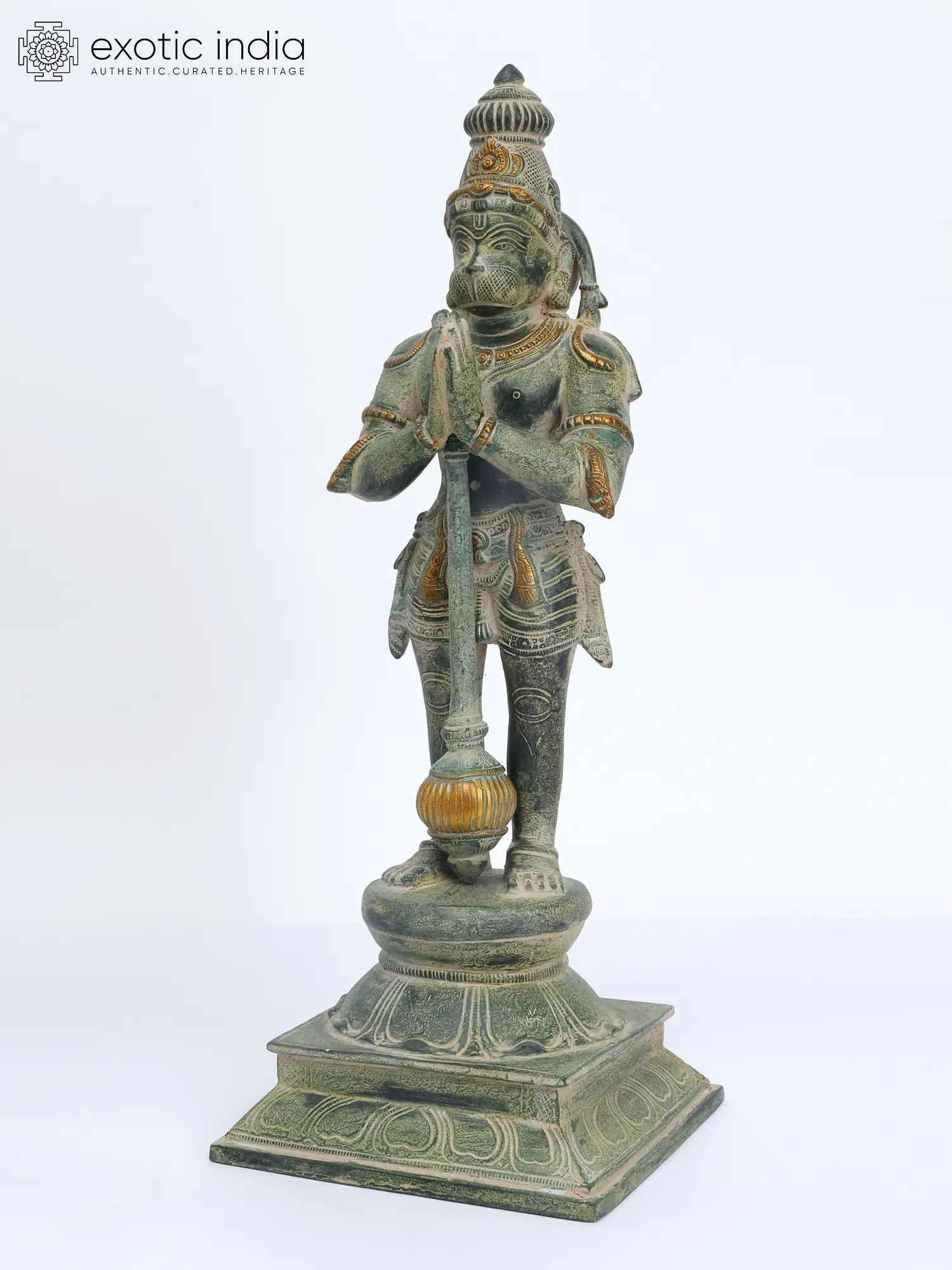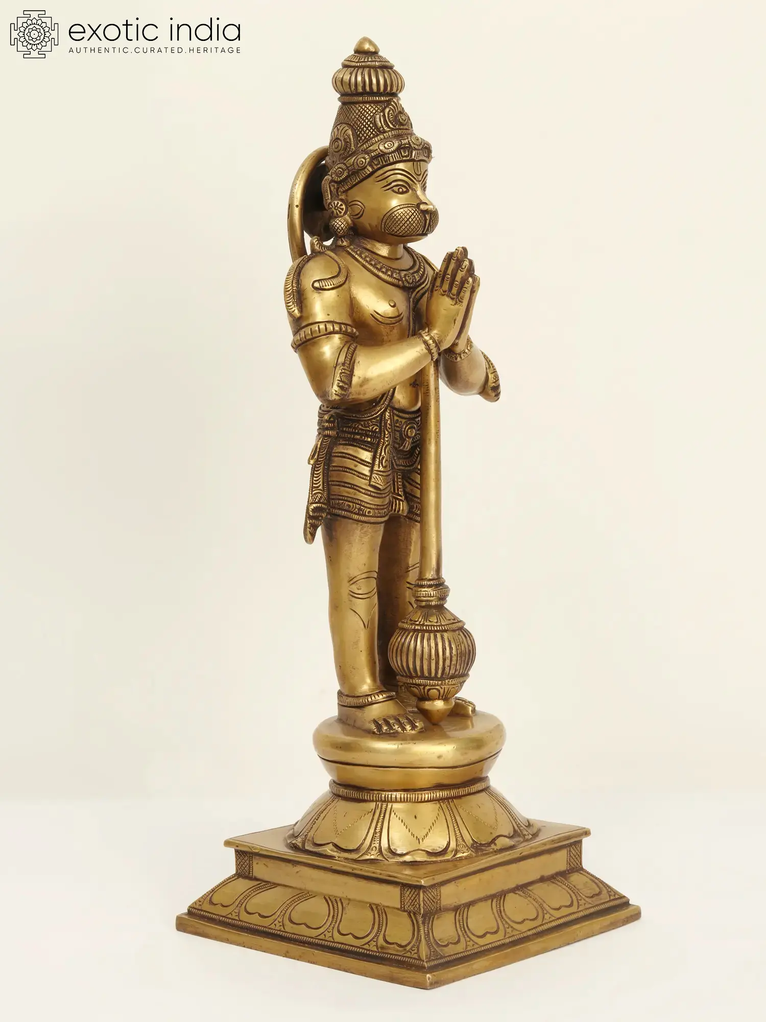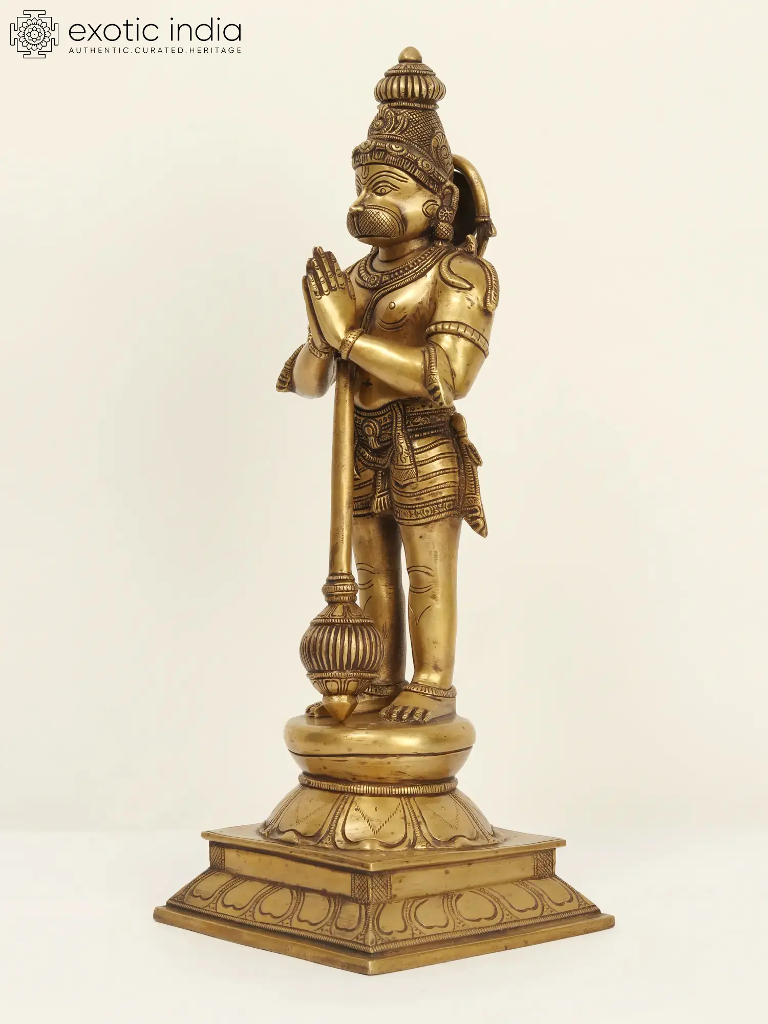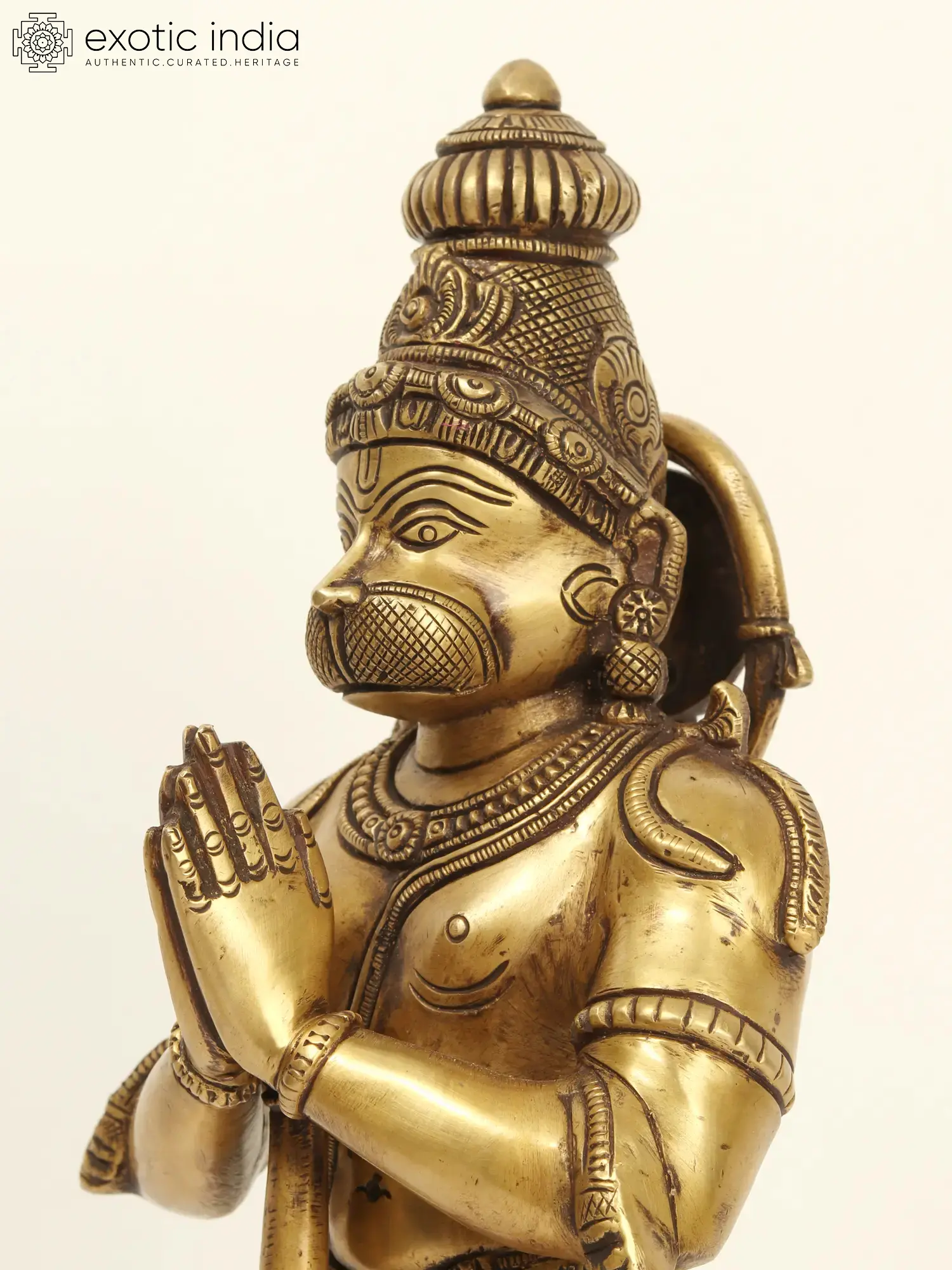 The Standing Hanuman Brass Idol, meticulously handcrafted in India, portrays Lord Hanuman in all his glory. Hanuman, the symbol of devotion and unwavering loyalty, stands tall. His uplifted mace signifies strength and his hands pressed together in prayer symbolize devotion.
