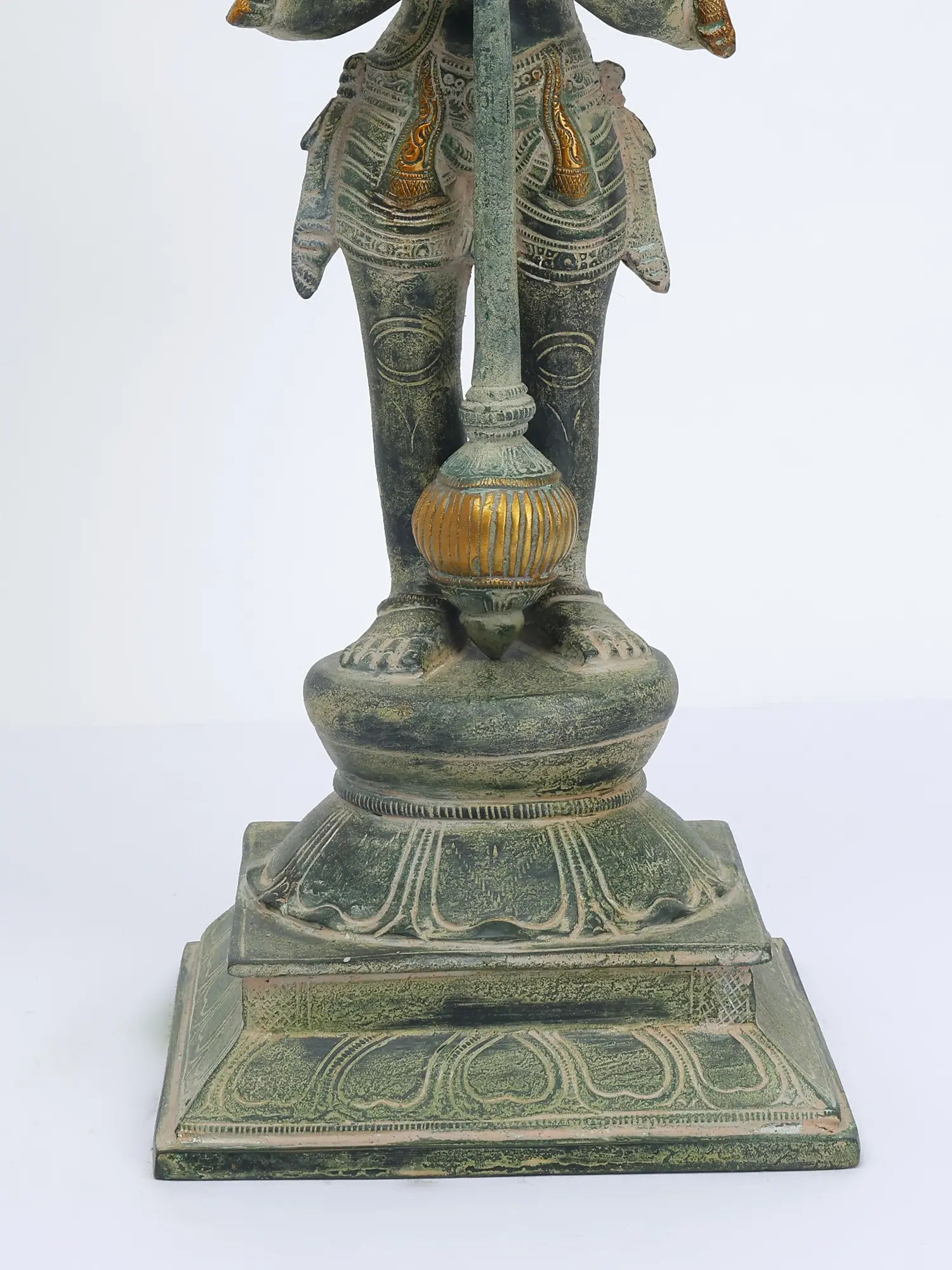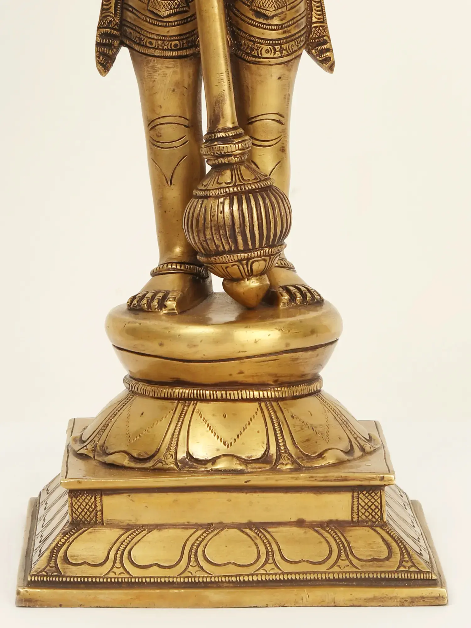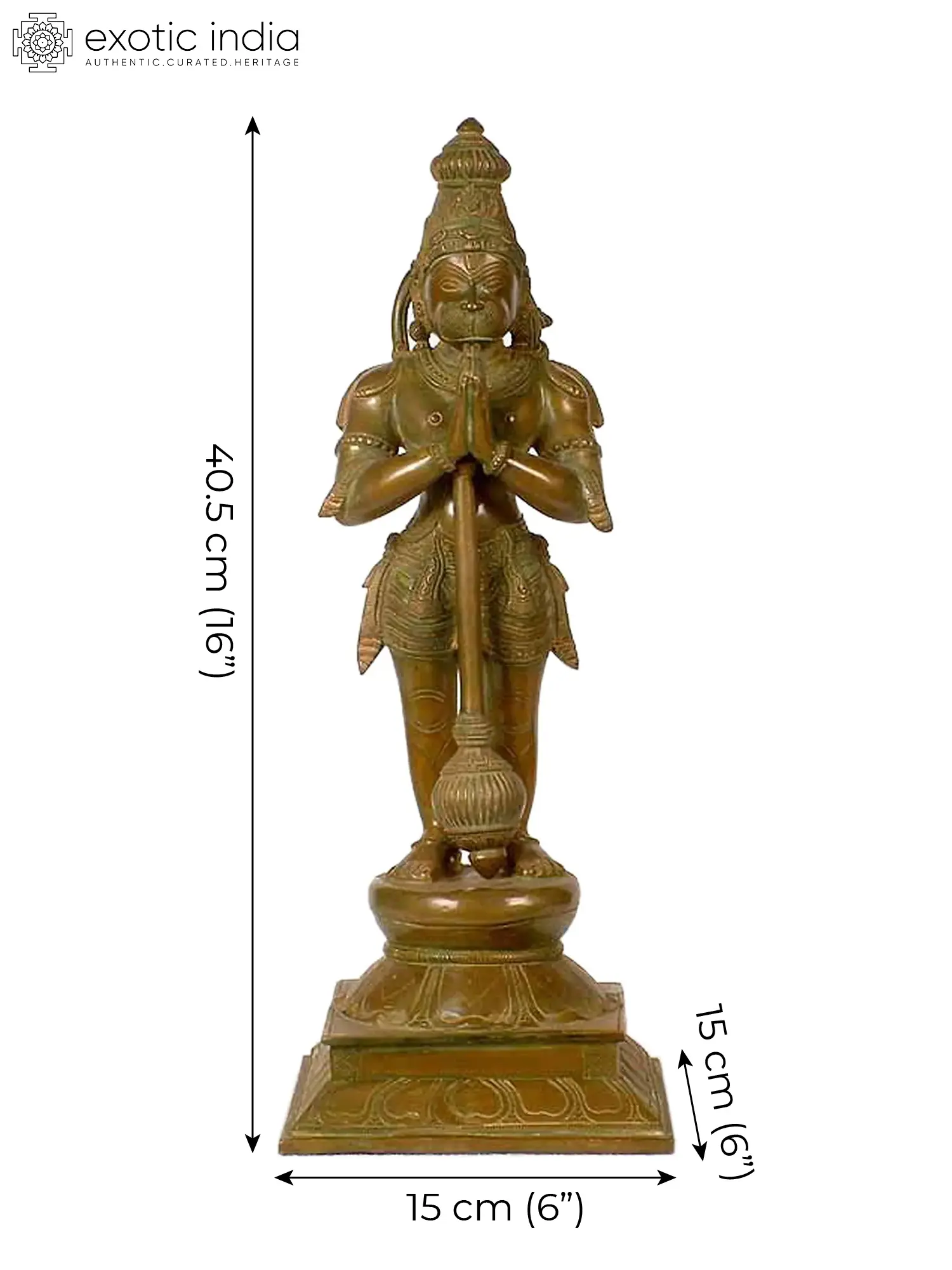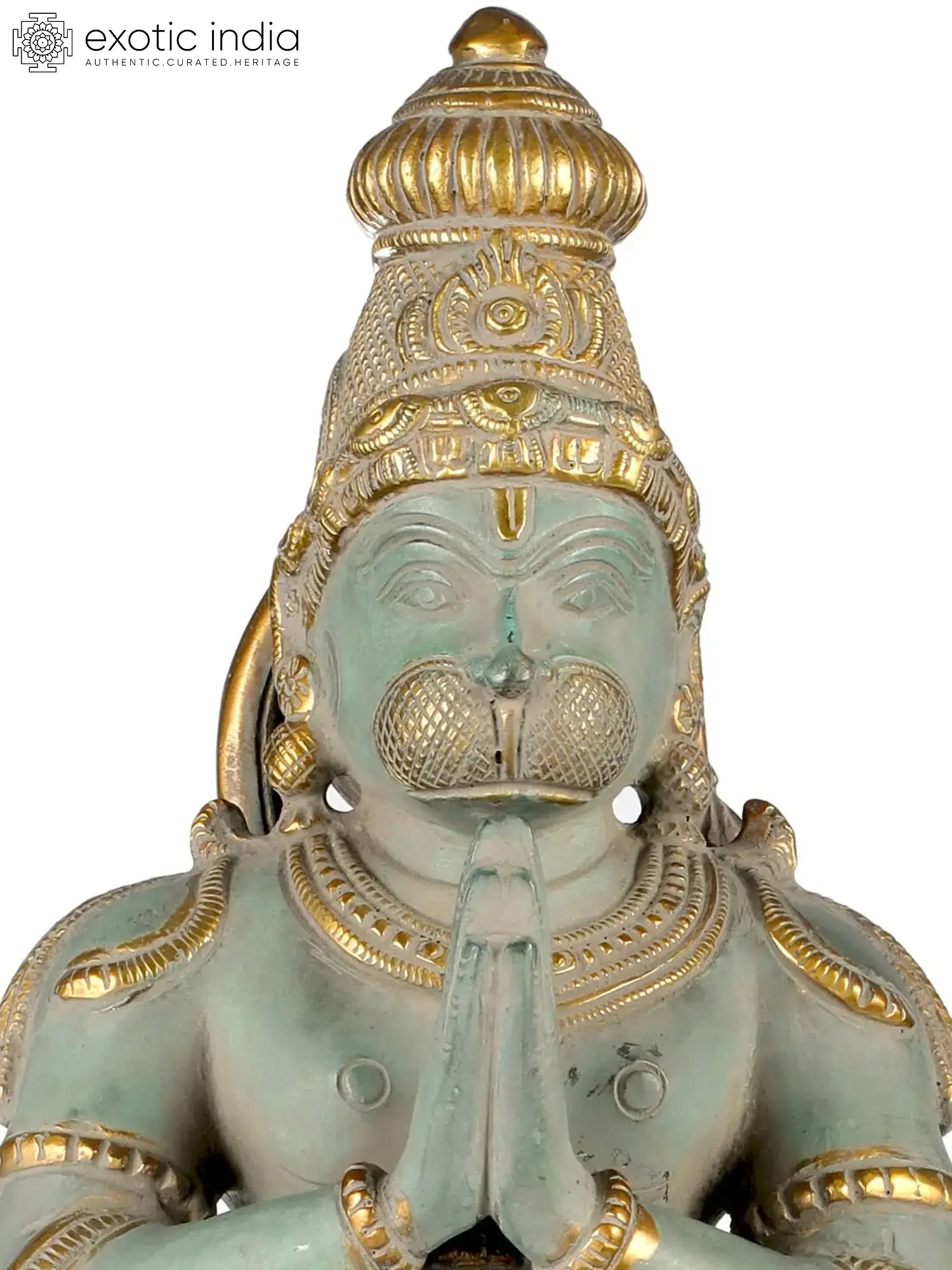 The Standing Hanuman Brass Idol, meticulously handcrafted in India, portrays Lord Hanuman in all his glory. Hanuman, the symbol of devotion and unwavering loyalty, stands tall. His uplifted mace signifies strength and his hands pressed together in prayer symbolize devotion.