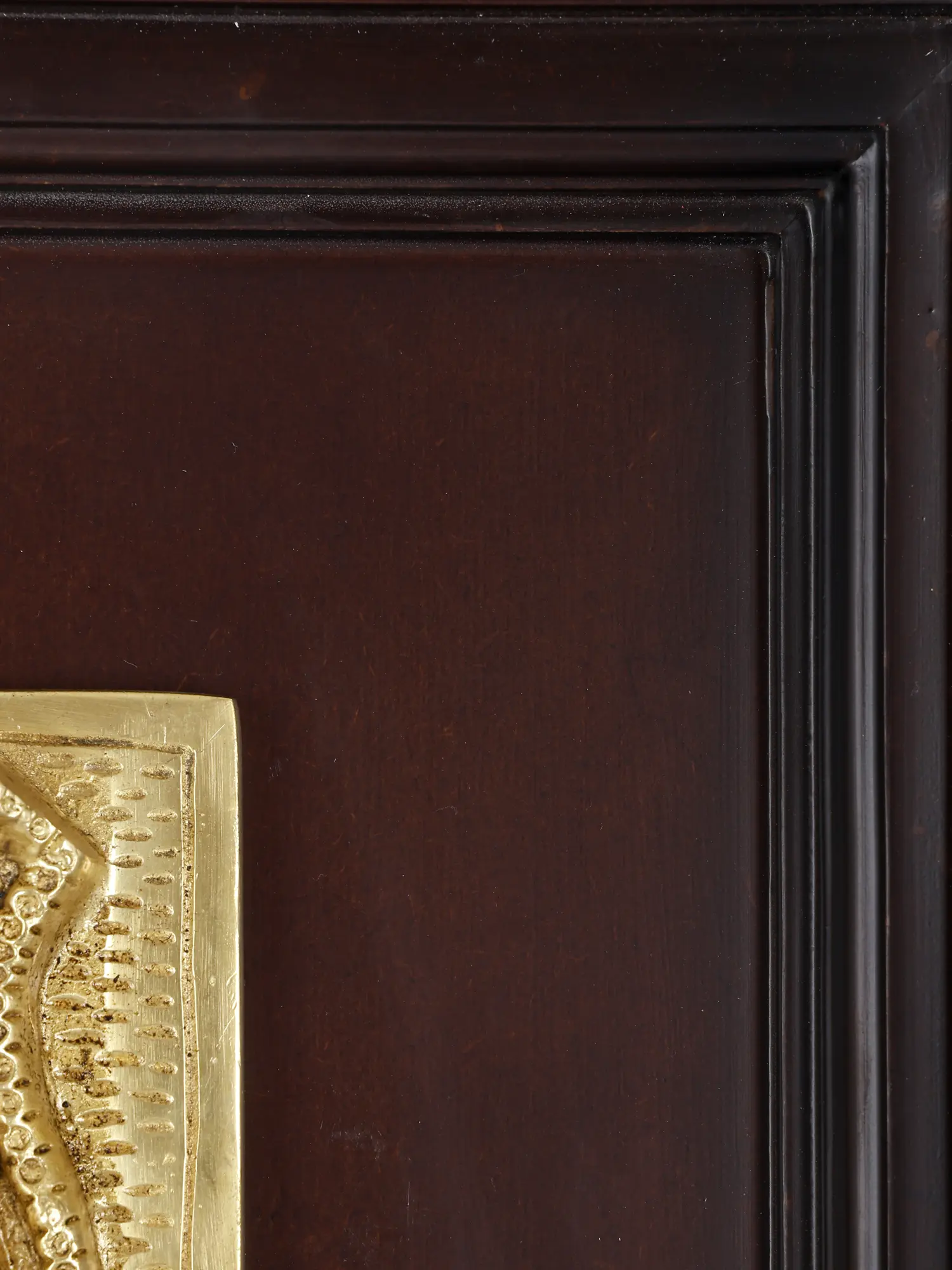 The polished wood frame enhances the brass sculpture, creating a stunning contrast that blends tradition with elegance.