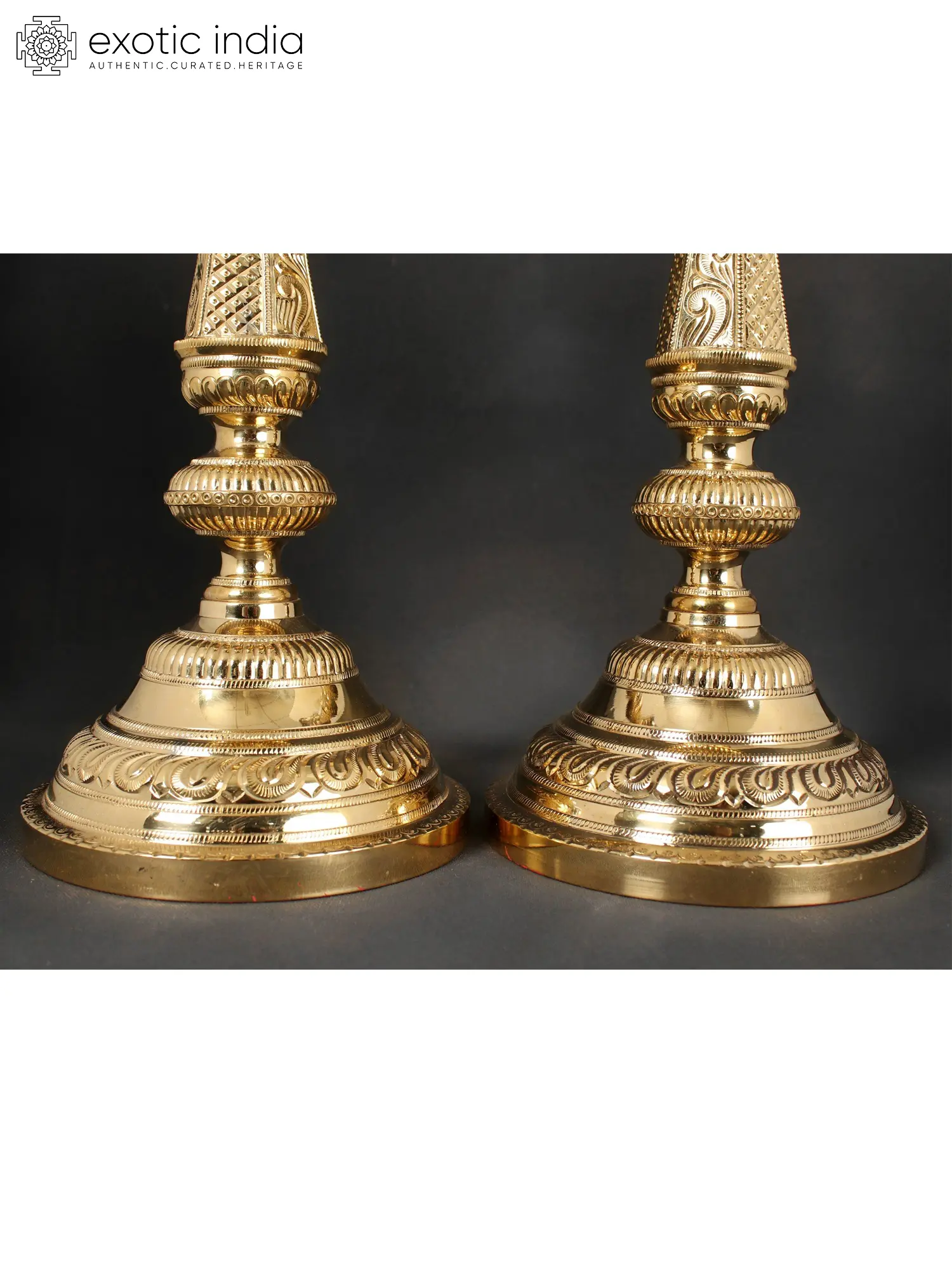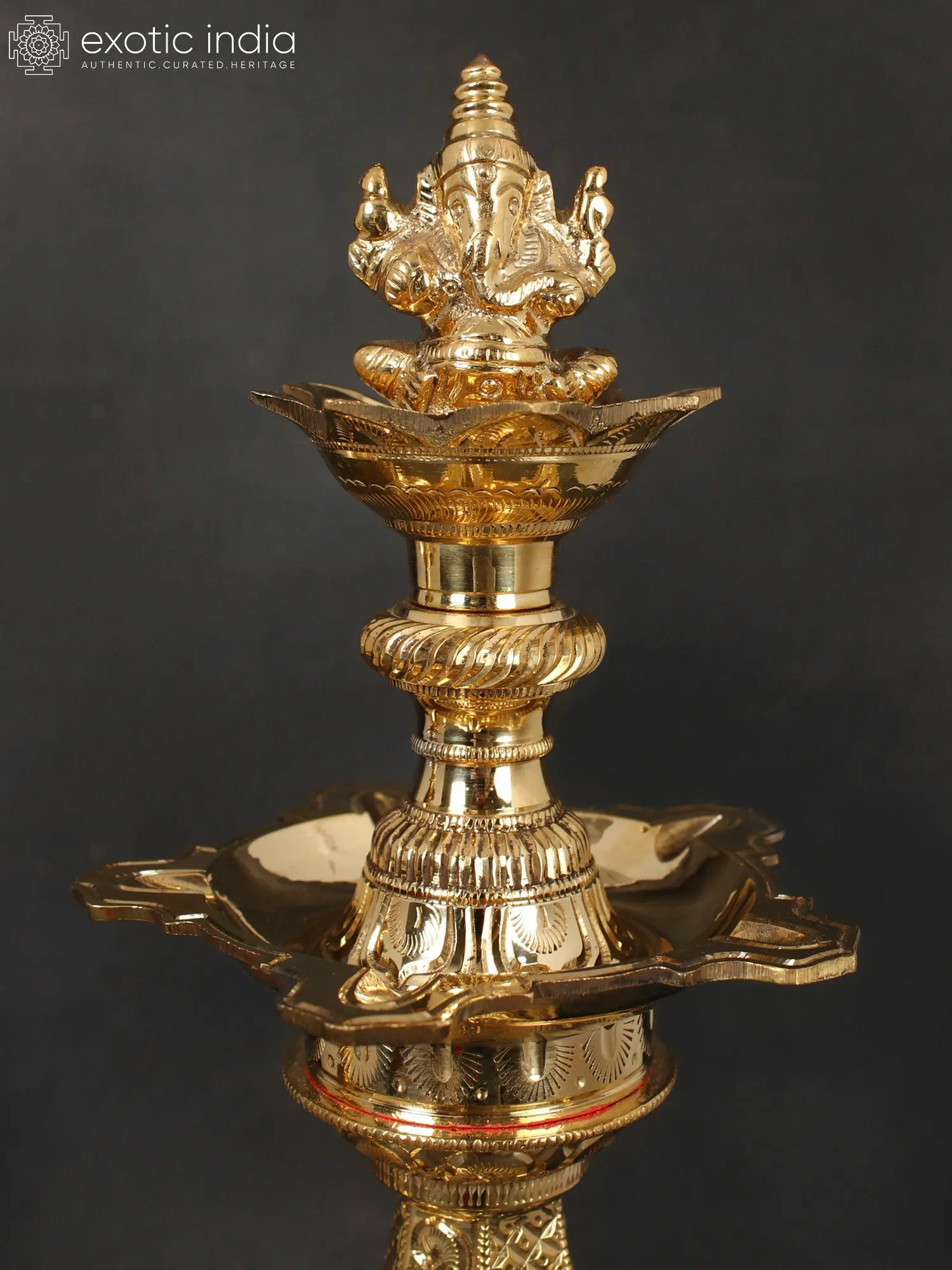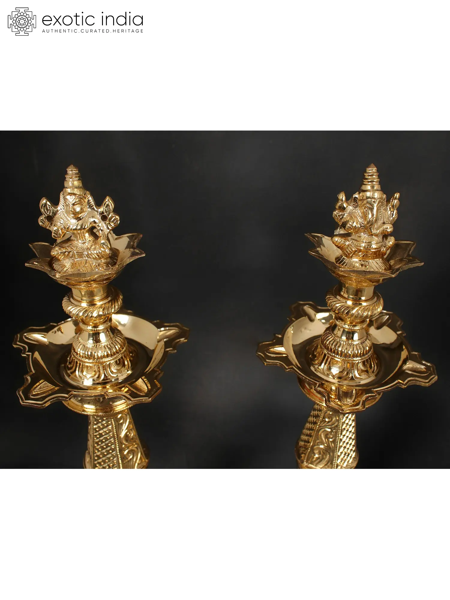Numerous benefits come to the location where Shri Laxmi and Sri Ganesh coexist. With this set of Kuthu Vilakkus, the Dharak or bearers of Shubh (good) and Labh (gain) are brought together. Atop the lights with columns are blessed figures of Laxmi and Ganesha seated on the lotus. They include a five-wick oil basin. The lamp's stand is ornate, with jaali work in the shape of panels. The base is strong and has the customary outward-facing peacock feathers pattern. This beautiful collection of lamps also has a spiritual significance. These lights have traditionally been utilized in temples to improve the aura of the room. They can now be installed in personal worship areas, and devotees can benefit from the holy duo's blessings.