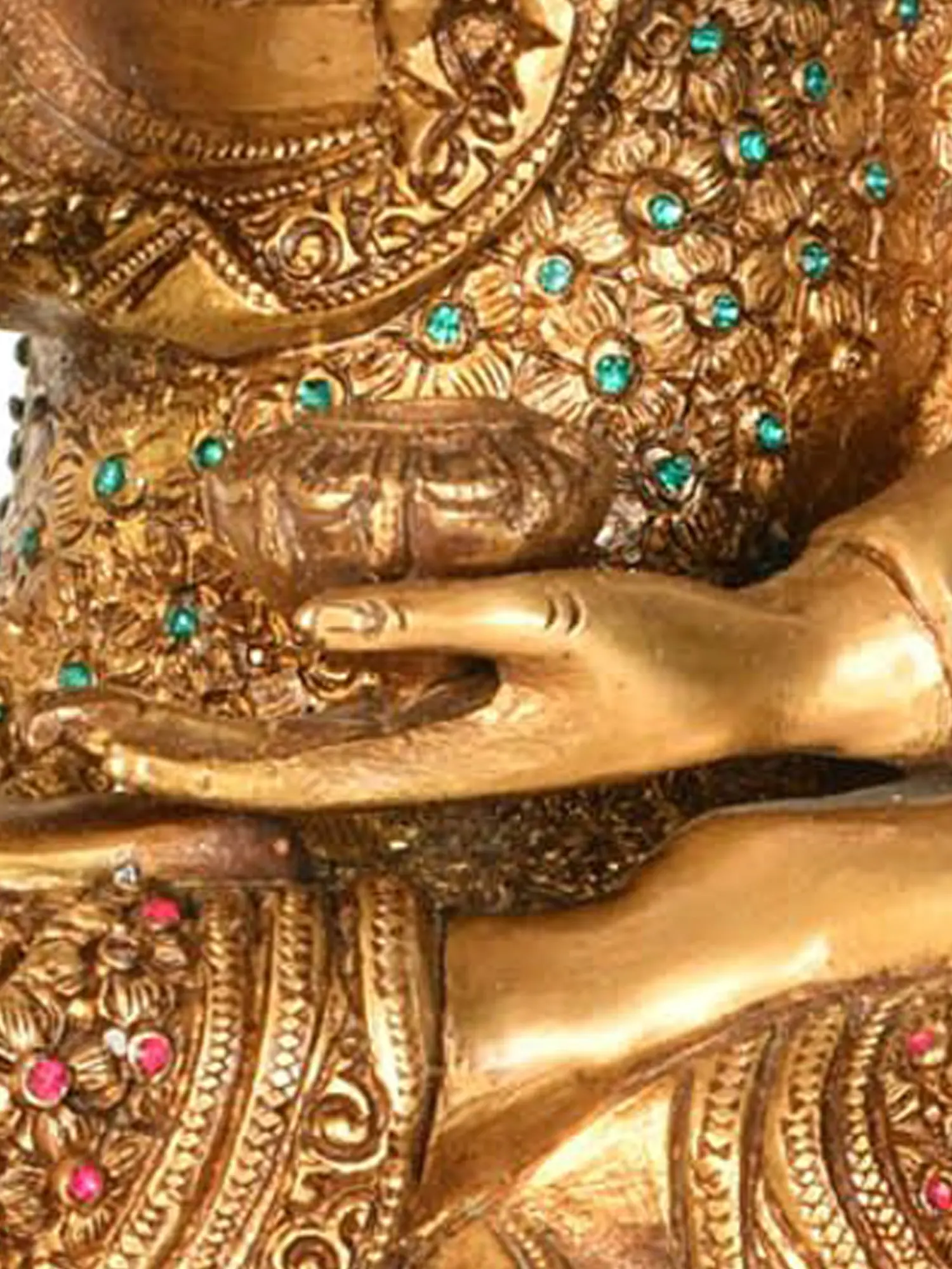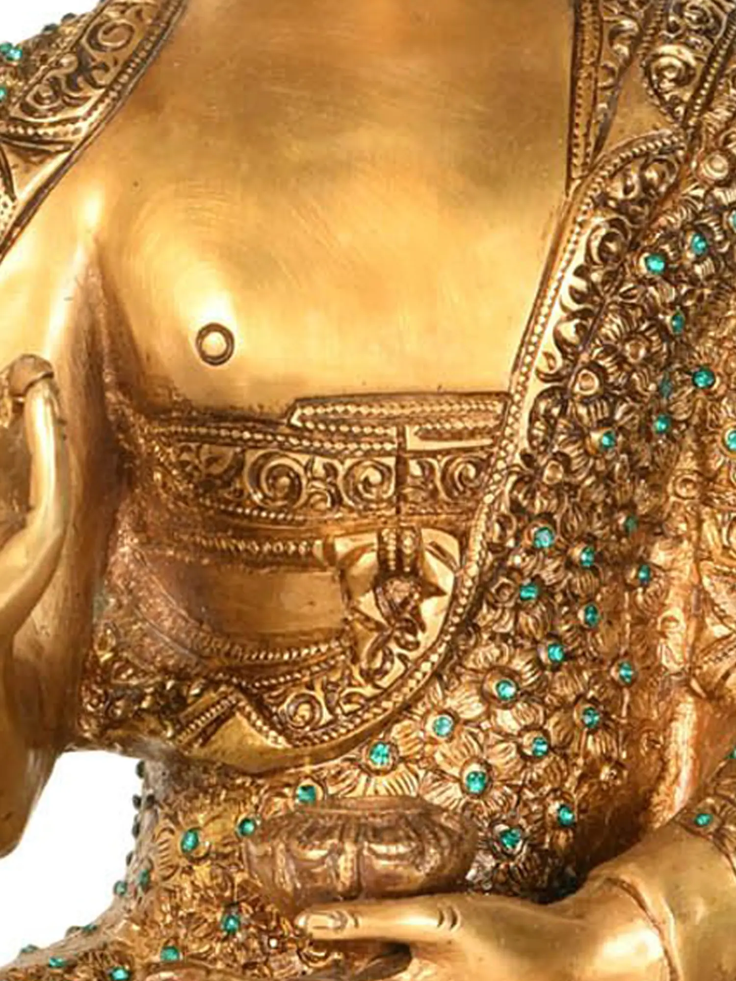 Handmade in India, this statue is a masterful work of art, meticulously crafted from high-quality brass. The intricate inlay work, featuring vibrant stones that glimmer like precious jewels, adorns the Buddha's robes and the lotus pedestal upon which he is seated. The lotus, a powerful symbol in Buddhist tradition, represents purity, enlightenment, and spiritual awakening, rising unstained from the muddy waters of worldly attachments. The rich golden hue of the brass enhances the divine aura of the sculpture, while the detailed embellishments speak to the dedication and skill of the artisans. The meticulous attention to detail extends to the back of the statue, where auspicious mantras are delicately inscribed, adding another layer of spiritual significance and protective energy. These sacred inscriptions are believed to carry blessings and ward off negative influences, further enriching the spiritual resonance of the piece. ––––––––––––––––––