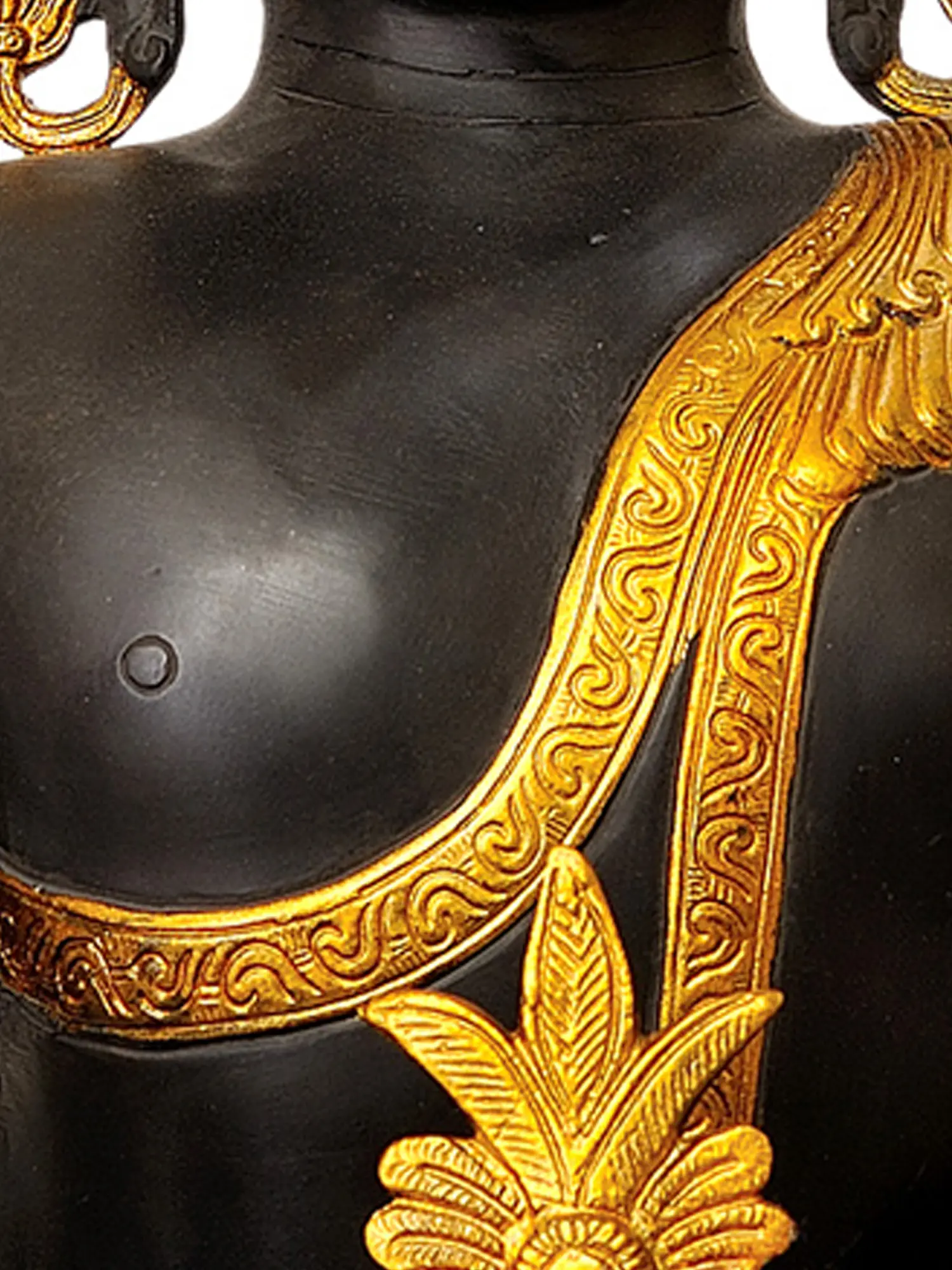 This magnificent brass representation of Bhaishajyaguru, the Medicine Buddha, is a testament to the enduring power of Buddhist art and devotion. Crafted with meticulous detail by skilled artisans in India, this statue embodies the serene presence and profound healing energy of this revered Bodhisattva. Bhaishajyaguru is not merely a deity of physical healing; he represents the dispelling of all forms of suffering, mental anguish, and ignorance. His practice is a potent antidote to the afflictions of the present age, offering solace and liberation. In Buddhist cosmology, Bhaishajyaguru is the leader of the twelve great vows, which he made to help all sentient beings overcome illness and attain enlightenment. Legends speak of him as having twelve epithets, each symbolizing a different aspect of his healing power. He is often depicted in a dark blue or lapis lazuli hue, symbolizing profound wisdom and the boundless sky of consciousness, though this particular rendition features a striking dark patina enhanced with rich gold accents. ––––––––––––––––––––