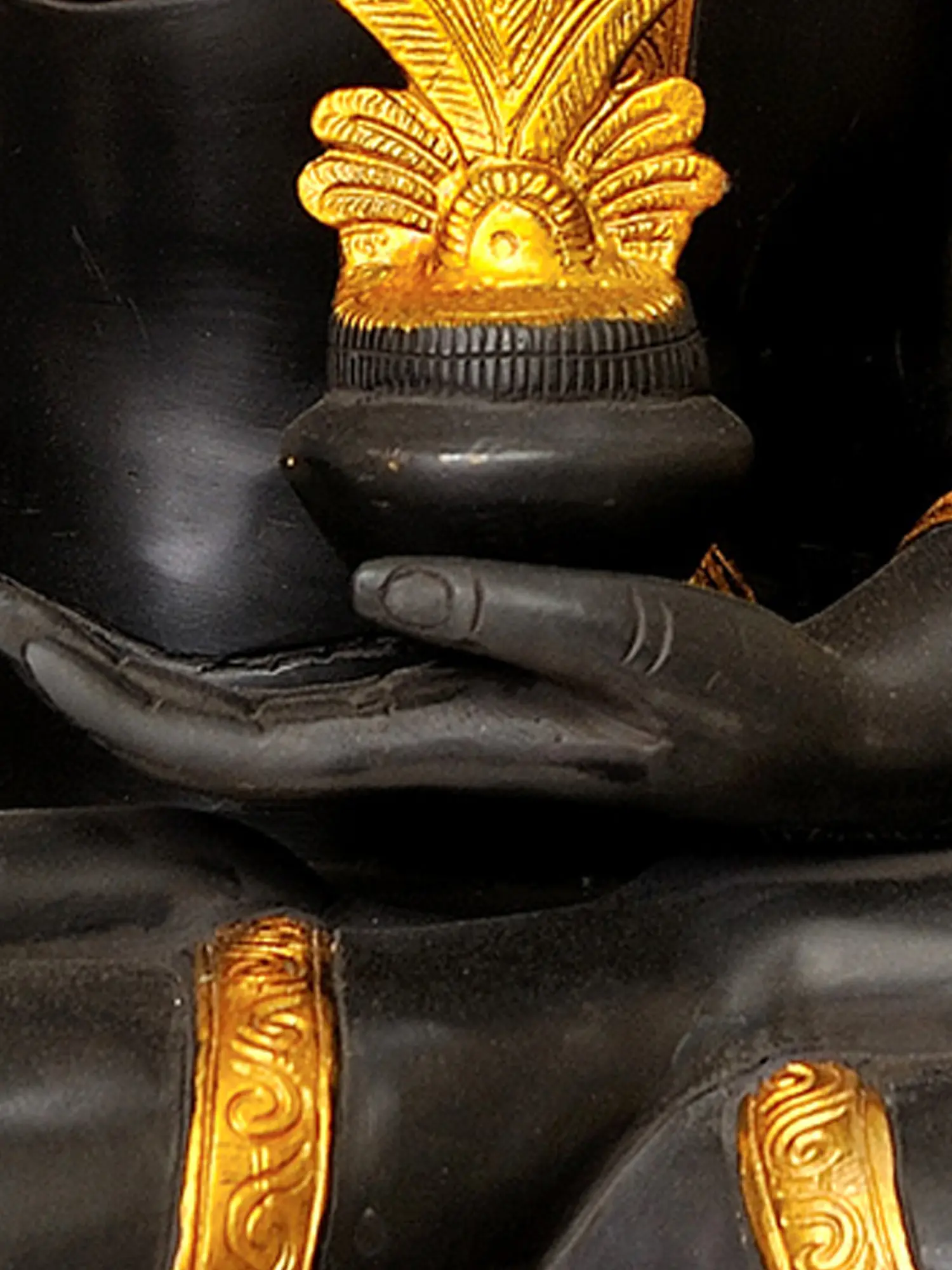 The artistry of this statue is evident in every curve and contour. The figure is seated in the lotus position, a posture of deep meditation and spiritual stability, with one hand resting in his lap, palm upwards, symbolizing the gathering of merit and the dispelling of obstacles. The other hand, raised in the gesture of *varada mudra* (bestowing boons), extends outward, offering blessings and healing. In his left hand, he traditionally holds the *Arura*, a medicinal fruit or herb, which symbolizes the eradication of disease. This symbolic fruit, rendered here with exquisite golden detail, further underscores his role as the supreme physician. The elaborate robes, adorned with intricate gold inlay, speak to his royal origins and the preciousness of the wisdom he imparts. The serene expression on his face, with half-closed eyes, conveys a profound sense of inner peace and boundless compassion. The golden accents on his earrings, neck, and bracelets add a touch of regal splendor, further emphasizing his elevated status as a celestial Buddha. This statue is more than an object of beauty; it is a conduit for blessings, a focal point for meditation, and a tangible reminder of the path to wellness and spiritual awakening. ––––––––––––––––––––