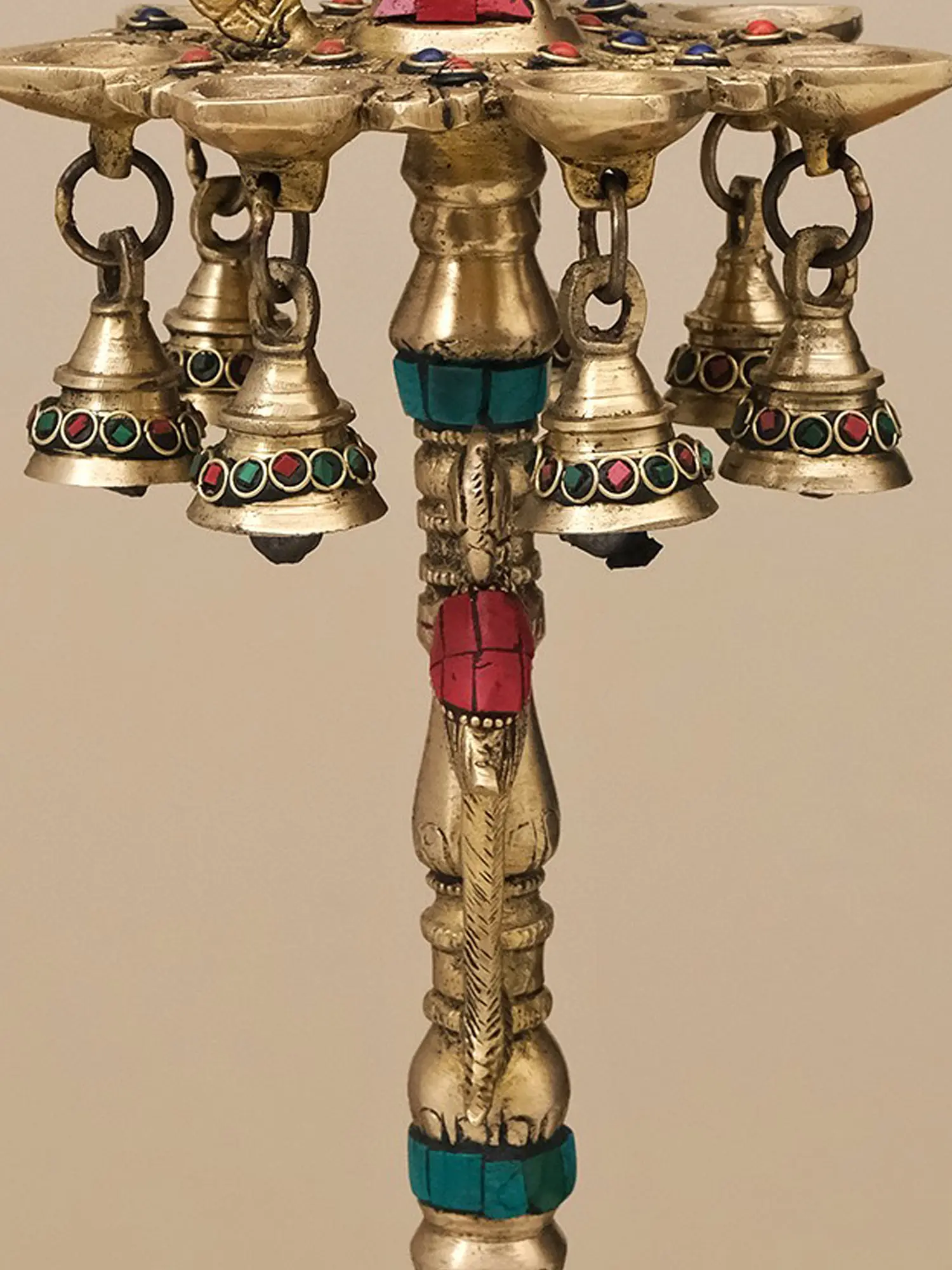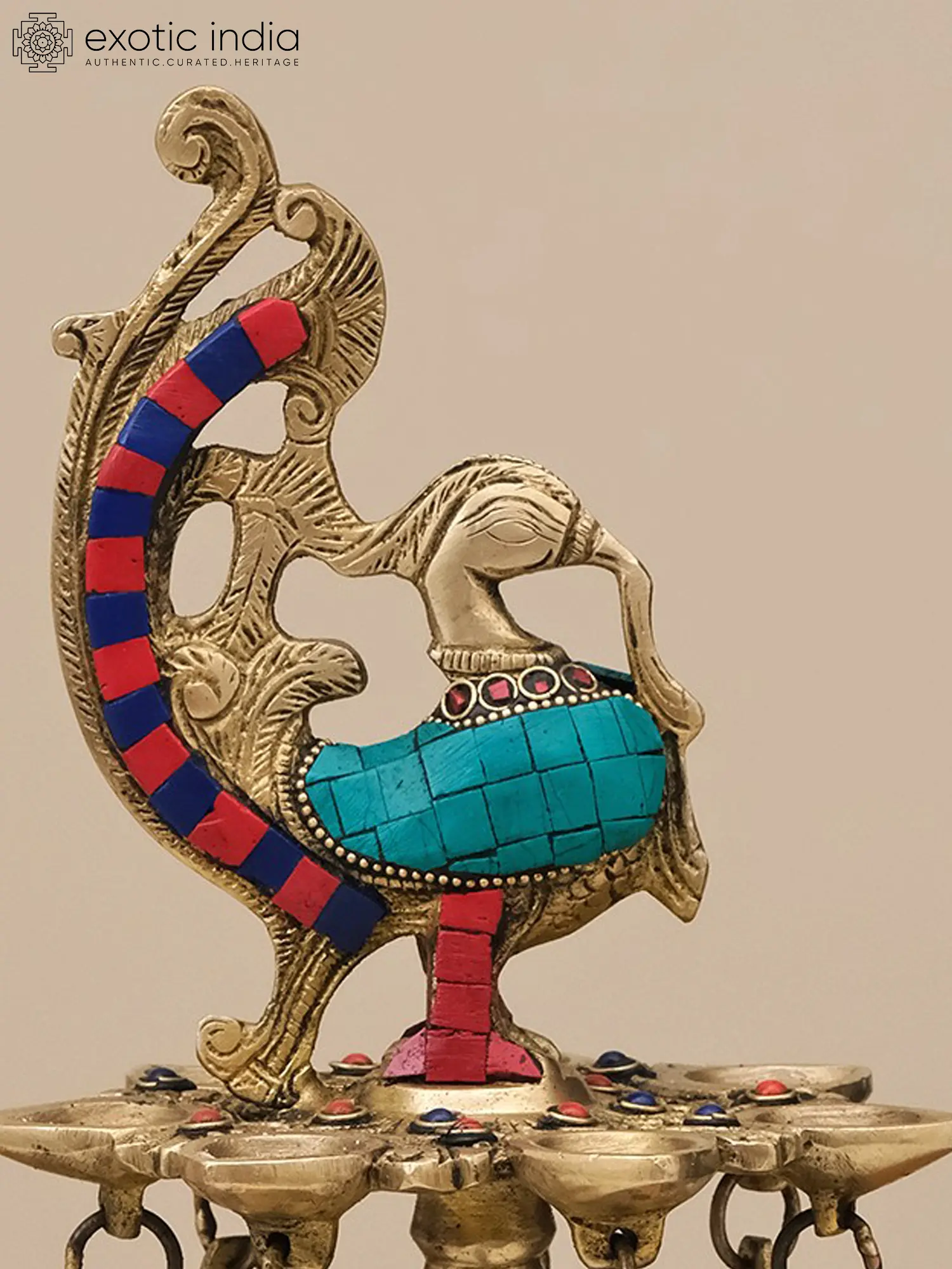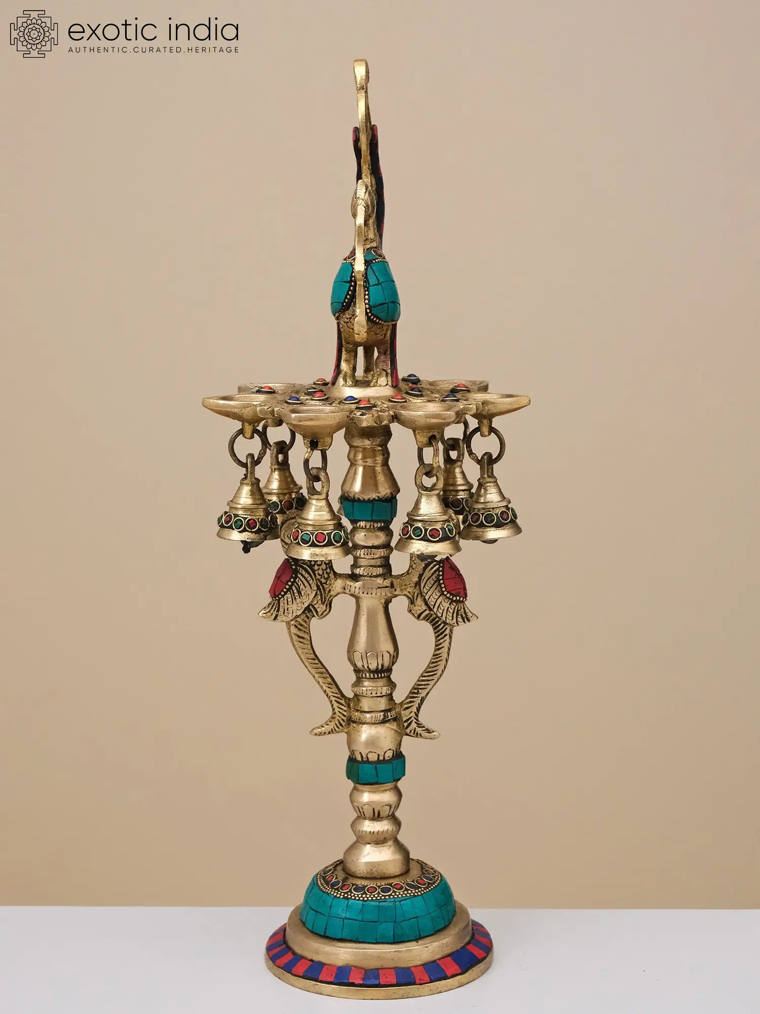 It is beautifully decorated with inlay work of red, blue, and turquoise stones in specific areas. It also contains beautifully inlaid bells attached to the lamps present below the sacred peacock motif. The stand is also finely assisted with inlay work thus making the look complete. The use of inlay work does not overpower the natural beauty of brass but rather complements the matt golden hue. These kinds of lamps are a perfect fit for festive decorations or can be kept as art pieces and passed on to the next generation.