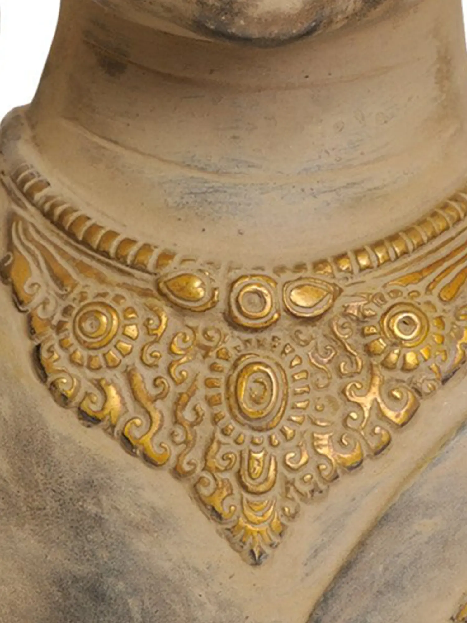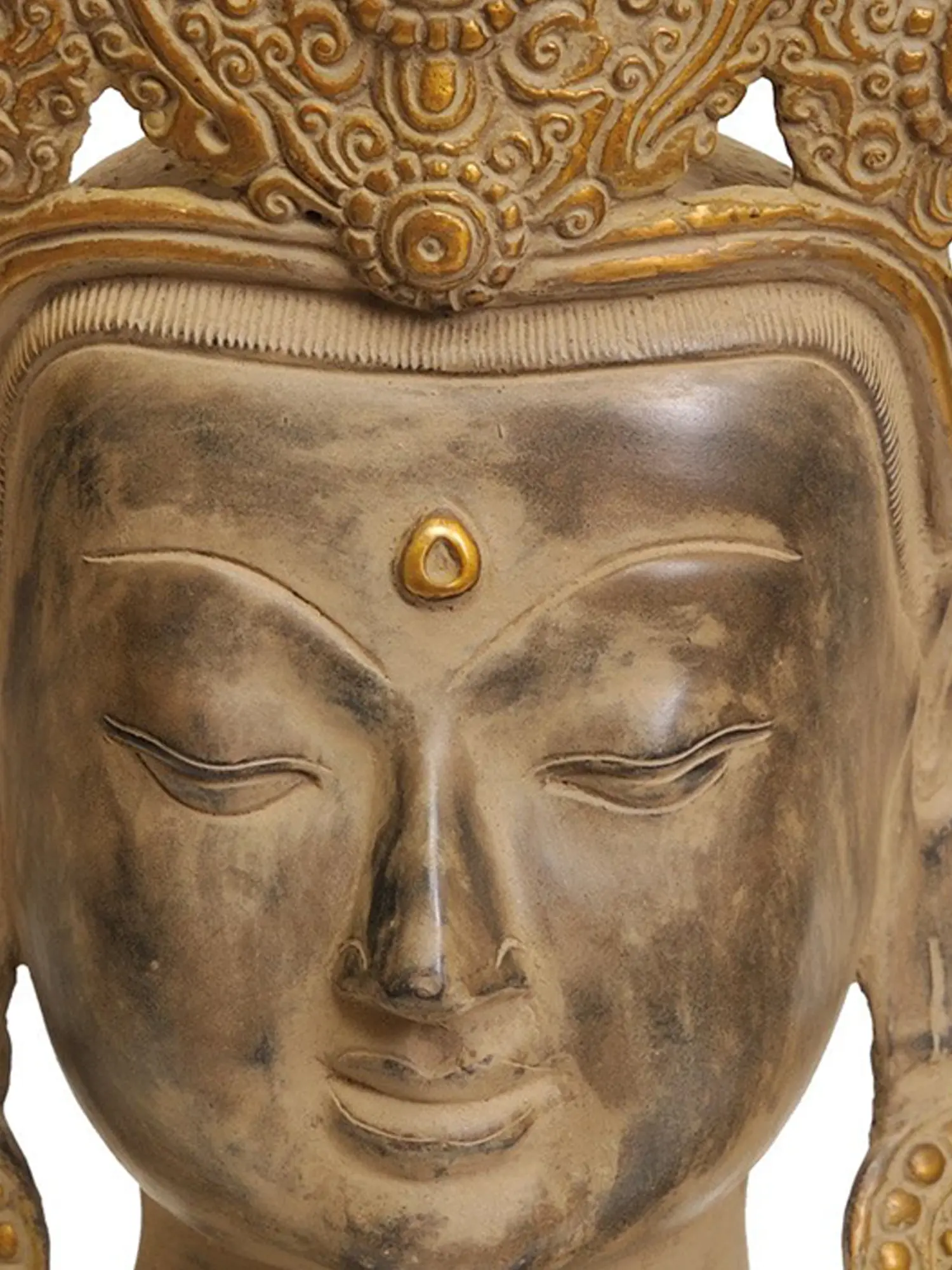 Crafted from high-quality brass, this bust exhibits a subtle patina that enhances its timeless appeal, hinting at an ancient lineage of devotional art. The gold accents on the crown, necklace, and robe details provide a striking contrast, drawing the eye to the most significant aspects of the deity's iconography. The substantial nature of the brass ensures this piece will endure for generations, serving as a focal point for meditation, a source of inspiration, or a majestic decorative element in any space. Handmade in India, this sculpture carries the rich heritage of Indian metalwork traditions, renowned for their intricate detail and spiritual depth. This piece is not just an object of art; it is a conduit to spiritual reflection, a reminder of the path to awakening, and a testament to the enduring power of Buddhist philosophy.