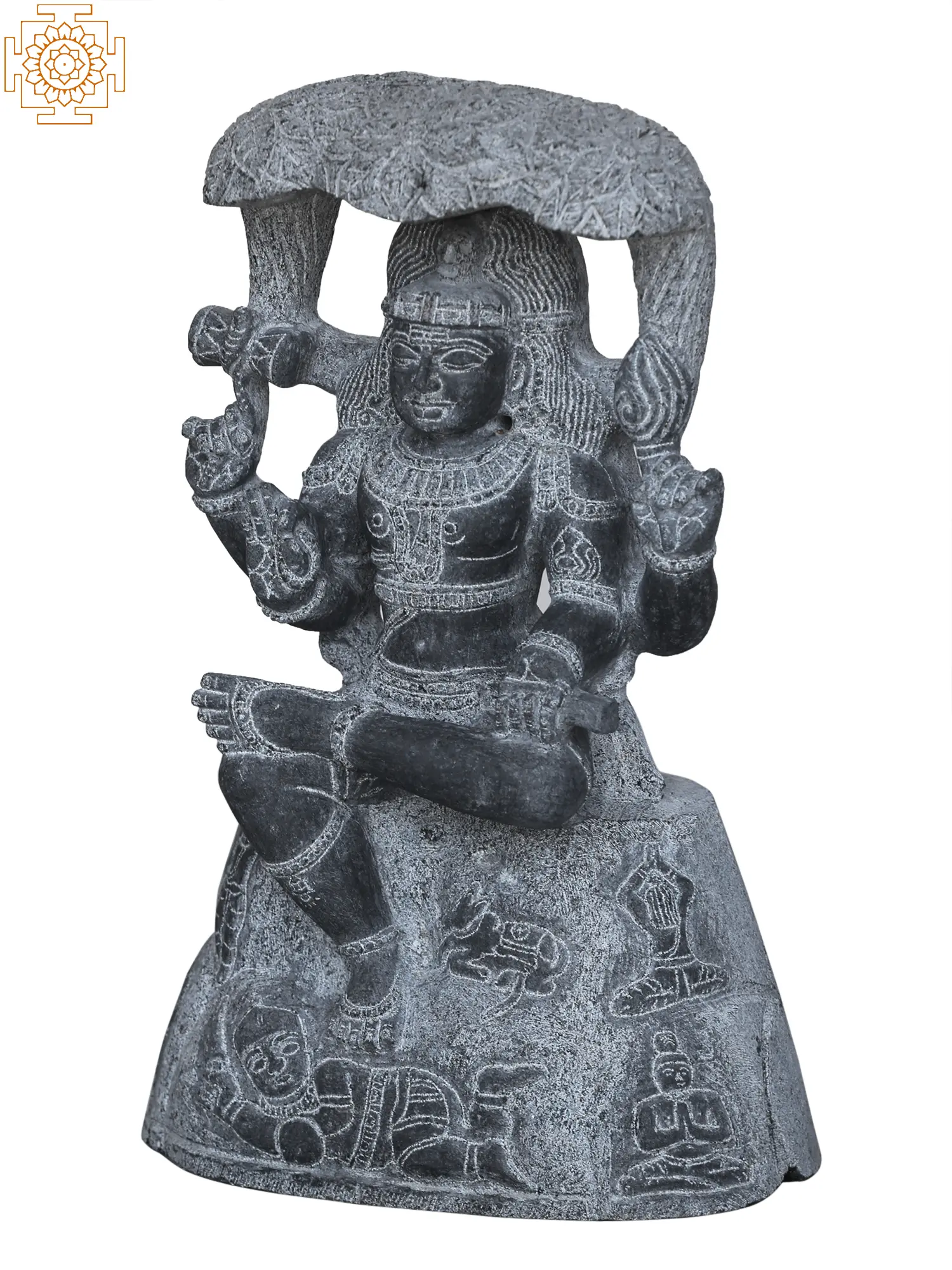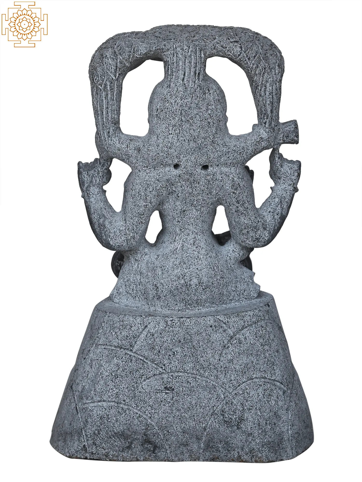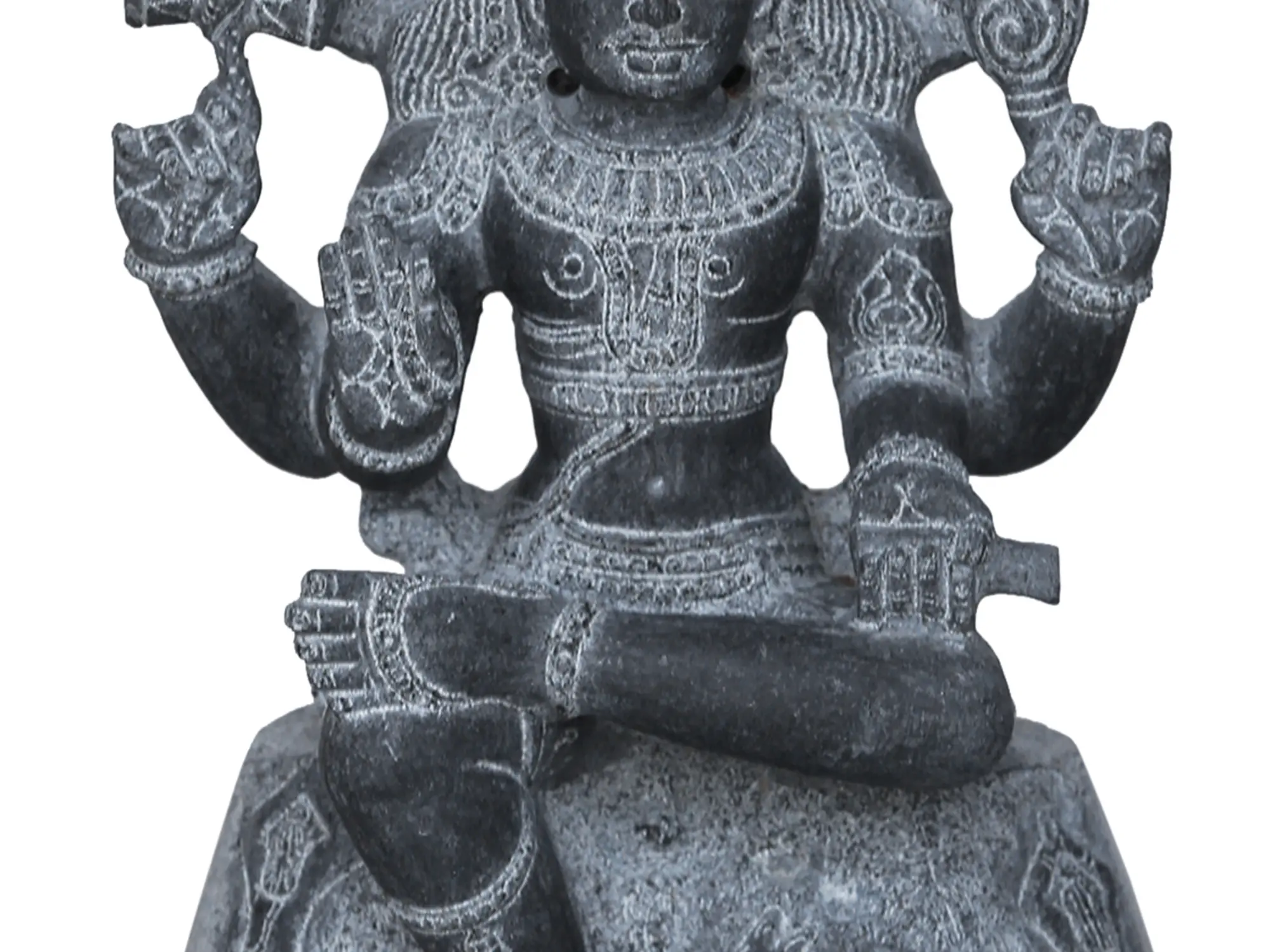 Carved from solid granite, the statue typically portrays him seated under a banyan tree, with one leg folded over the other in virasana (heroic pose) and the other resting on a small demon or dwarf figure, representing the suppression of ignorance.