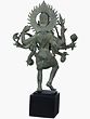 The sculptor has given her an ancient look with the rock-like brass texture. All her eight limbs carry the ritual implements namely- mace, trident, sword, a severed head, skull cup, whip, conch and axe. She is often represented in her fearful form, with the tongue lolling out in shame, eyes broadened and the long hair dishevelled in anger. She wears a garland of skulls and a skirt of dismembered arms signifying her way to liberate from attachment to body and thus from ego, and is ornated in lustrous jewels.