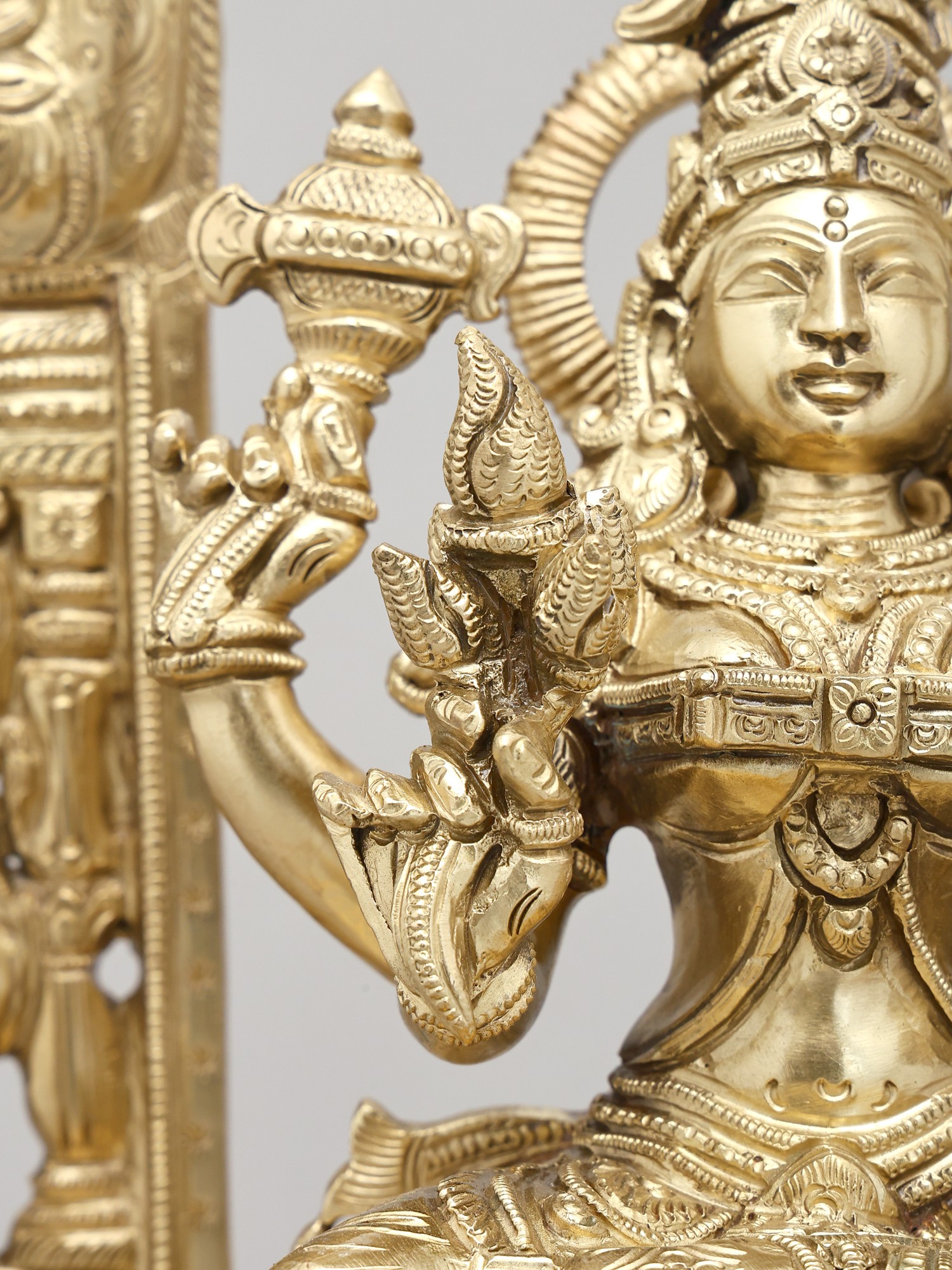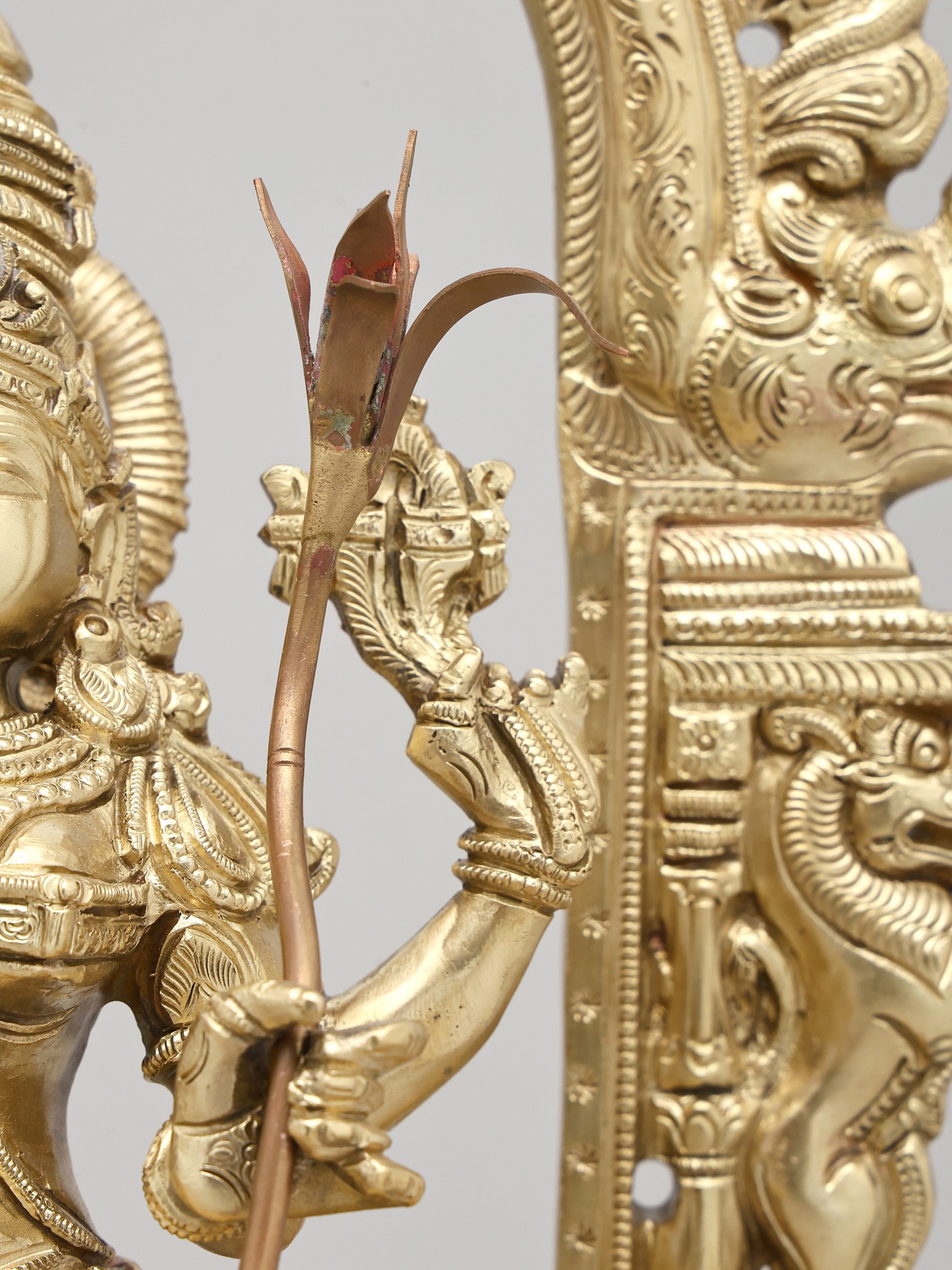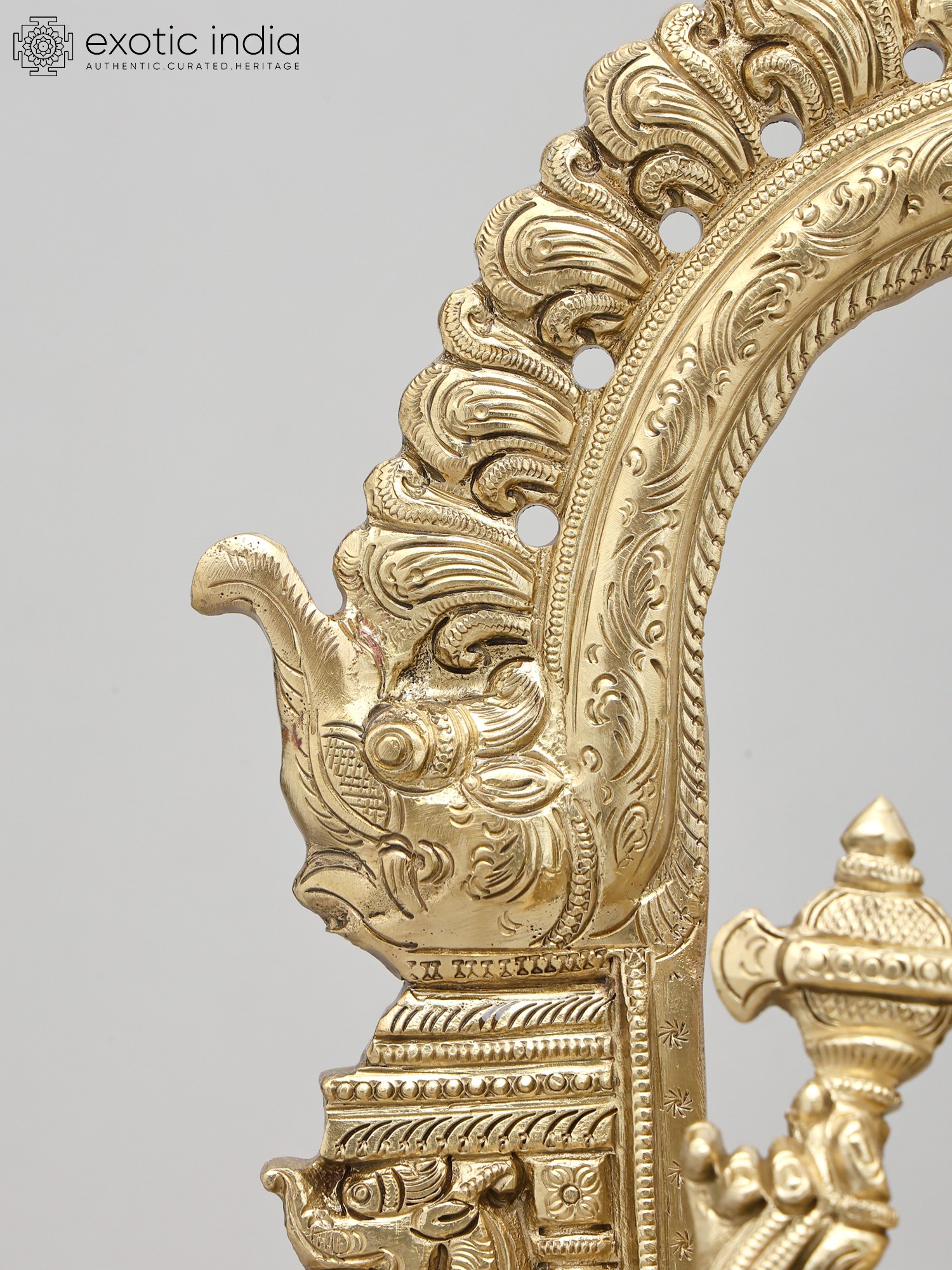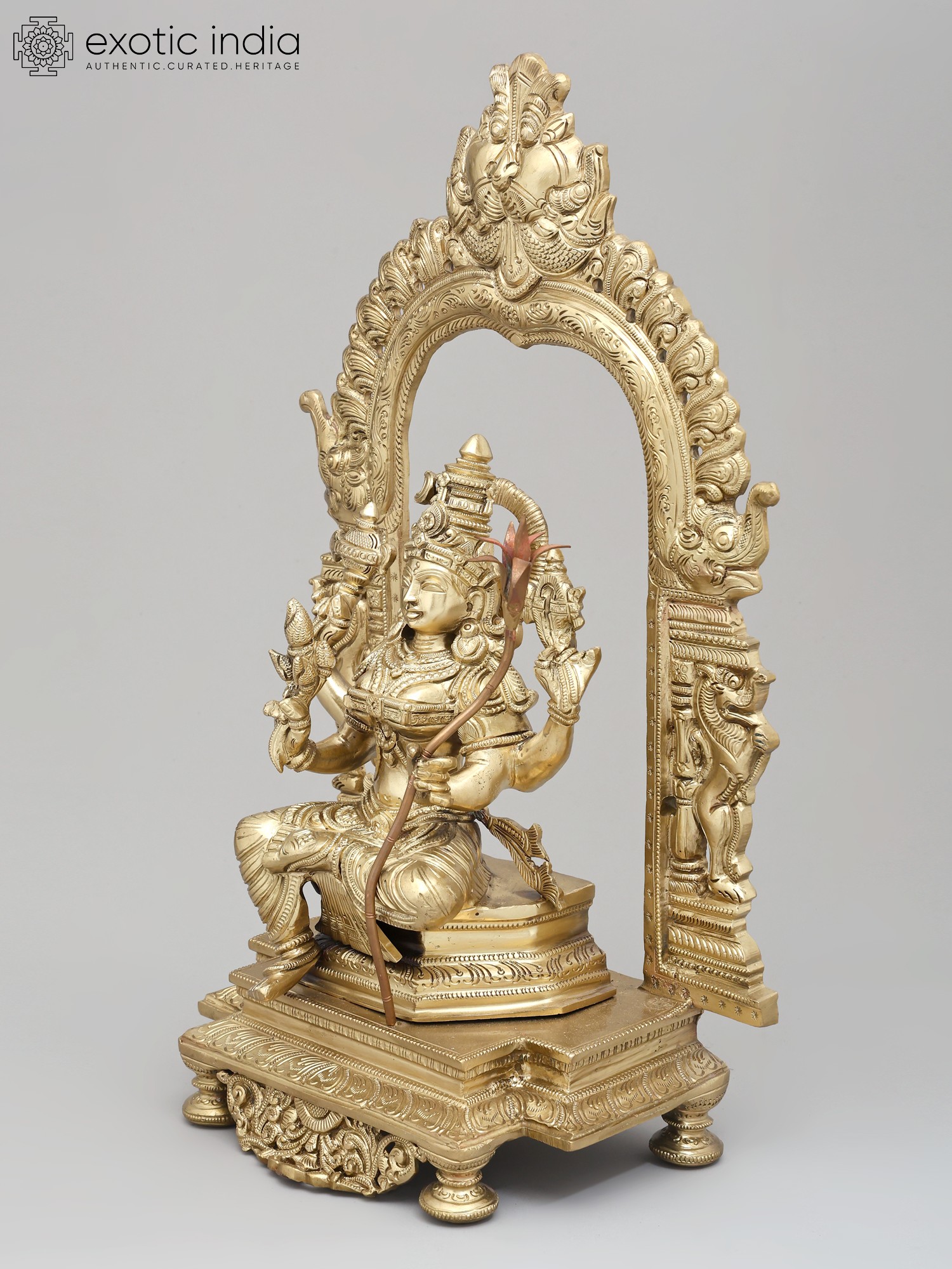 Adorned with a solar aura, seated on a lotus throne, Devi Tripurasundari-Rajarajeshwari is surrounded by a splendid aureole, adorned with a Kirtimukha emblem, with two Makara placed on pillars of Yali. Infused with a divine glow all over, this bronze statue is sculpted as a sanctum icon of Tripurasundari.