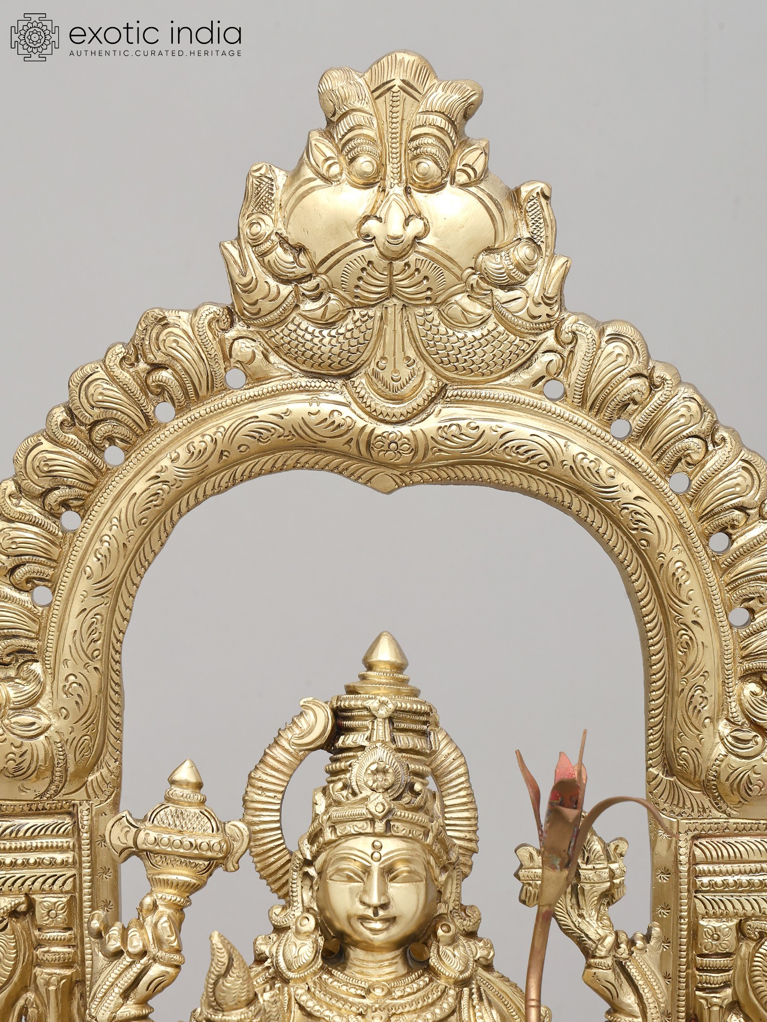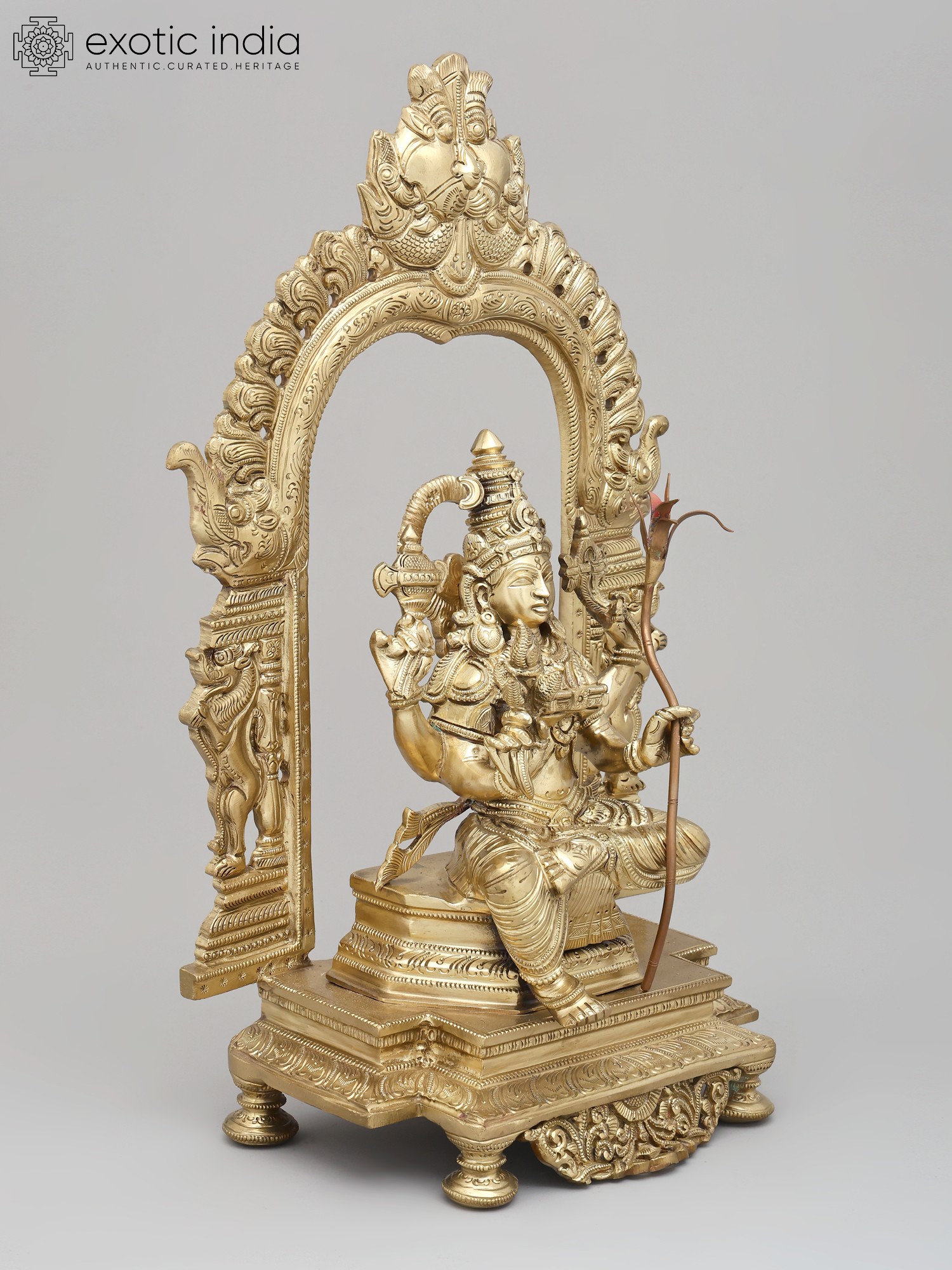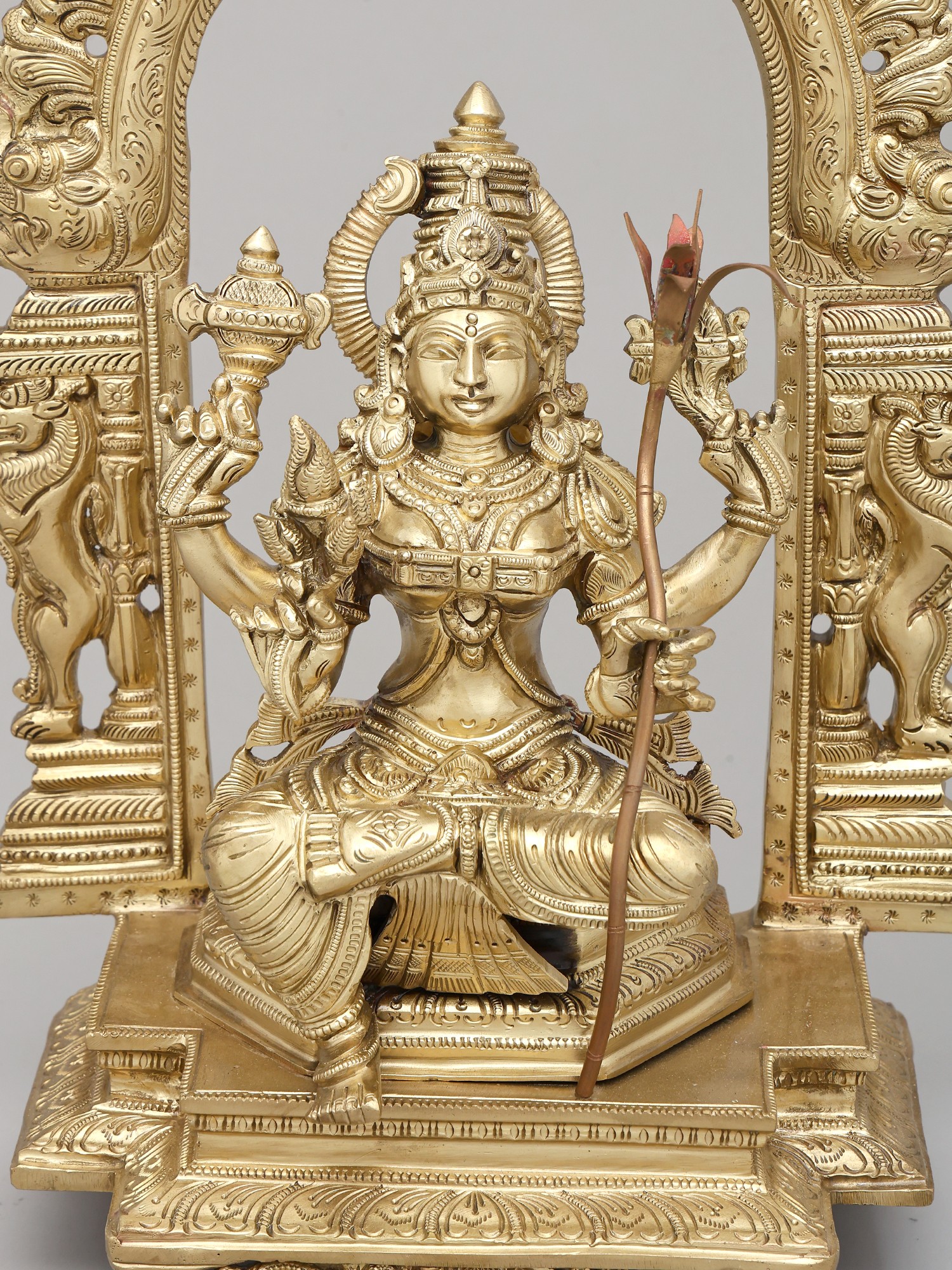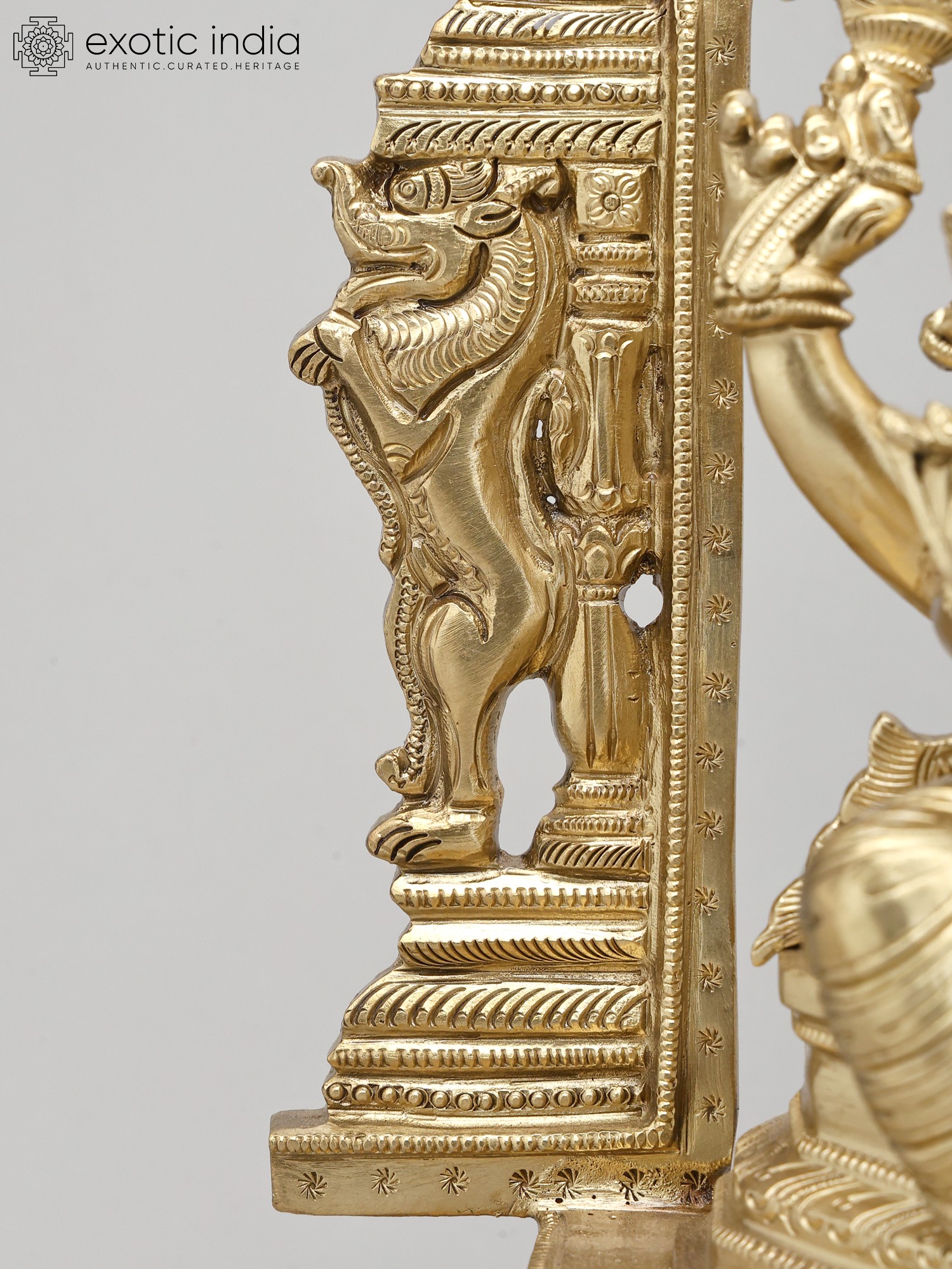 Adorned with a solar aura, seated on a lotus throne, Devi Tripurasundari-Rajarajeshwari is surrounded by a splendid aureole, adorned with a Kirtimukha emblem, with two Makara placed on pillars of Yali. Infused with a divine glow all over, this bronze statue is sculpted as a sanctum icon of Tripurasundari.