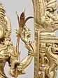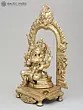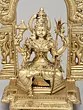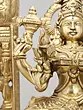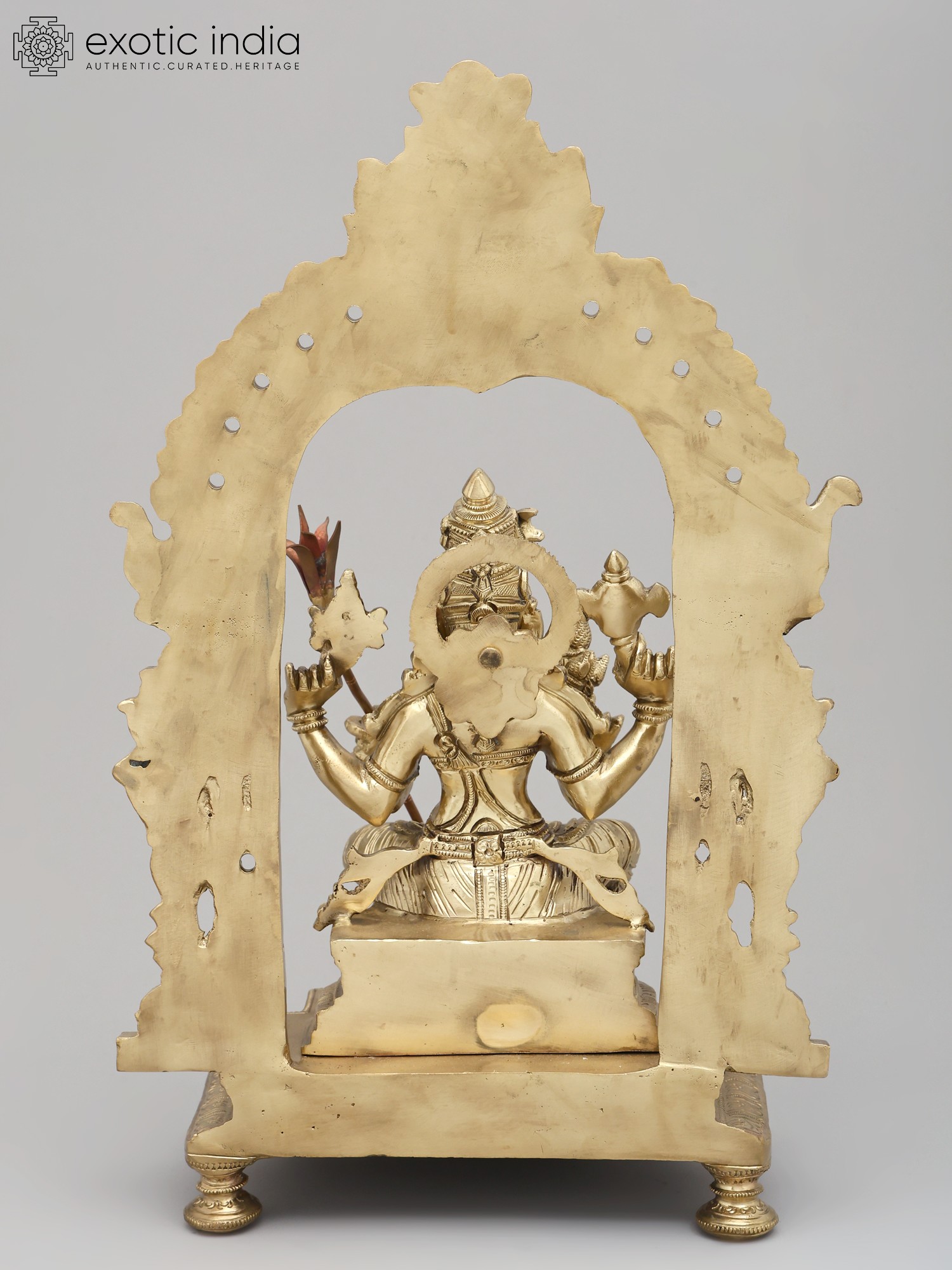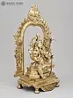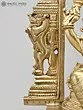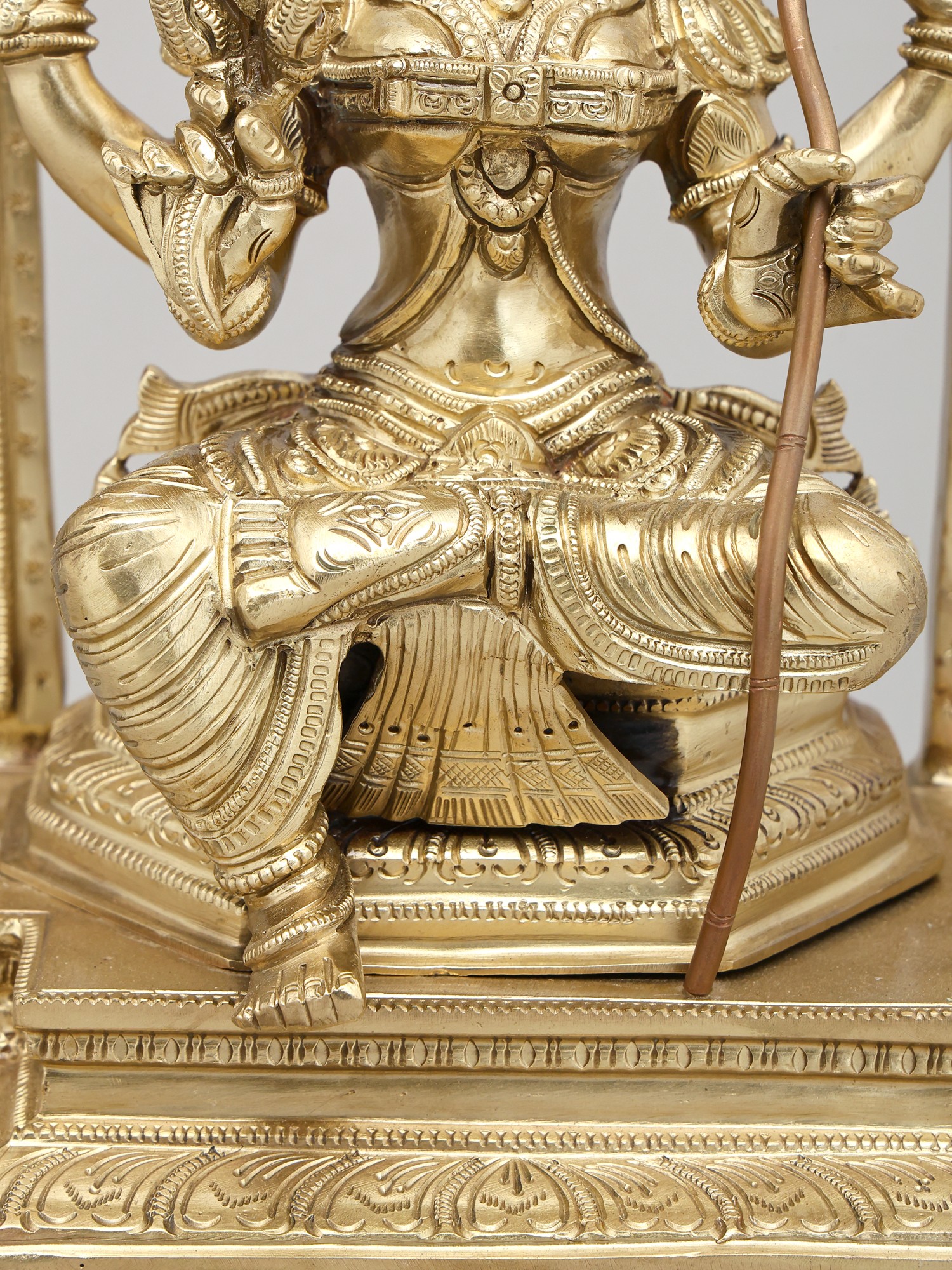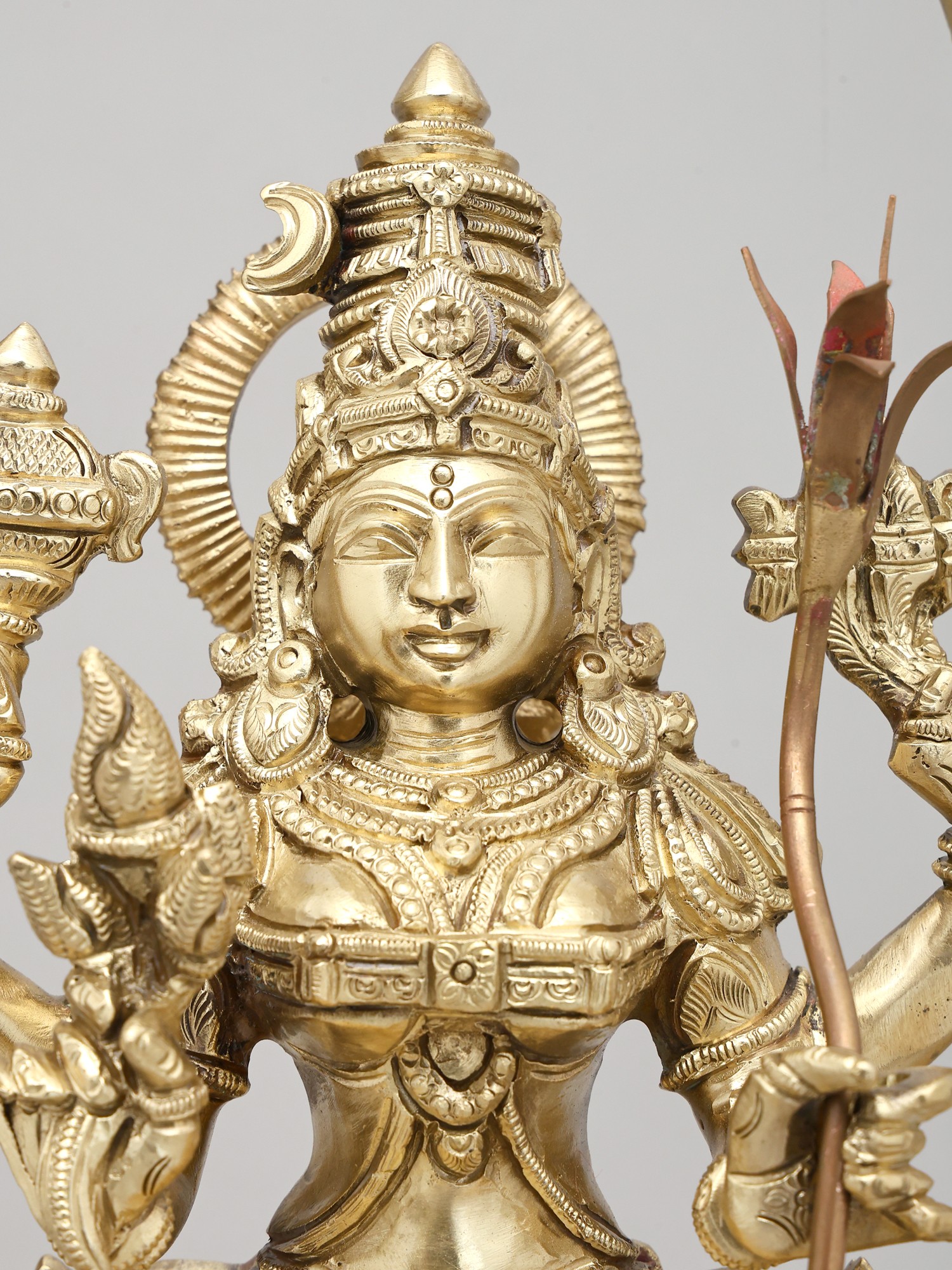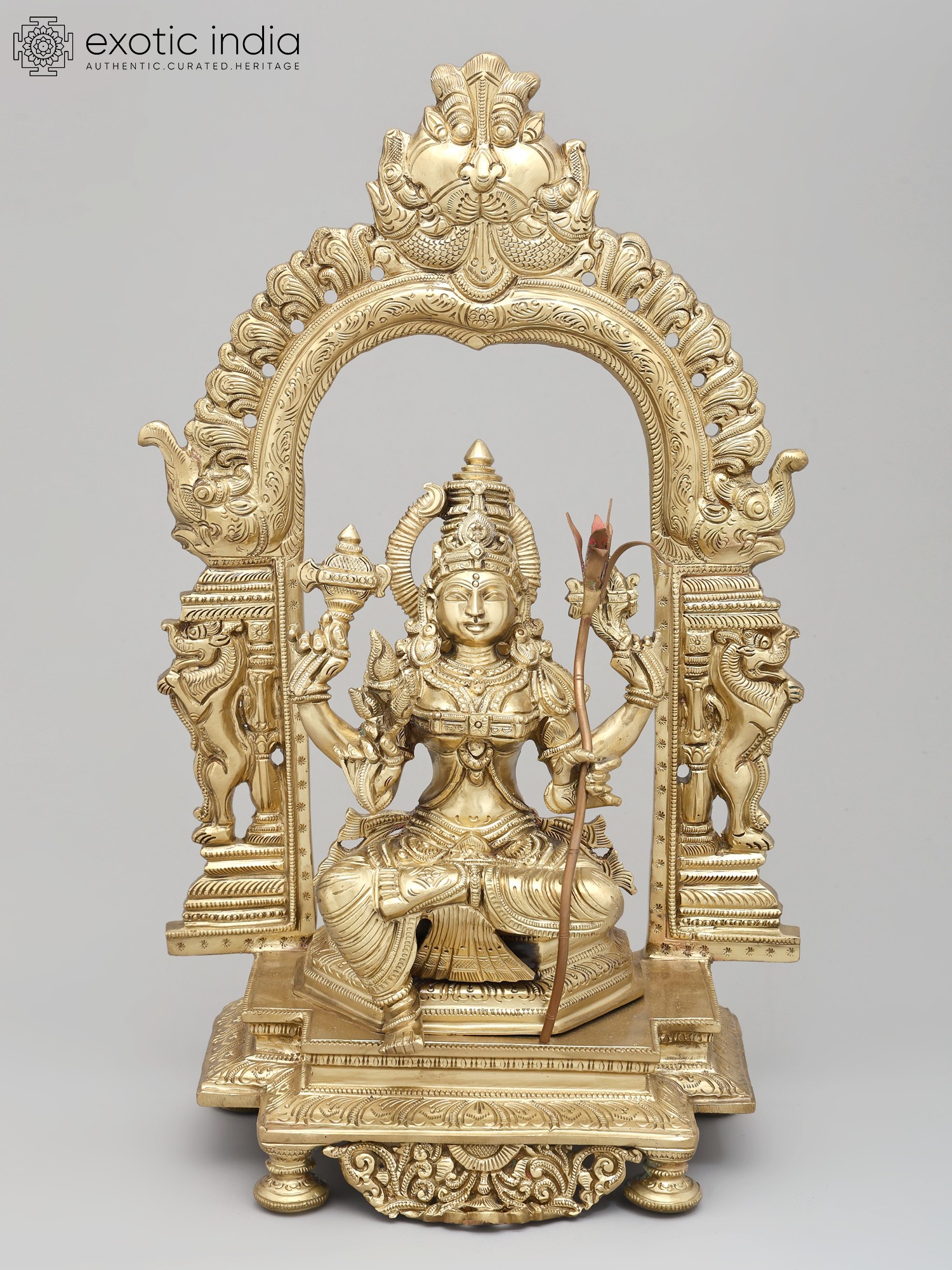 Adorned with a solar aura, seated on a lotus throne, Devi Tripurasundari-Rajarajeshwari is surrounded by a splendid aureole, adorned with a Kirtimukha emblem, with two Makara placed on pillars of Yali. Infused with a divine glow all over, this bronze statue is sculpted as a sanctum icon of Tripurasundari.