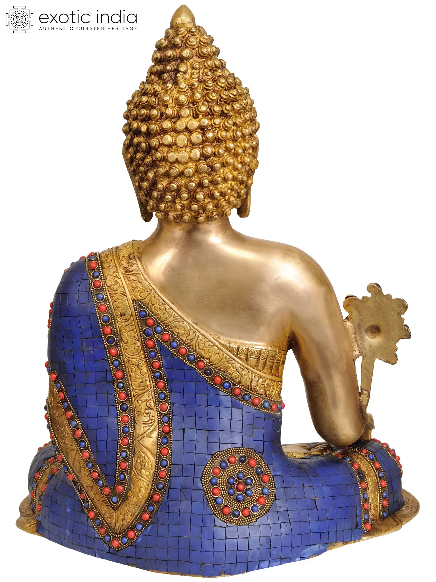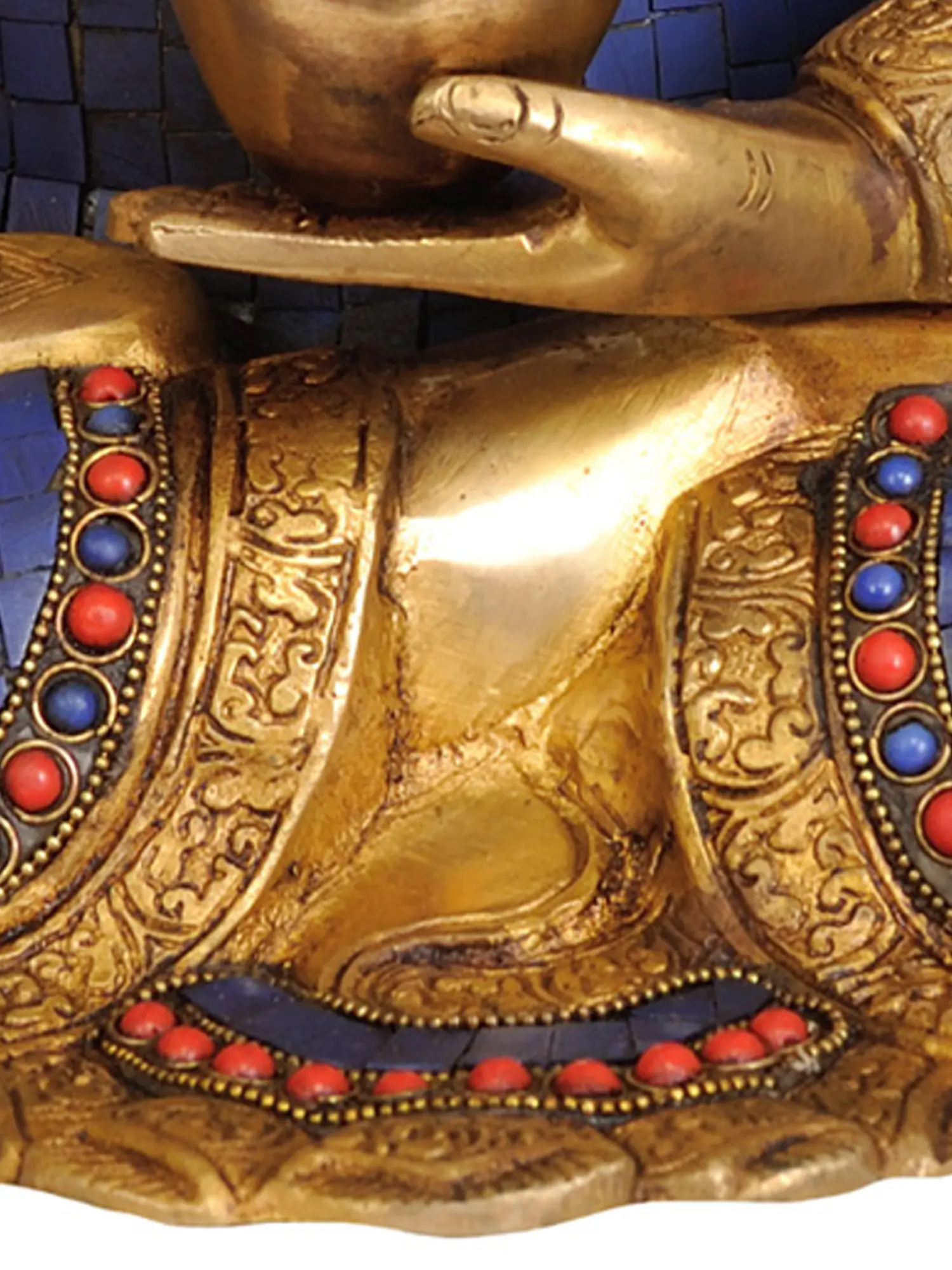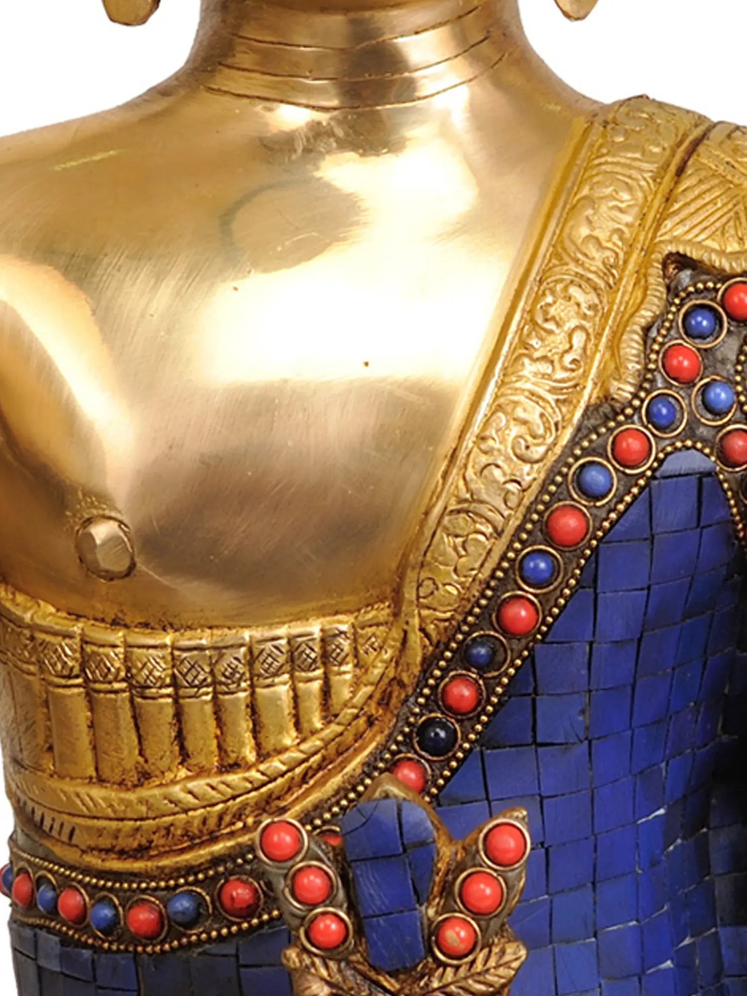 The statue is cast in lustrous brass, polished to a radiant gleam that symbolizes spiritual illumination. The robes of the Medicine Buddha are adorned with a breathtaking inlay of lapis lazuli tiles, interspersed with vibrant coral and other semi-precious stones. Lapis lazuli, a stone revered since antiquity, is associated with wisdom, truth, and spiritual enlightenment. Its deep blue hue evokes the cosmic sky, representing the infinite and the divine. The red coral, symbolizing vitality and life force, complements the lapis, creating a visually stunning and symbolically rich garment. The detail extends to the delicate ornamentation on the Buddha's shoulders and the elegant border around his flowing robes, each element meticulously shaped by skilled artisans. The gentle curvature of his form, the contemplative expression, and the poised hand holding a medicinal bowl – from which potent herbs are said to emanate – all speak to his role as a divine physician.