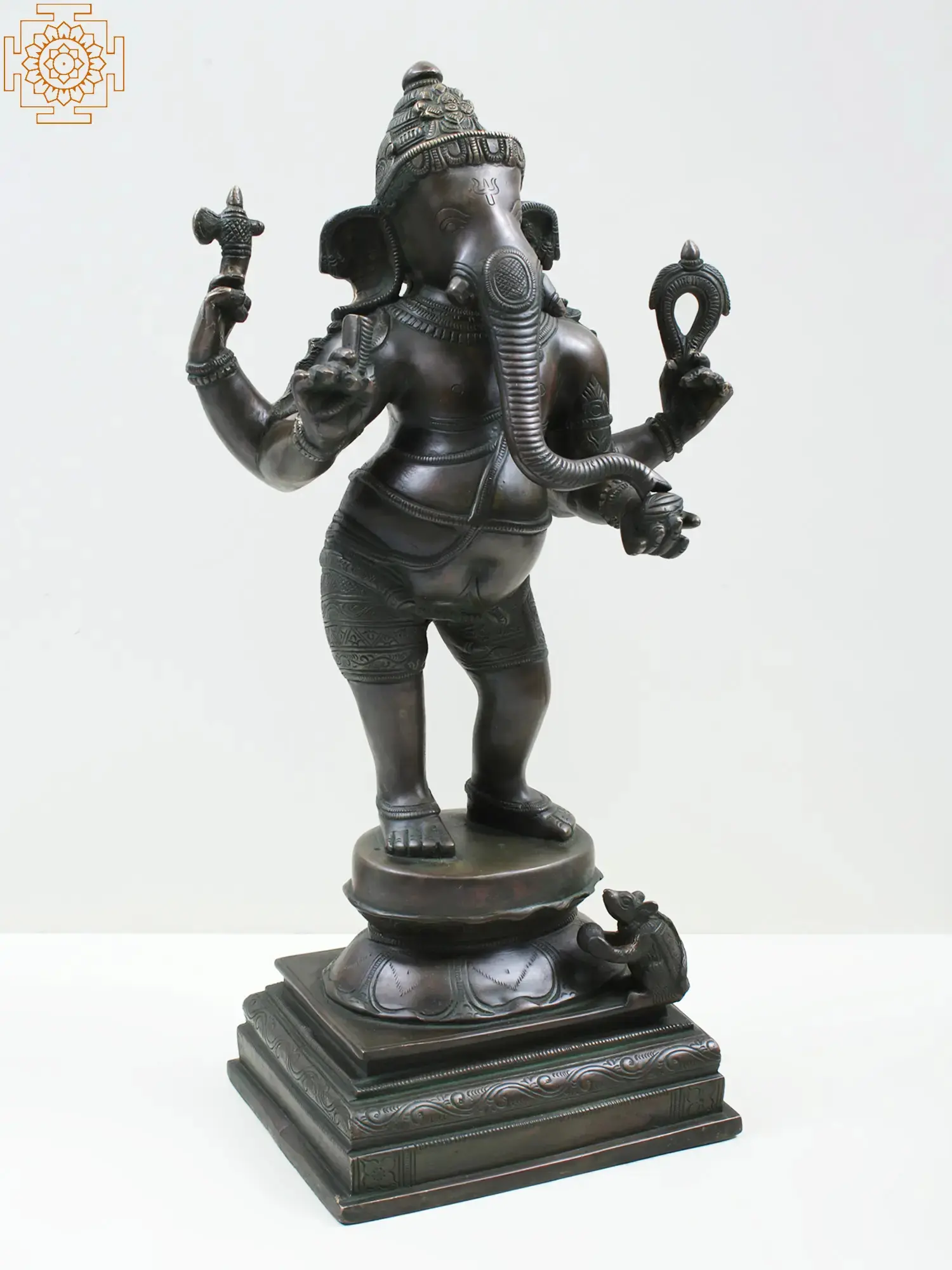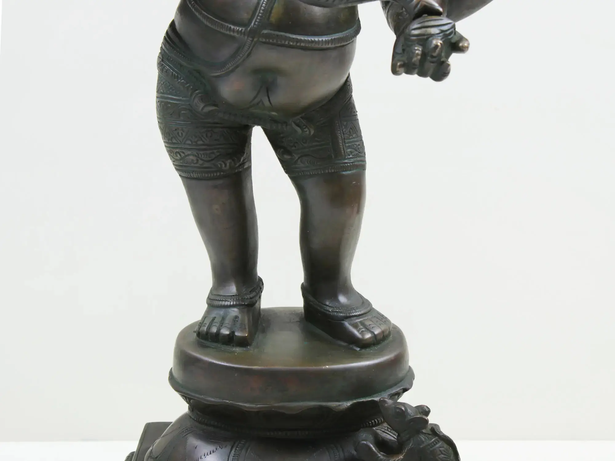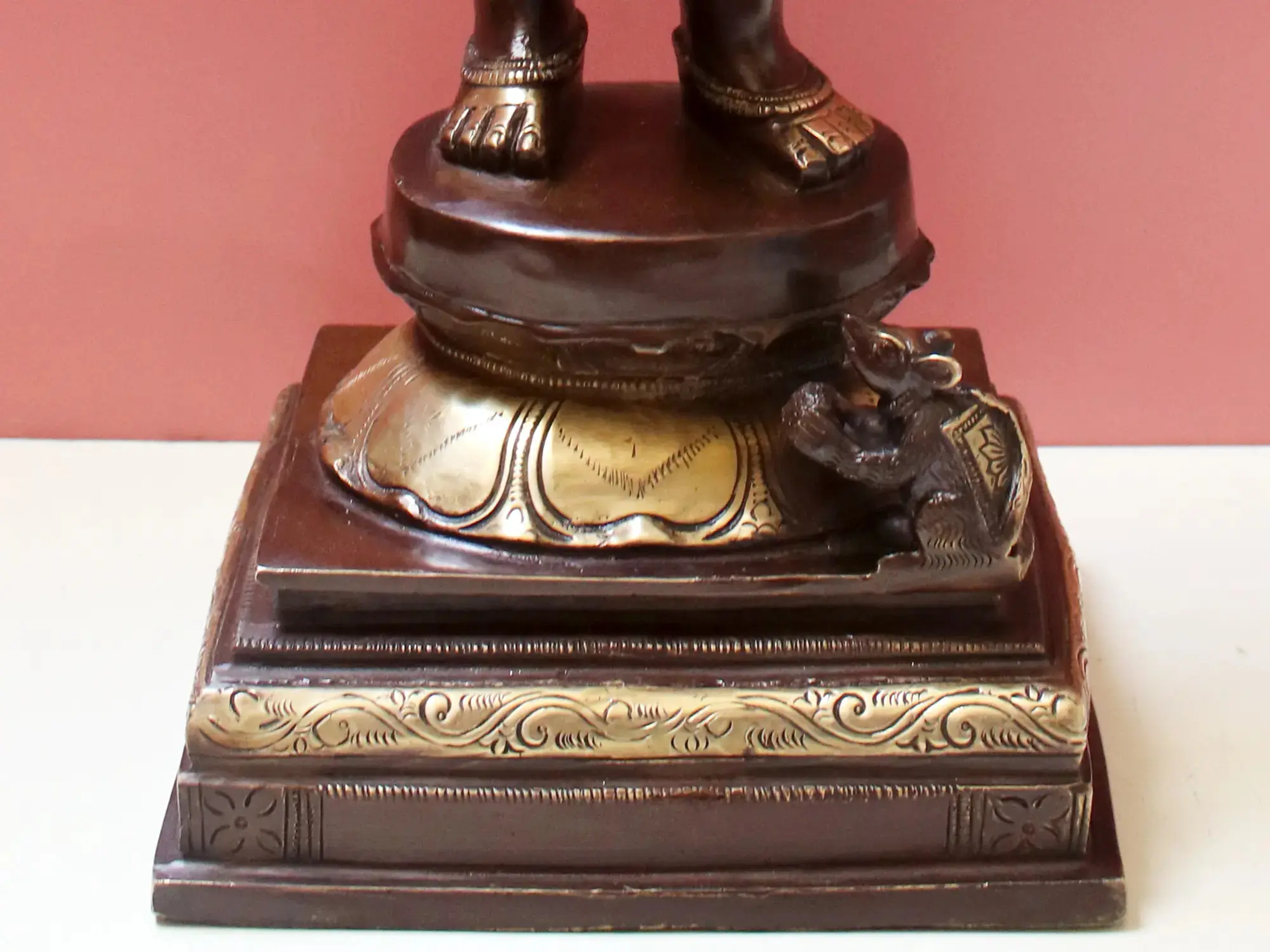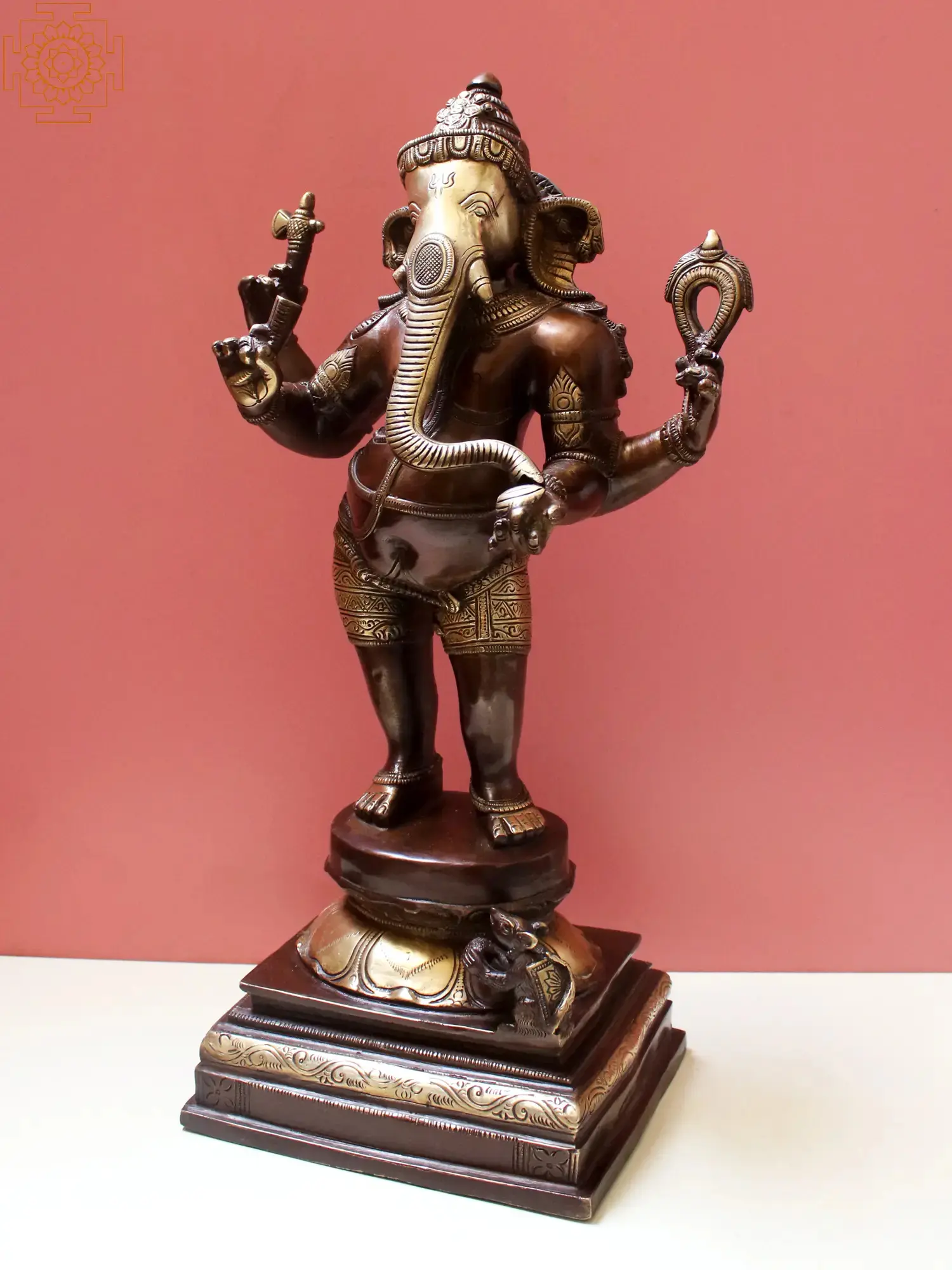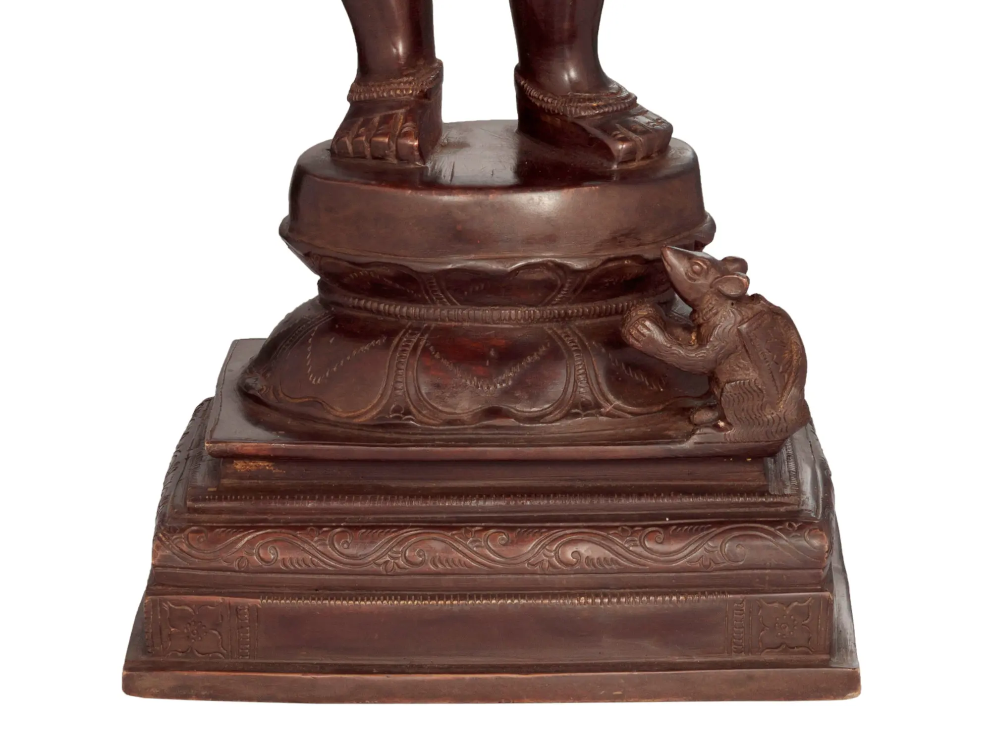 This standing Ganesha sculpture is a testament to the skill and dedication of master artisans. The intricate detailing across the figure, from the finely sculpted ornaments to the textured headdress and the dynamic posture, showcases a deep understanding of traditional iconography and a keen eye for aesthetic appeal. The lustrous brass medium lends a timeless gravitas to the piece, radiating a warm, inviting glow that enhances its spiritual aura. The slightly aged patina adds a sense of antiquity, evoking the sacred traditions from which this divine form originates. The stable, ornate base provides a fitting pedestal for the deity, further accentuating his majestic stance. This sculpture is not merely an object of decoration but a conduit of spiritual energy, designed to inspire contemplation and foster a deeper connection with the divine.