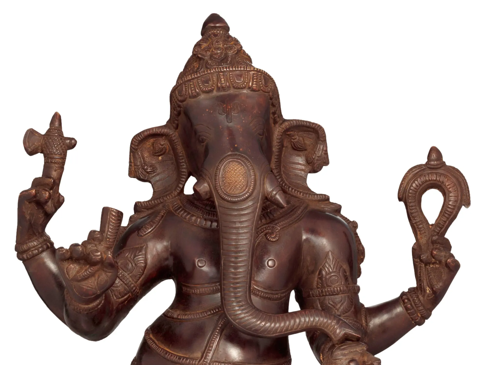 The iconography of Ganesha is rich with symbolism, and this sculpture elegantly portrays many of his traditional attributes. His elephant head signifies wisdom, strength, and the ability to overcome challenges, much like the animal itself navigates dense forests. His large ears represent the capacity to listen intently, a virtue essential for understanding and insight. The trunk, a symbol of adaptability, can be used for both delicate tasks and powerful actions. In his multiple hands, he often holds various implements, each carrying profound meaning. Here, his raised hands suggest blessings and protection, while other attributes speak to his role as a divine scribe and the remover of ignorance. One hand may hold an axe to cut through illusions, while another might offer a sweet, symbolizing the rewards of devotion and the fruits of knowledge. His vehicle, the Mushika (mouse), often depicted near his feet, represents the taming of ego and desires, reminding us that even the smallest creature can be a powerful ally when guided by divine grace.