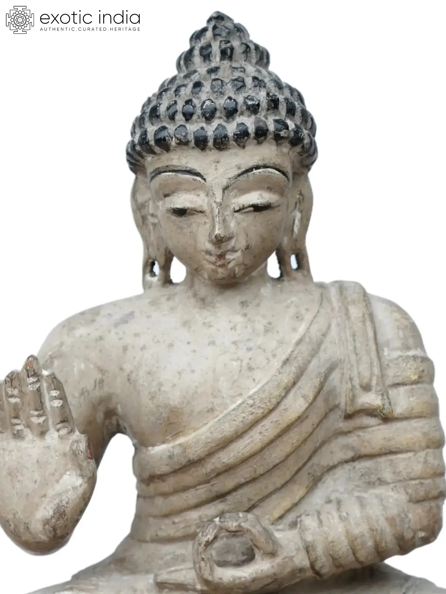 Buddha sits in Padmasana or lotus pose, with one hand in his lap in Dhyan mudra and the other raised in Abhya mudra (gesture of fearlessness), asking the devotee to focus on the inner brilliance and be fearless in the face of ever-transforming life.