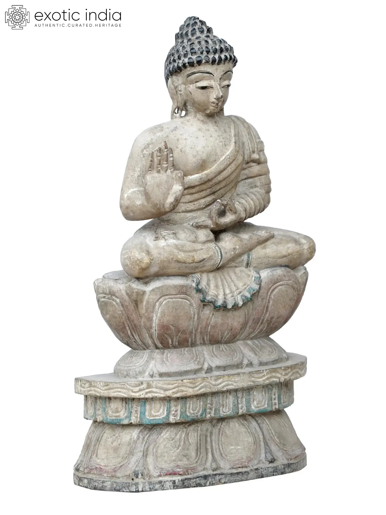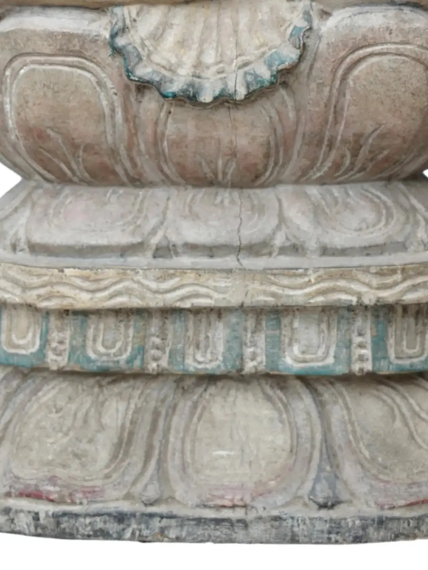 A statue of the Buddha Shakyamuni is the most powerful and profound symbol for a Buddhist follower. Embodying the essence of Buddha’s exemplary life, this wooden statue is carved with an antique appeal, depicting the Enlightened One on a two-tiered pedestal, sitting on a lotus that symbolizes the blossoming of wisdom.
