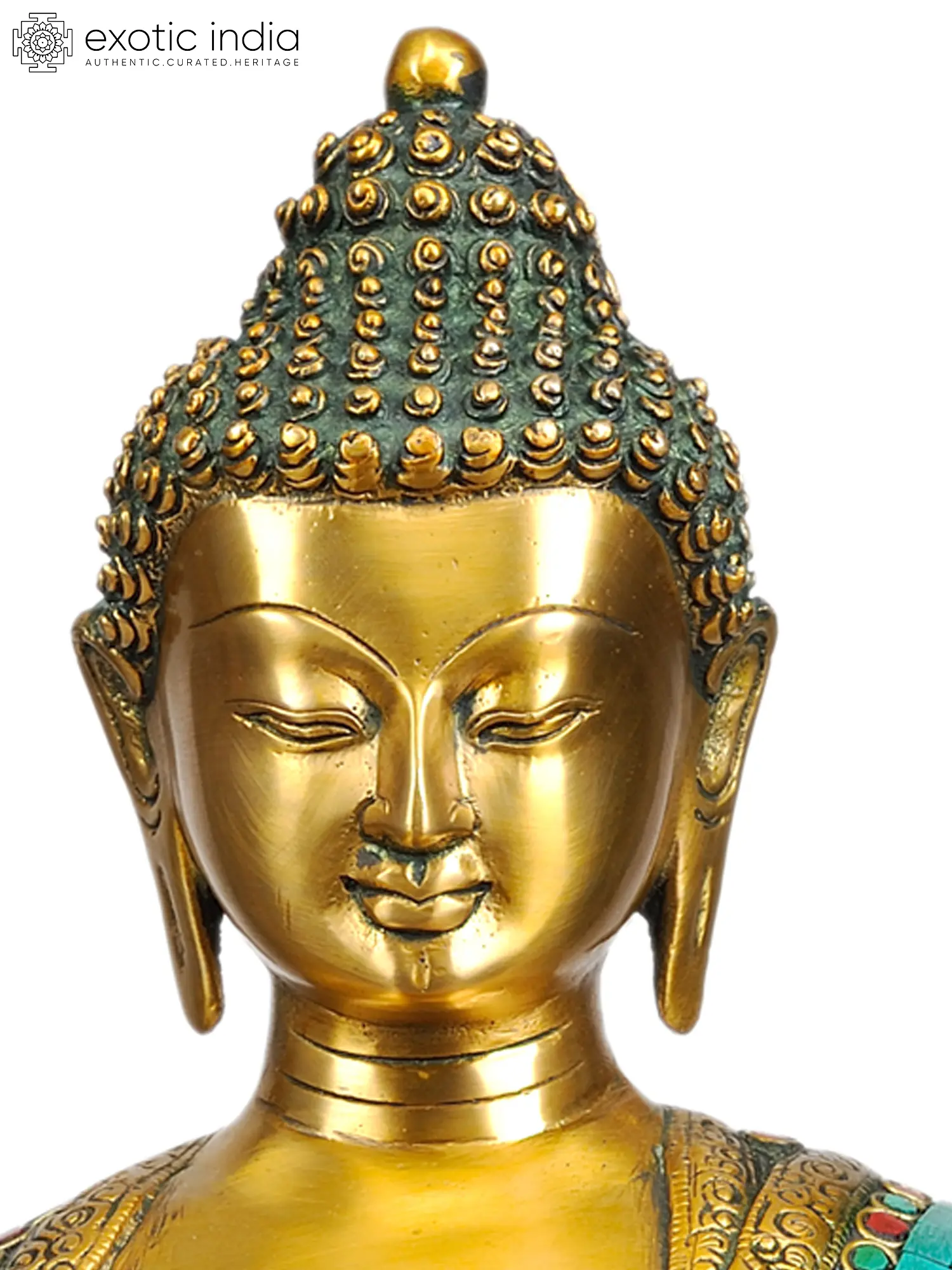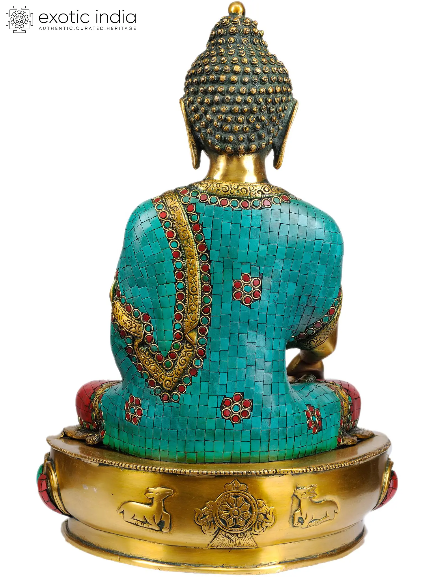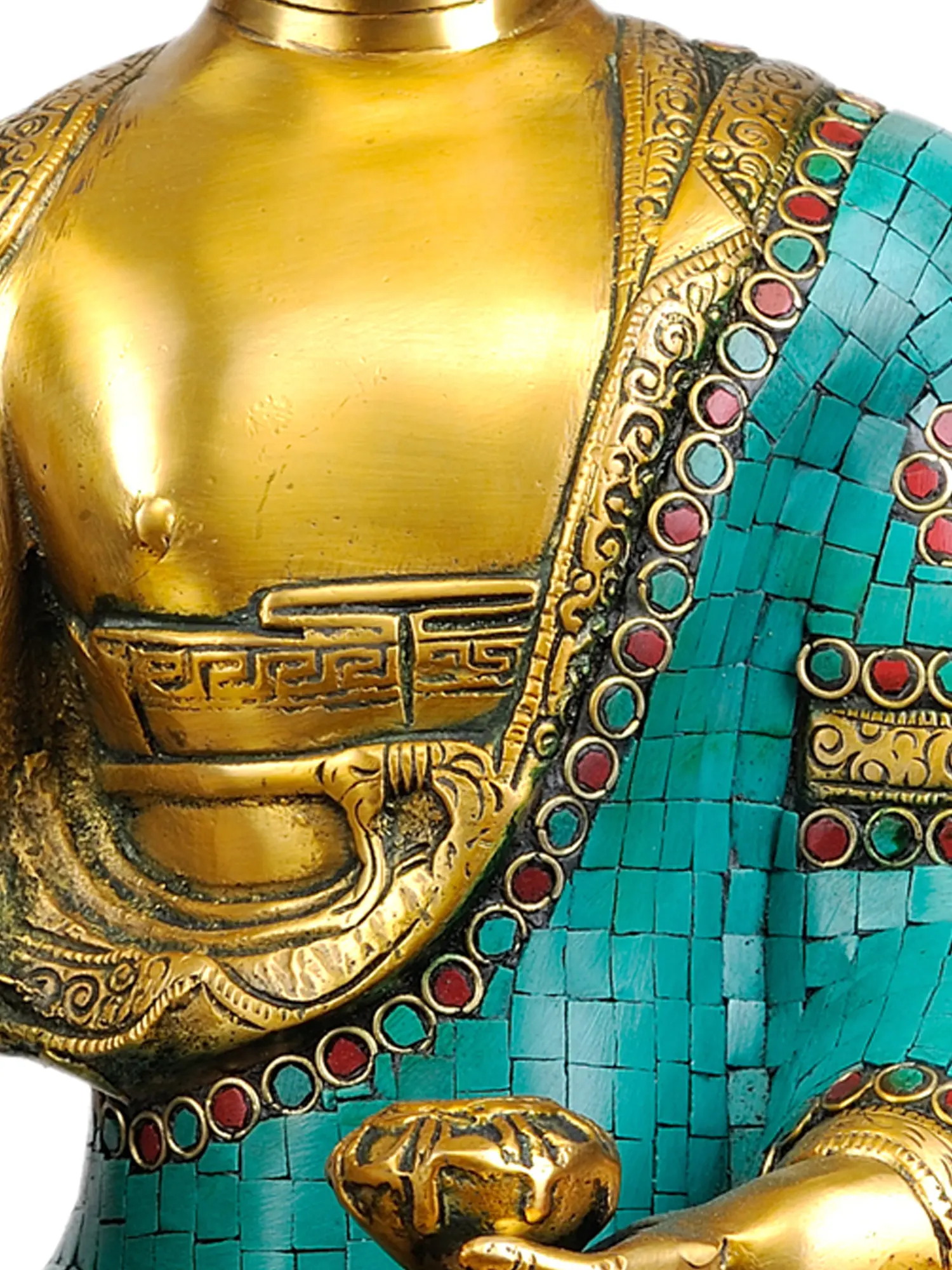 The artistry of this statue is a testament to the rich heritage of Indian craftsmanship. Fashioned from gleaming brass, the figure of the Buddha exudes a timeless aura of peace and wisdom. The meticulous inlay work, featuring vibrant turquoise and coral-like stones, adds an extraordinary dimension of beauty and symbolism. Turquoise, often associated with wisdom, healing, and protection, complements the serene expression of the Buddha, while the deep red hues evoke passion, vitality, and the grounding energy of the earth. The intricate detailing extends to the Buddha's robes, adorned with delicate patterns and bands, and the ornate lotus pedestal upon which he sits. The lotus, a sacred symbol in many Eastern traditions, represents purity, spiritual awakening, and transcendence over worldly desires, rising unstained from the mud.