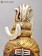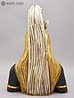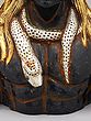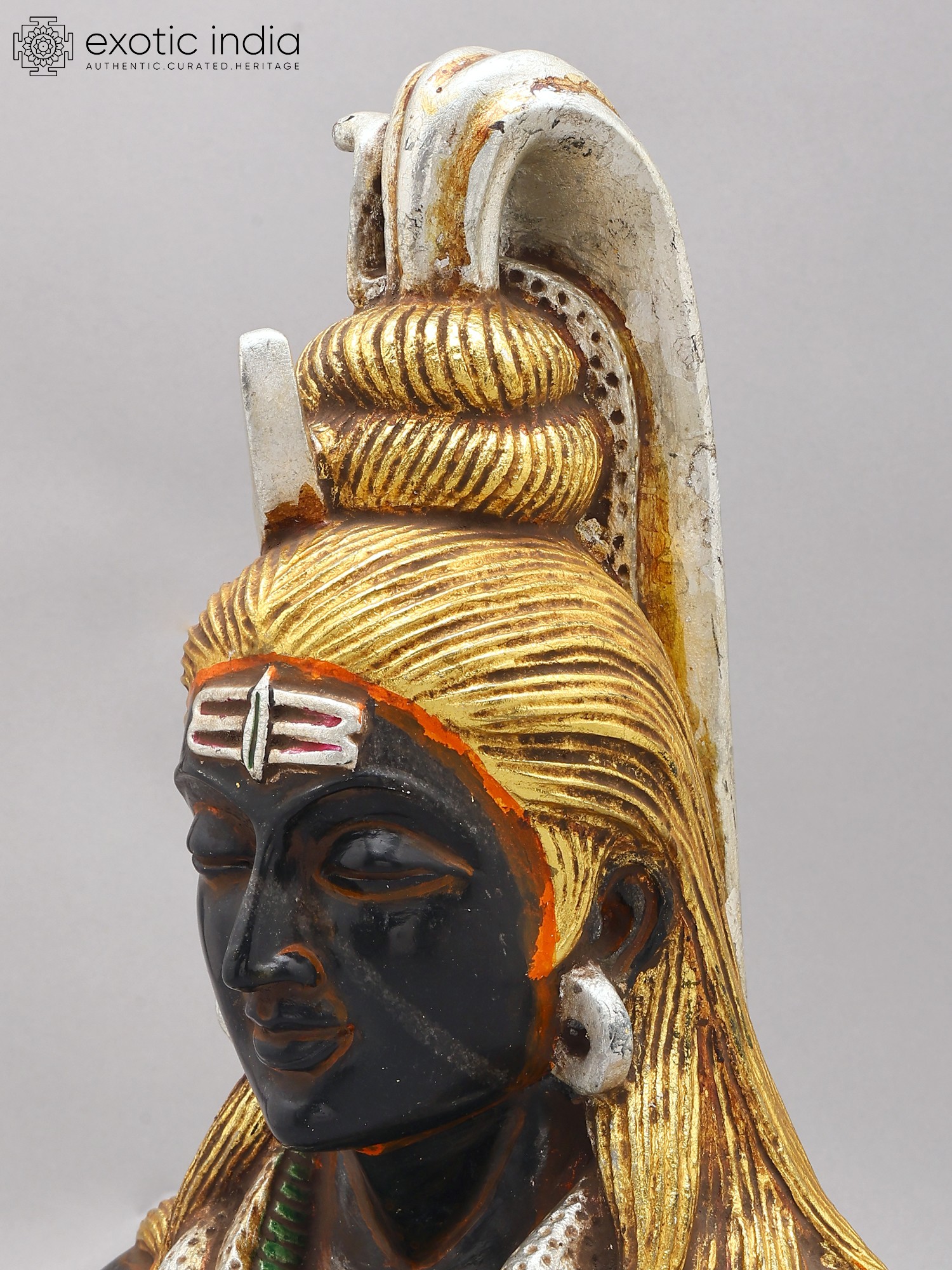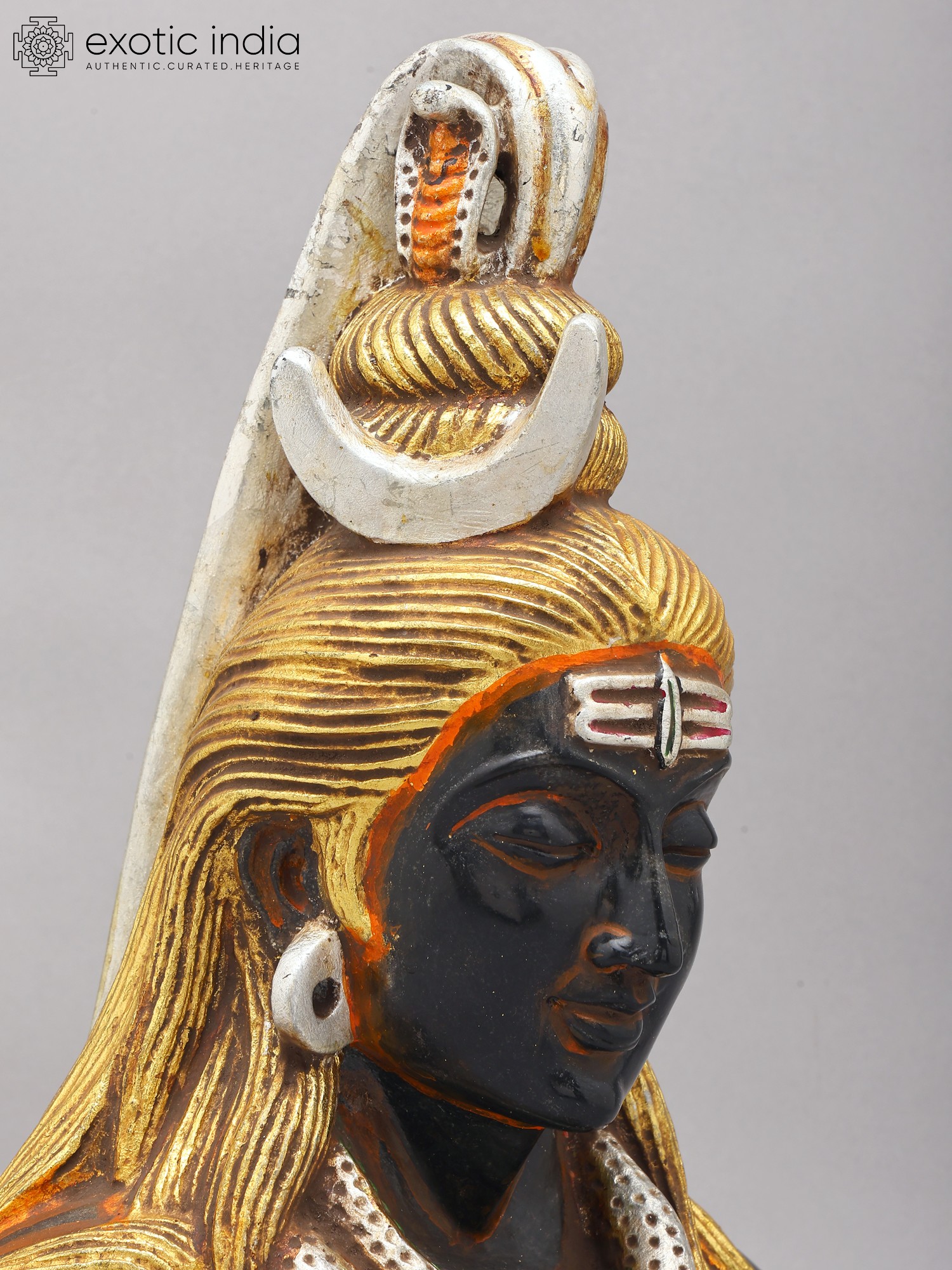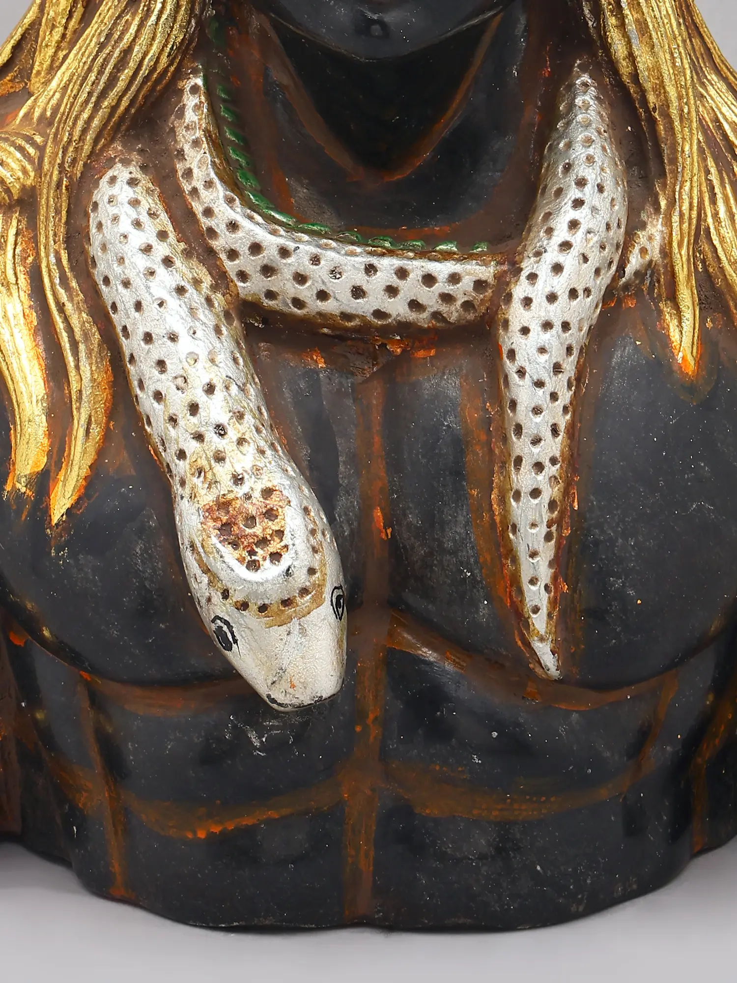 Observe the captivating details, from the divine third eye gracing the forehead to the flowing locks adorned with gold and silver accents. The coiling serpent around the neck, a powerful symbol of transformation and cyclical time, is rendered with remarkable realism. The contrasting deep black finish, highlighted by rich gold and luminous silver embellishments, creates a visual symphony that captivates the eye. Standing approximately 17 inches tall, its commanding presence is balanced by a thoughtful 12-inch width and 7-inch depth, ensuring it commands attention without overwhelming its surroundings.