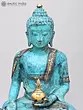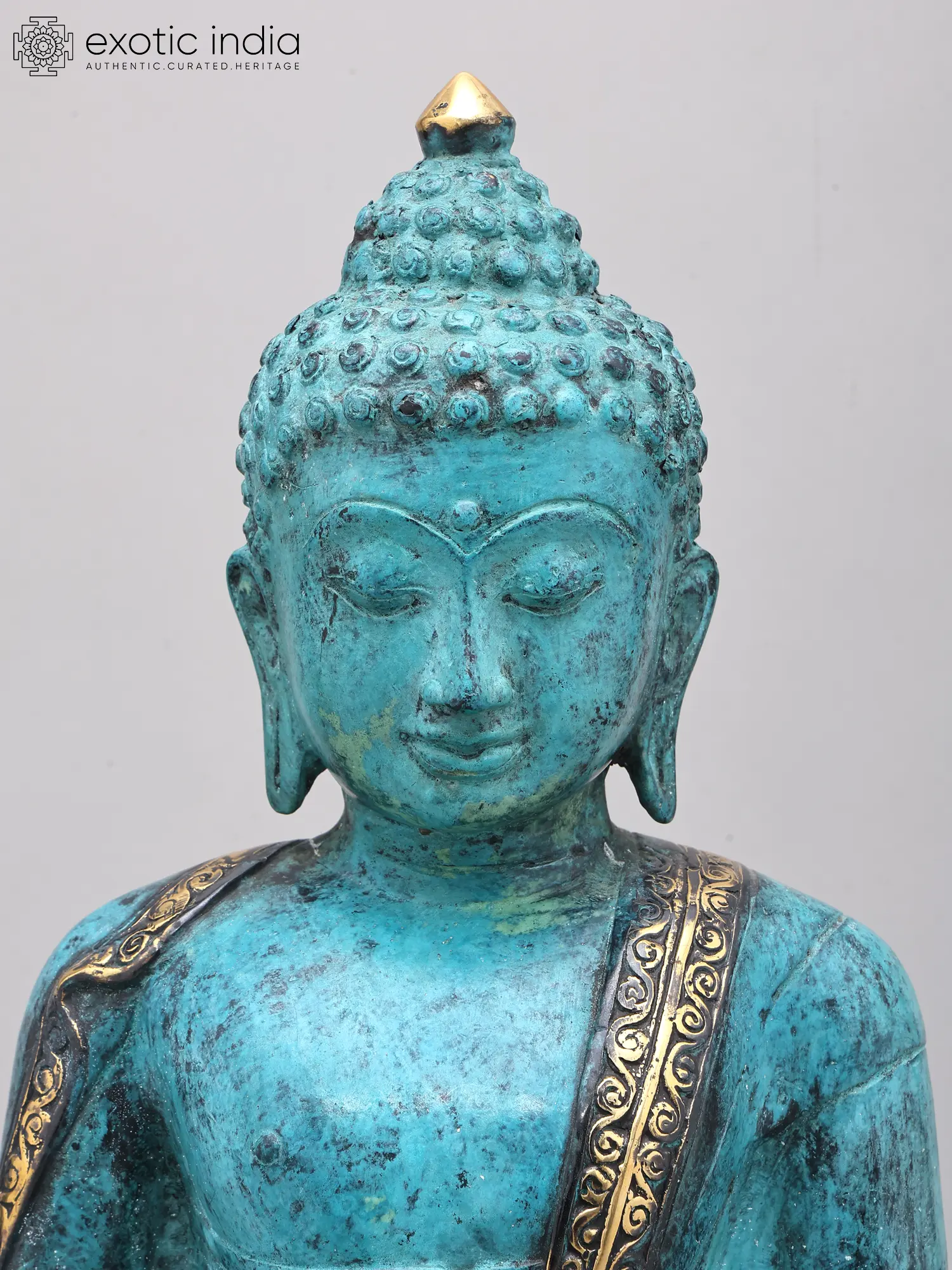 This masterful sculpture is brought to life through the intricate lost-wax casting method, a time-honored technique renowned for its ability to capture the finest details and produce exceptionally durable artworks. The brass, transformed by skilled artisans, displays a rich texture that enhances the visual appeal of the turquoise patina. The meticulous application of this unique patina creates a vibrant, aged aesthetic that speaks to the sculpture's spiritual depth and artistic merit. The Buddha rests upon a sturdy, polished wooden base, providing a stable and elegant foundation that complements the metallic artistry. This combination of materials and traditional craftsmanship ensures a piece that is not only spiritually significant but also a lasting testament to artisanal excellence.
