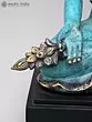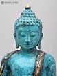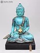 This exquisite statue embodies the profound grace and healing power of the Medicine Buddha, also known as Bhaiṣajyaguru. Seated in a meditative posture, the figure emanates an aura of profound peace and compassion. The striking turquoise patina, reminiscent of precious lapis lazuli, evokes the celestial realms and the divine energy associated with this revered Bodhisattva. Gold accents trace the intricate folds of the Buddha's robes and adorn his serene countenance, adding a touch of opulence and highlighting the sacredness of the representation. The Medicine Buddha is revered as the master of medicine, possessing the ability to alleviate suffering from physical and mental ailments. In Buddhist lore, he is said to have made twelve great vows, including the vow to heal all beings who are sick, to guide them towards enlightenment, and to free them from the cycle of rebirth. His practice is often invoked for purification, healing, and the overcoming of obstacles on the spiritual path. His tranquil gaze and gentle demeanor invite contemplation and inspire hope in those seeking solace and well-being.