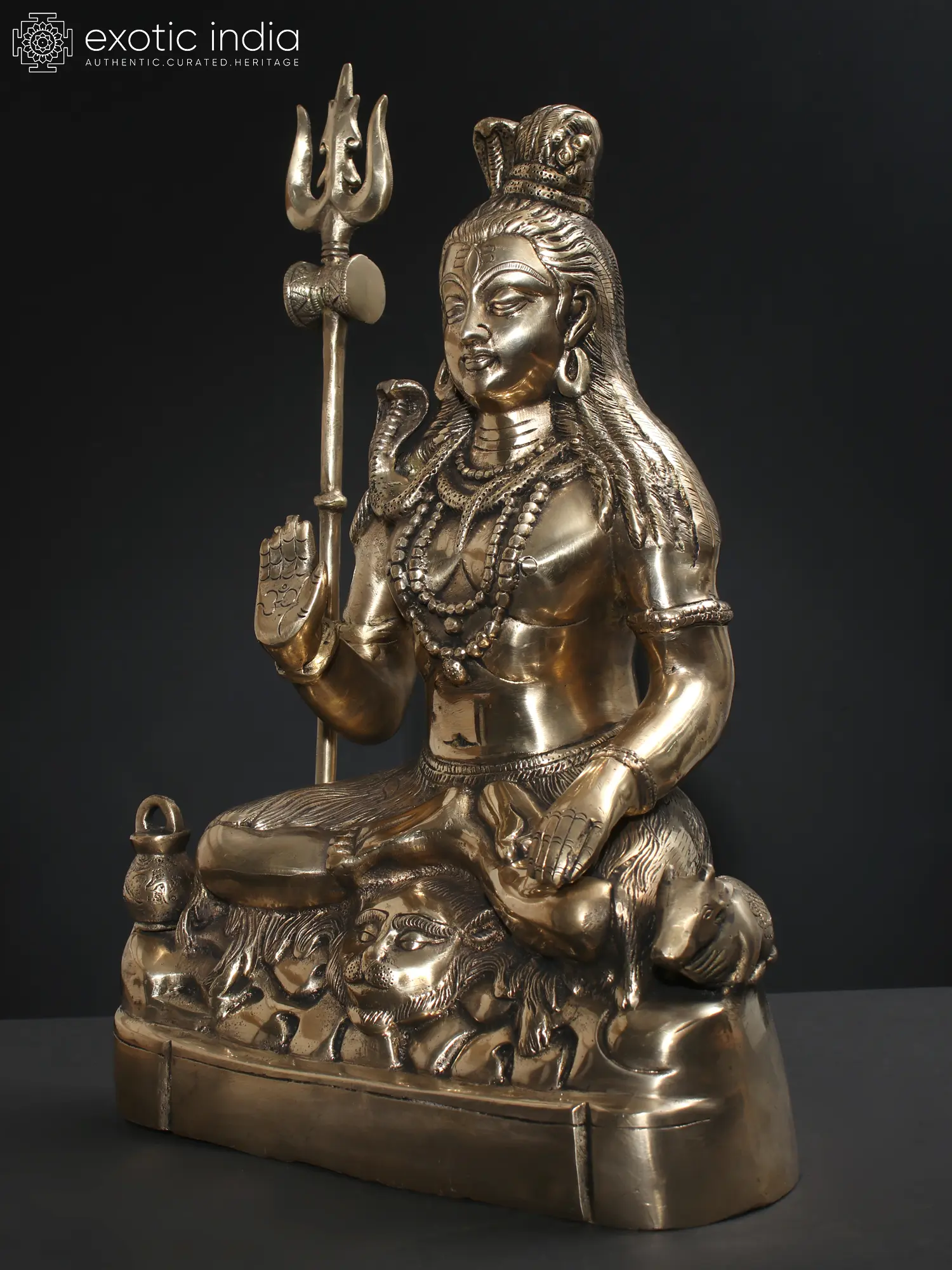 sits on a tiger skin and a Trishul is placed beside him. There are snakes