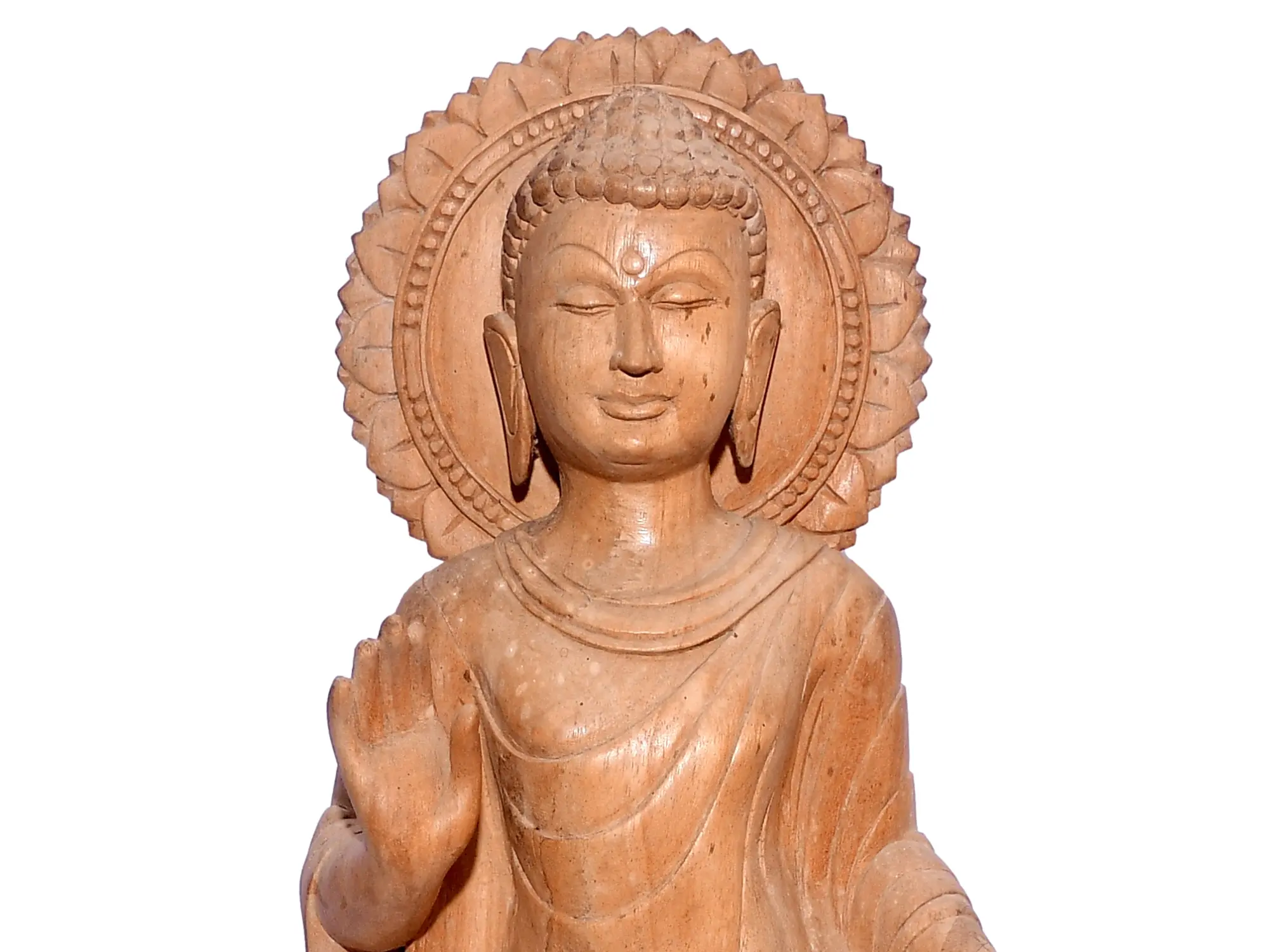 The calm presence of the Standing Buddha is a representation of Lord Buddha standing straight and exuding compassion, enlightenment, and peace. The Standing Buddha represents courage, protection, and peace with one hand raised in the abhaya mudra (fearlessness) and the other hand at his side.