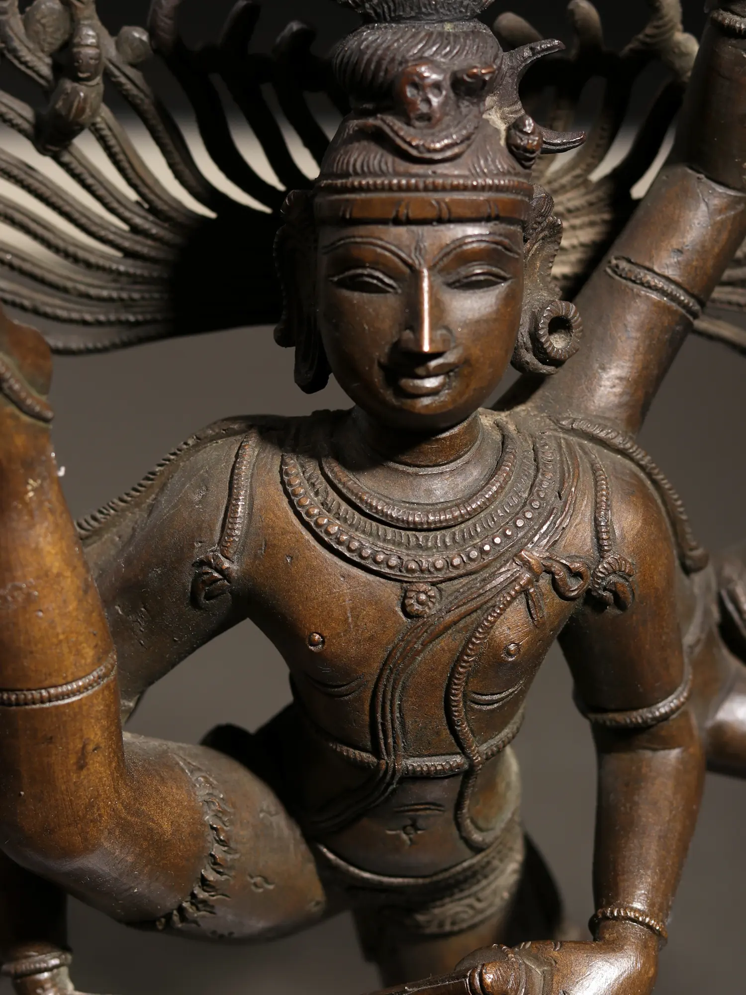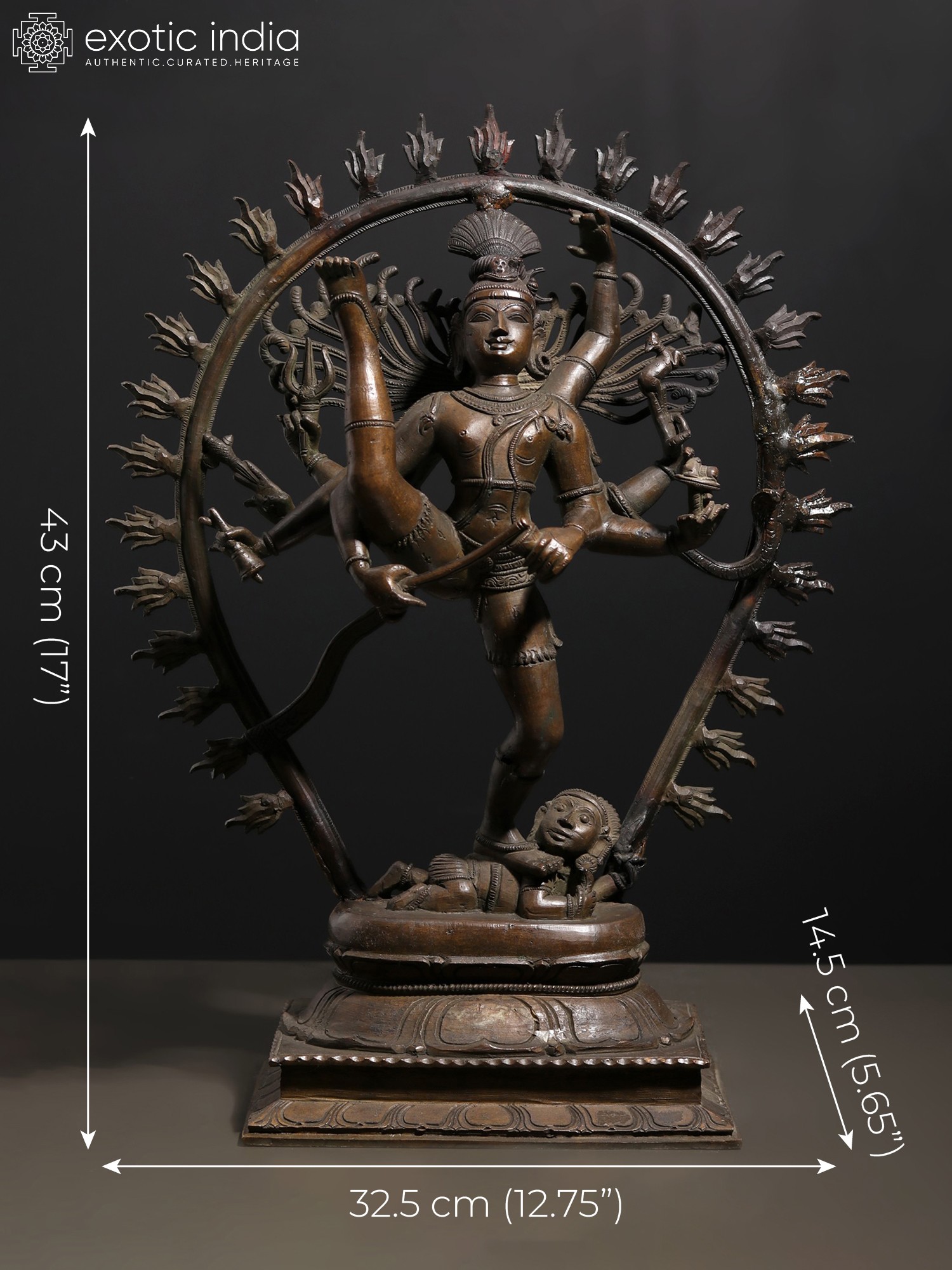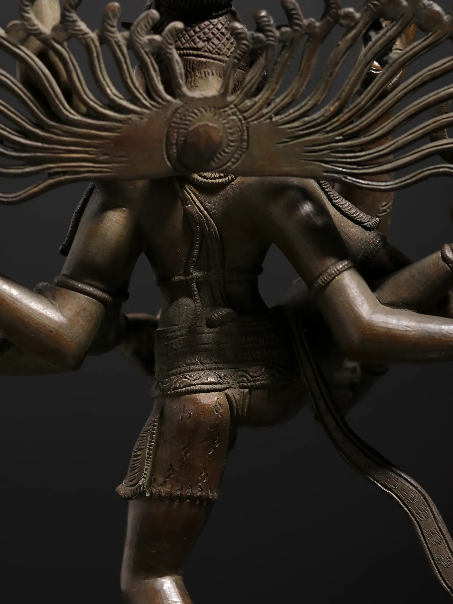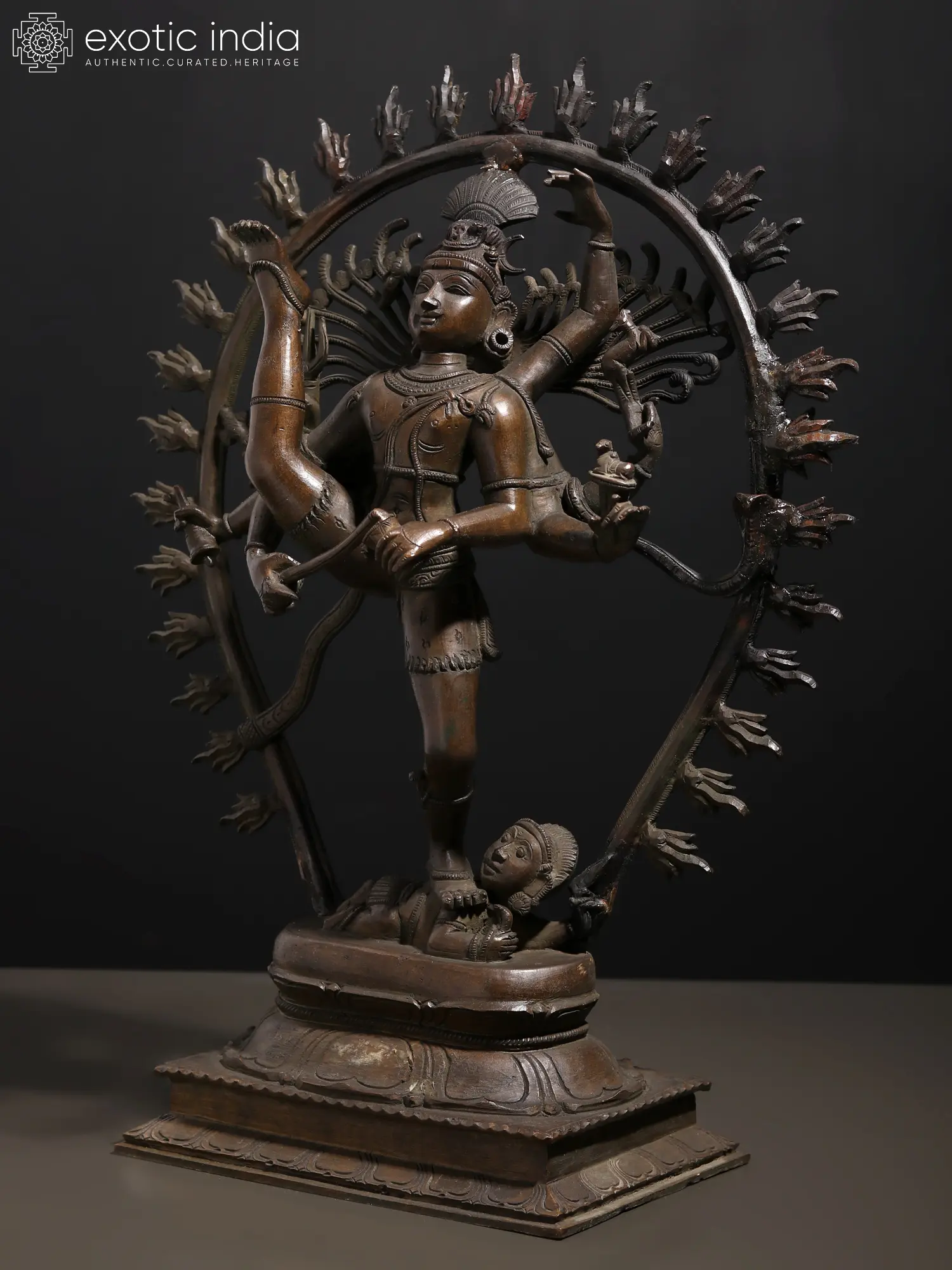 In the Nritya sabha of Chidambaram temple, a statue of Urdhva Tandava Shiva is depicted with heavenliness, along with goddess Kali, whom Shiva defeated in a battle of dance, by striking the enthralling pose of Urdhva Tandava. This majestic bronze statue of Nataraja recreates the aura of Urdhva Tandava, representing Shiva within an aureole of fire, standing atop Apasmara, in his Shadabhuja or six-armed roopa. One leg extended toward the sky and the other rooted on the ground, Shiva beats his drum, creating an ambiance of dynamism and energy, which flows from the murti into the atmosphere.