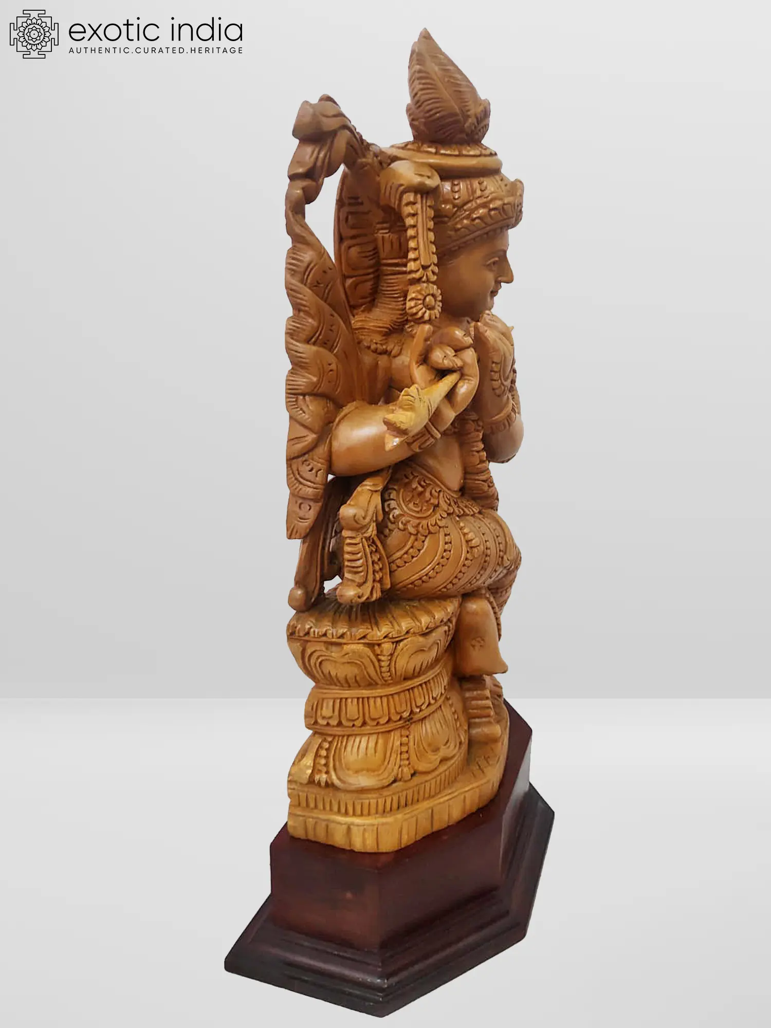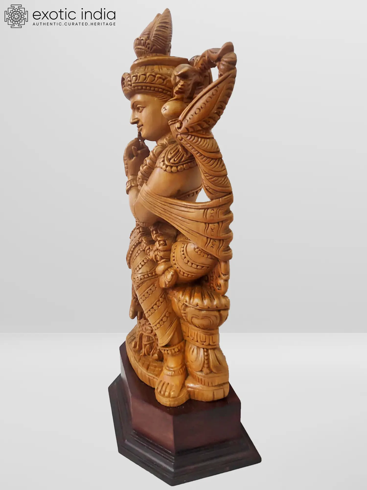 This Wood Sculpture is a manifestation of the Tribhanga Murari Krishna form. Here Lord Krishna is not typically standing but is sitting in the Tribhanga pose. The statue is made of White Wood and is magnificently crafted. The ornamentation and attire are so magnificently carved that it looks almost real. The face of Lord Krishna is also very beautifully made with a half-smiling expression which is also known as the expression of tranquility. The natural wood finish imparts authenticity, infusing warmth into the sculpture. Resting on a stable base, it radiates tranquility and spiritual grace.