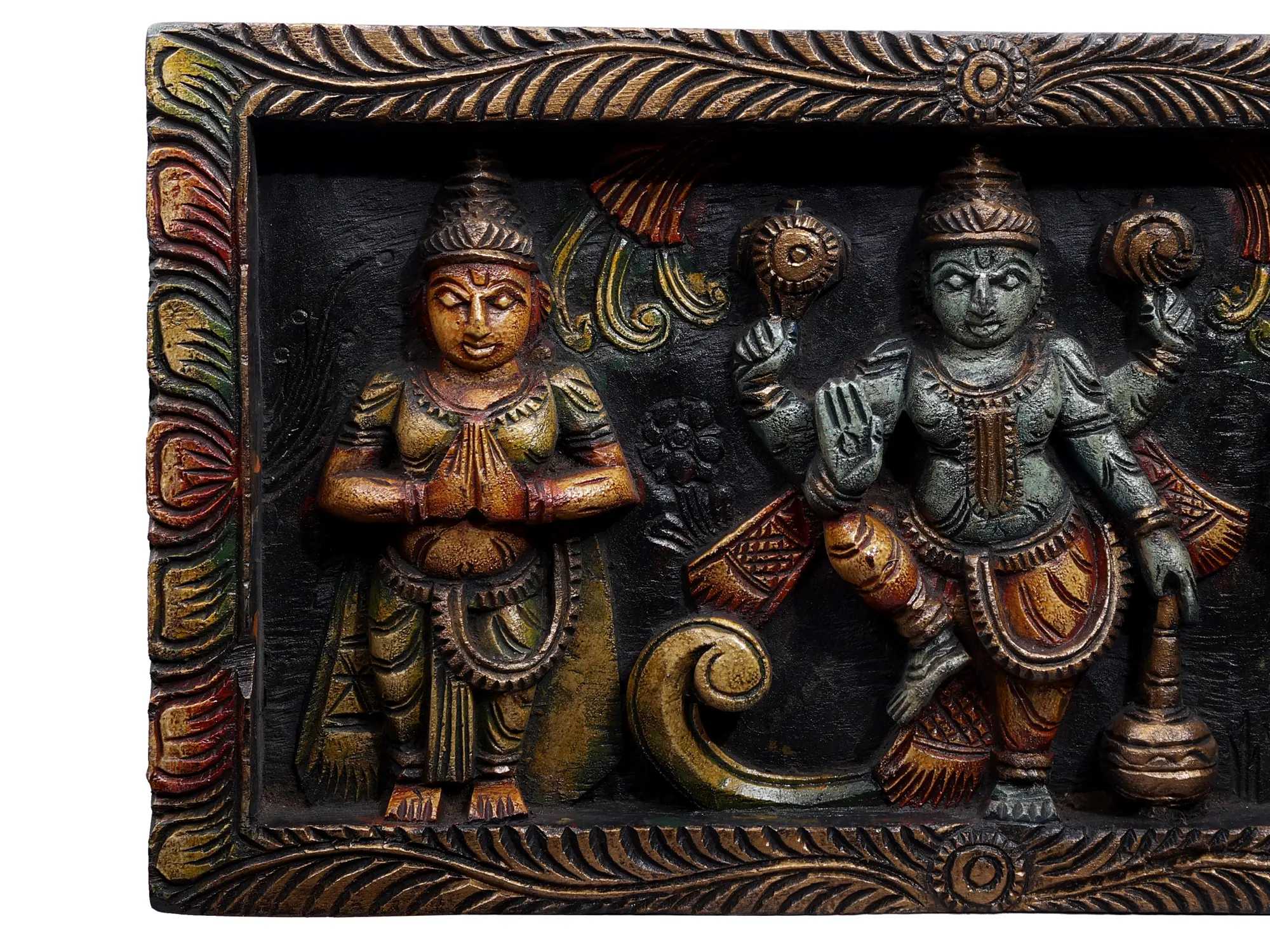 This captivating piece is meticulously hand-carved from wood, a medium that has been revered for centuries in Indian art and spirituality for its warmth and ability to capture intricate detail. The rich patina and vibrant, yet subtle, color palette further enhance the divine figures, bringing them to life with an ancient charm. The ornate frame, also carved from wood, adds to the panel's aesthetic appeal and ensures its prominence as a decorative and spiritual centerpiece in any home or sacred space. The traditional motifs and detailing speak to the skilled craftsmanship and deep cultural understanding of the artisans who brought this divine vision to fruition. It's a timeless piece that bridges the gap between artistic expression and profound spiritual devotion.