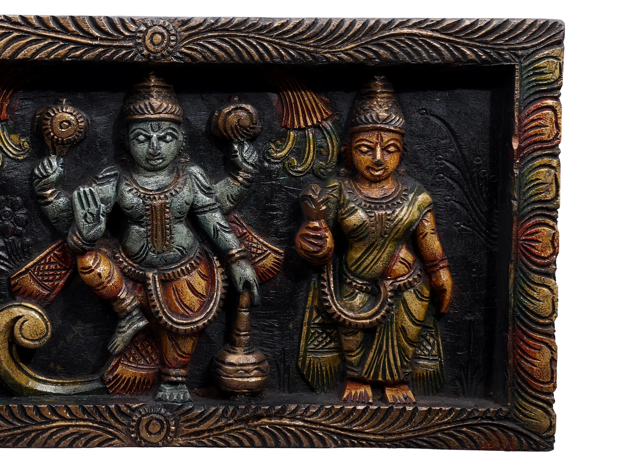 Lord Vishnu is a central deity in Hinduism, revered for his role in maintaining cosmic order and protecting the universe. In Hindu mythology, Vishnu is believed to descend to Earth in various avatars to restore dharma and vanquish evil. The presence of Sridevi and Bhudevi signifies that true prosperity and fulfillment are achieved through devotion to Vishnu and the embrace of earthly blessings. This wall panel is more than just a decorative item; it is an invitation to invite divine grace, prosperity, and peace into your life. It serves as a constant reminder of the omnipresent divine and the virtues of balance, wealth, and earthly abundance. Displaying this panel is an act of devotion, seeking the blessings of Lord Vishnu and his consorts for a harmonious and prosperous existence.