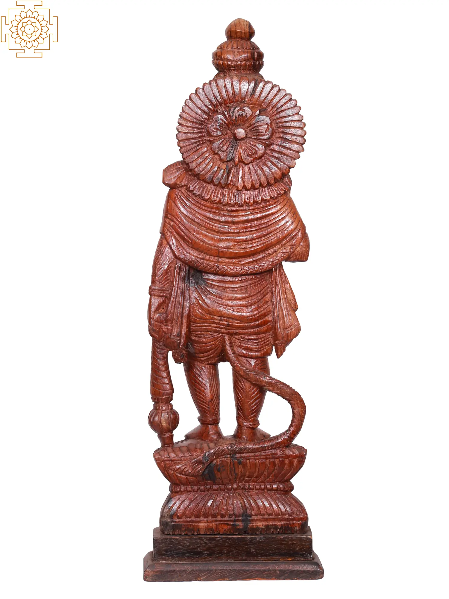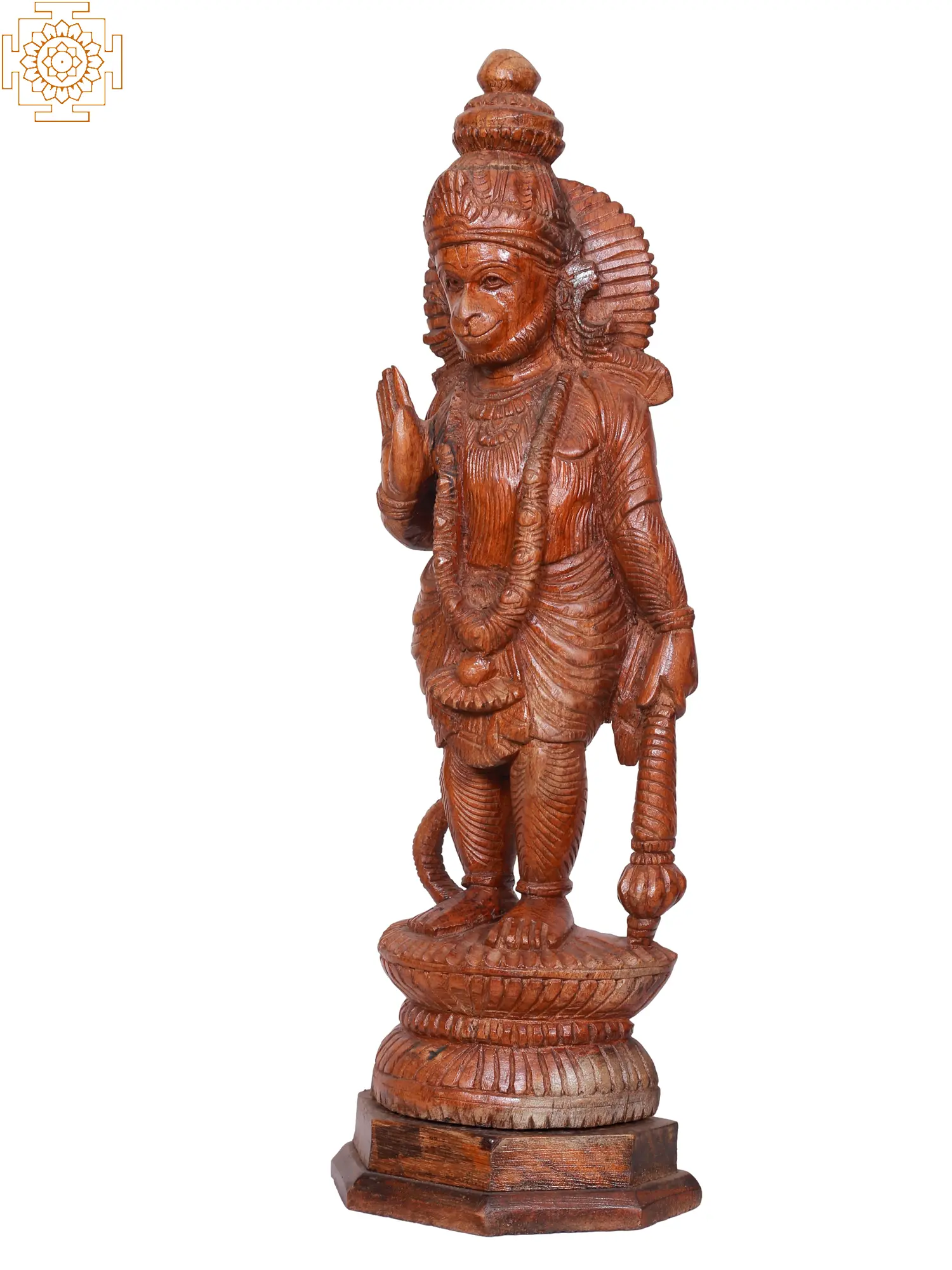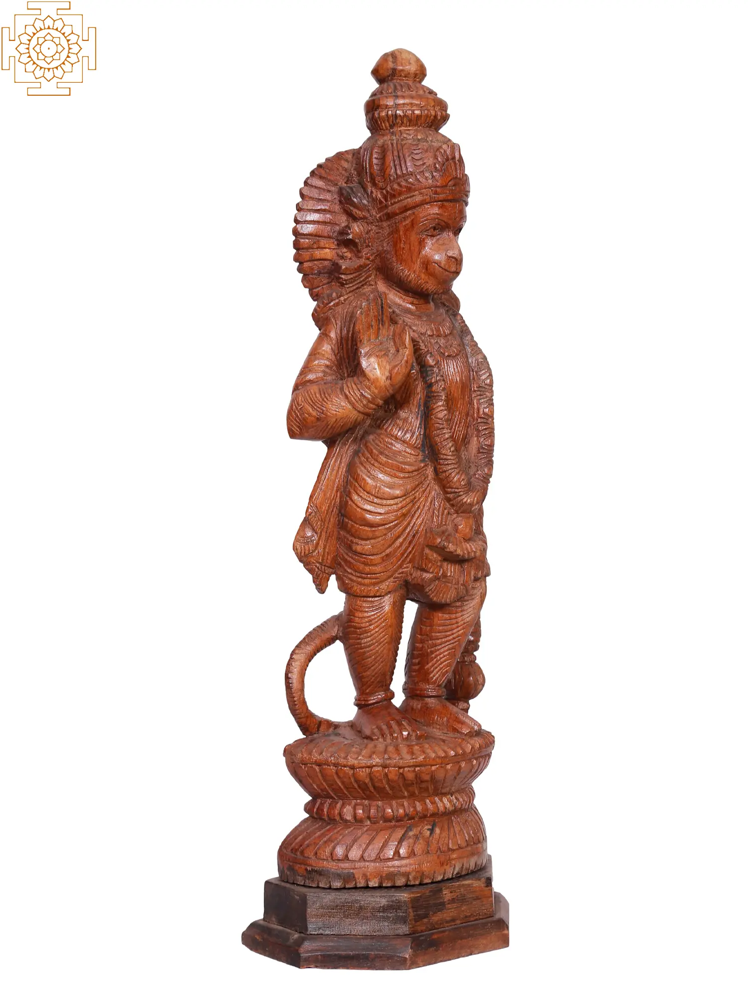 The detailed carving of this Hanuman statue showcases the dedication and talent of the artisan. From the intricate folds of his attire to the expressive features of his face, every element is rendered with precision and care. The coiled tail, a distinctive feature of Hanuman, is elegantly sculpted, resting near his feet. His muscular physique, indicative of his immense power, is subtly conveyed through the masterful shaping of the wood. The lotus pedestal upon which he stands further enhances the divine aura of the sculpture, symbolizing purity and spiritual awakening. The warm, natural tones of the wood lend an authentic and timeless quality to the piece, making it a captivating centerpiece for your home or altar. ––––––––––