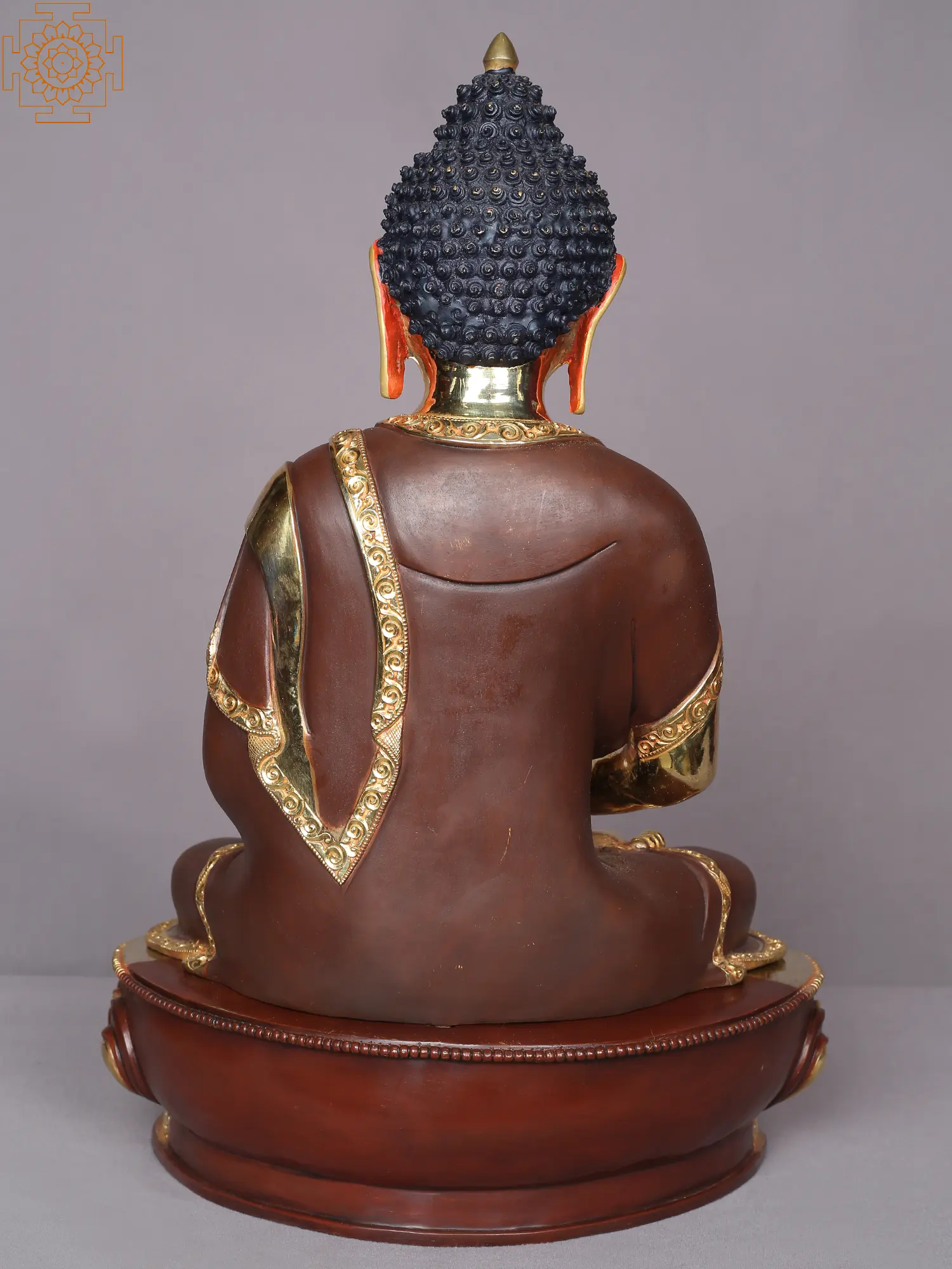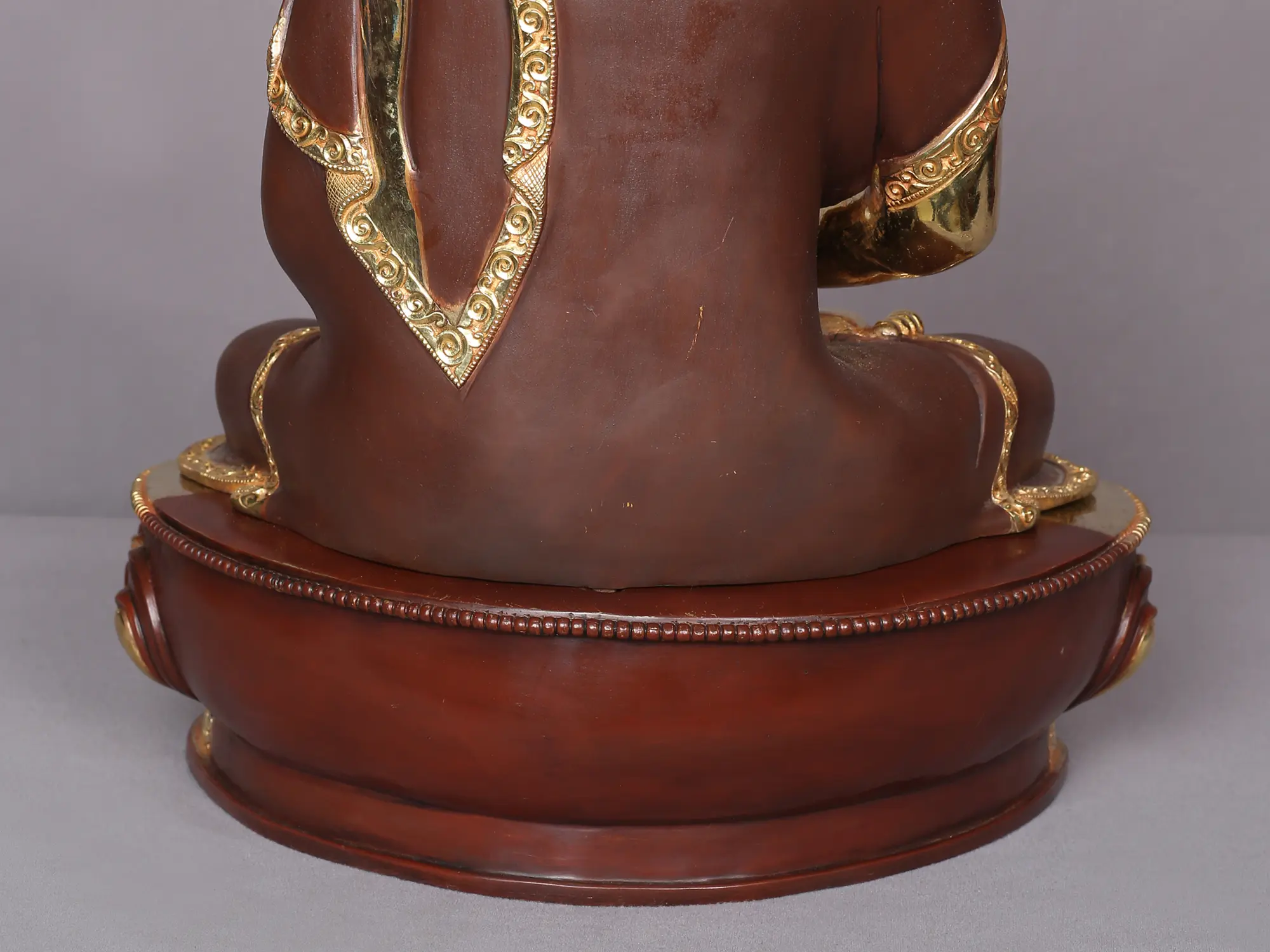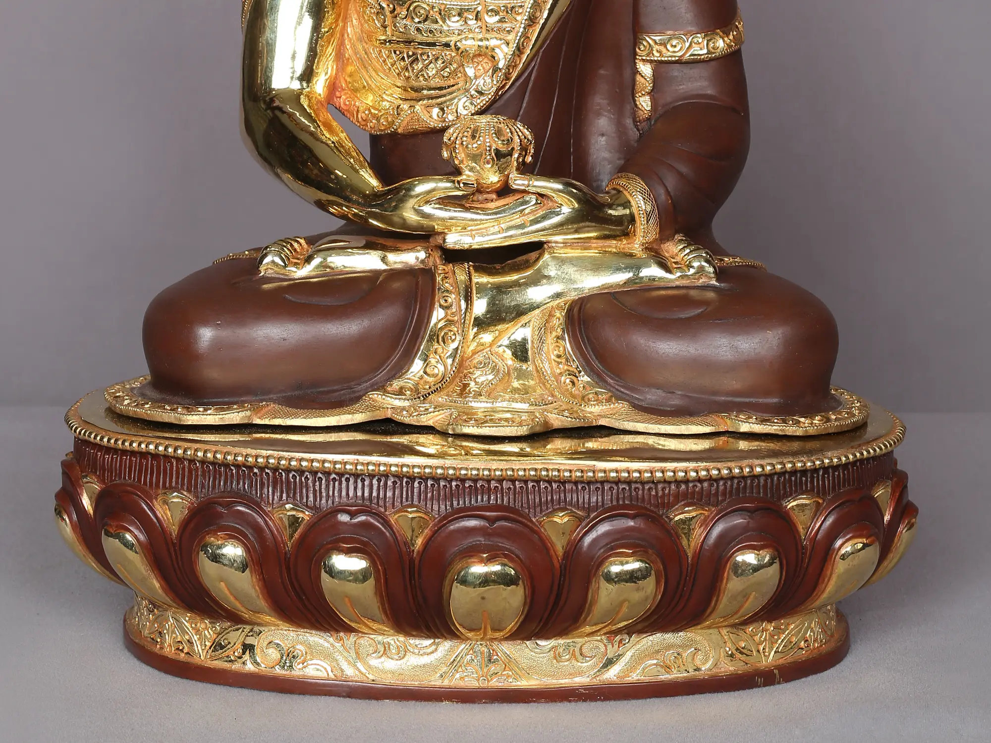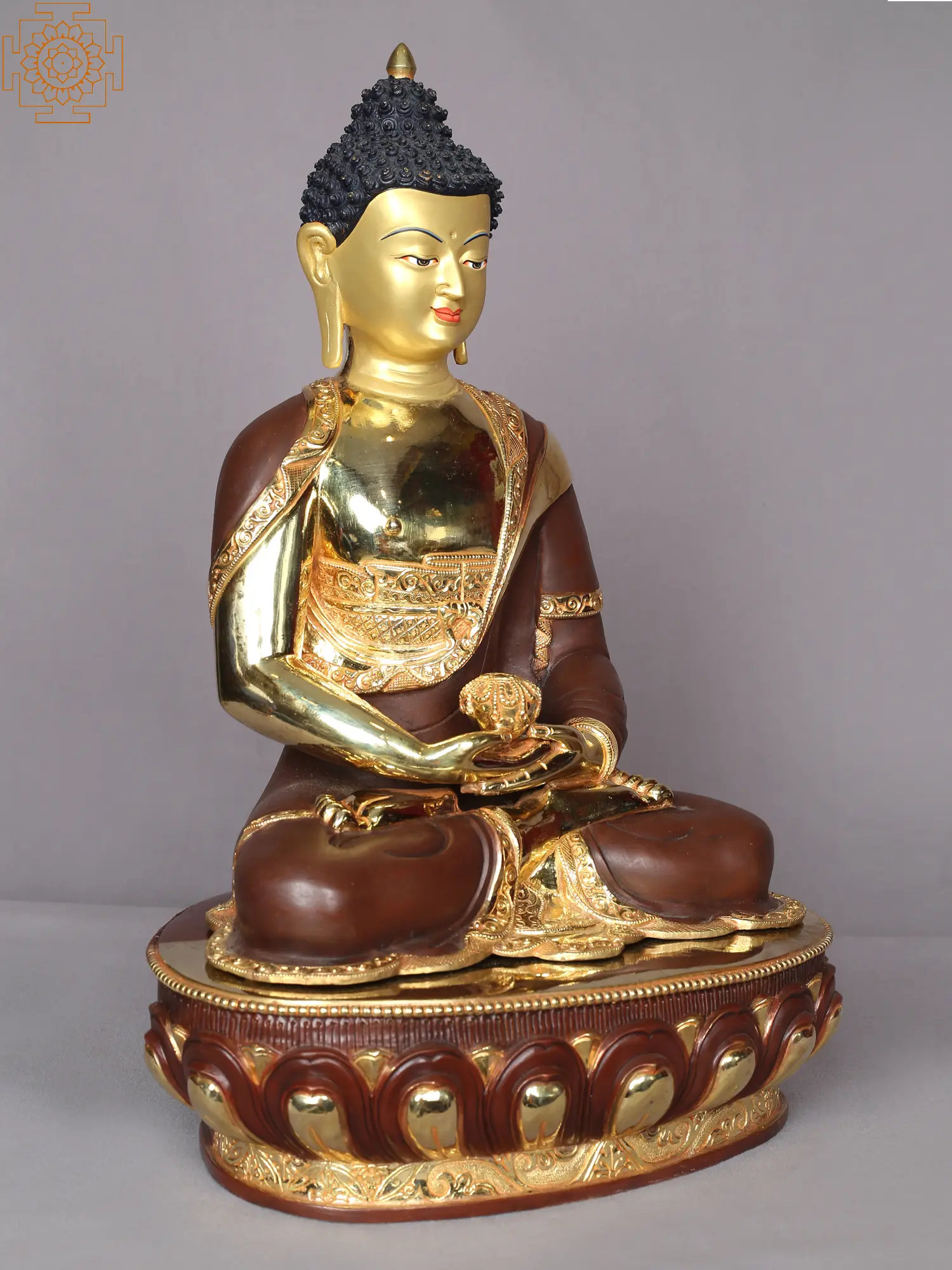 Amitabha, also known as the Buddha of Supreme Light, could not have found a more suitable portrayal than this gilded copper Nepalese statue, which has a sun-like aura on his countenance and two solar crescents in his eyes. By meditating in front of such magnificent depictions of the Buddha, the devotees of Amitabha absorb the transcendental brilliance and spiritual beauty of the Buddha. Amitabha guides his disciples into enlightenment in both the material and spiritual realms while smiling gently and holding an alms bowl in the Dhyana mudra.