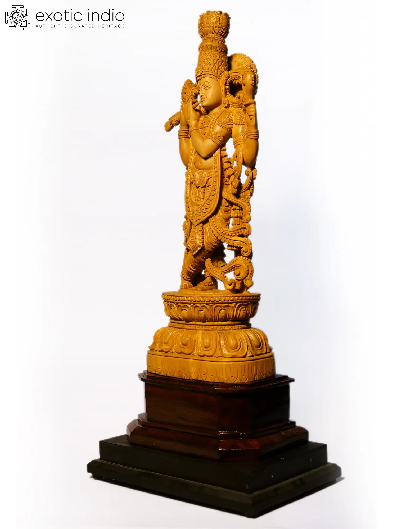 16" Lord Krishna Standing on Lotus Pedestal Playing Flute | Sandalwood Carved Statue