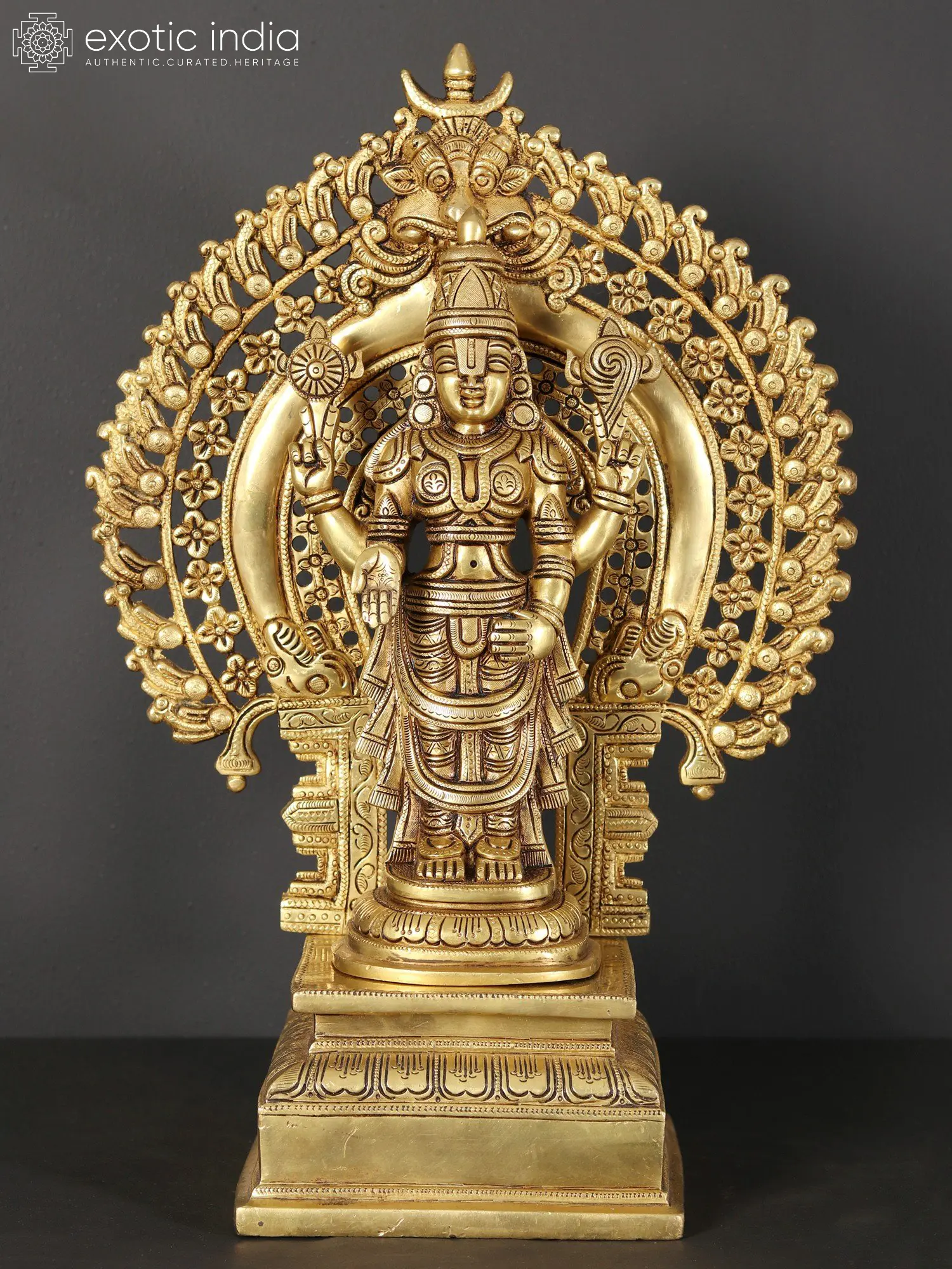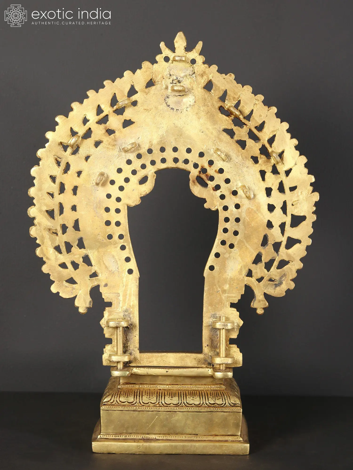 The Brass Kirtimukha Throne holds deep symbolic significance as a majestic seat for your favourite deity. Crafted with intricate designs, it exudes an aura of reverence and grandeur. The traditional look of the throne is adorned with floral motifs on a ring, representing the beauty and blossoming of spiritual devotion. The outer ring showcases intricate leaf motifs, symbolizing growth, vitality, and abundance. The presence of the Kirtimukha, a fierce mythical creature often depicted at the entrance of sacred spaces, signifies protection and the warding off of negative energies. Overall, the Brass Kirtimukha Throne serves as a sacred and auspicious seat, enhancing the divine presence of your cherished deity.