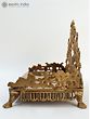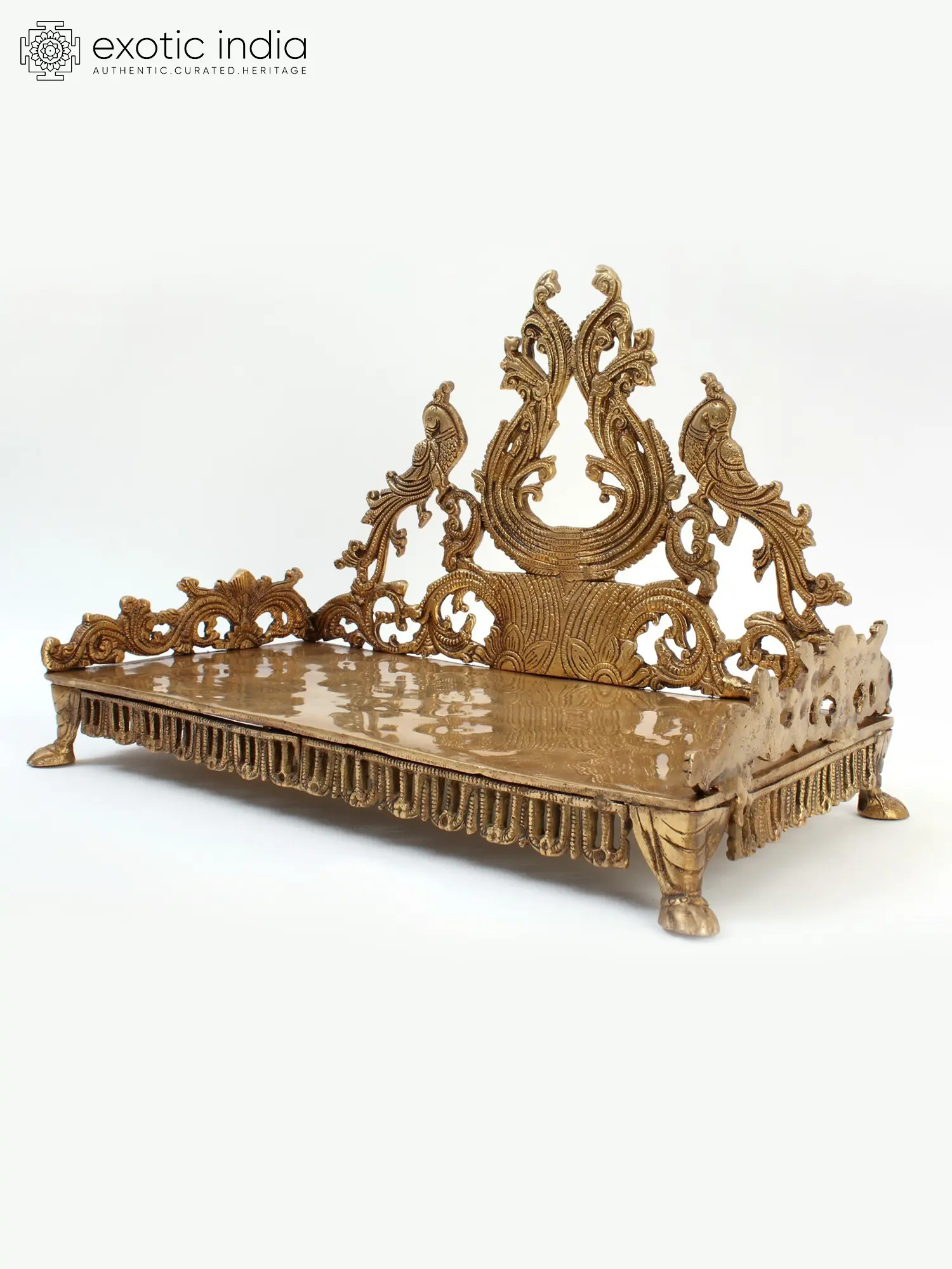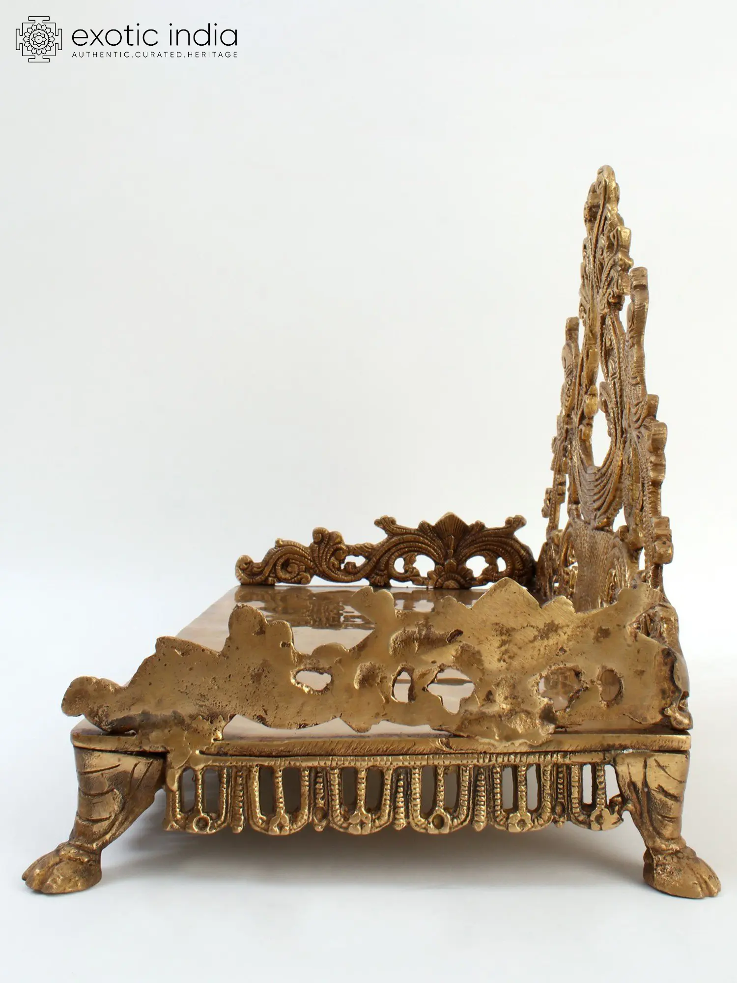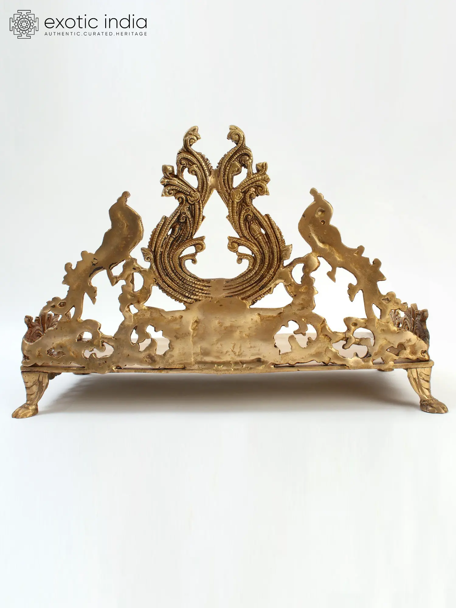Rostrums or platforms decorated with jewels are intended to provide the gods with a peaceful resting place. They are also known as Sighasan and have a royal demeanor. They got their name from an antique construction where the platform stands were constructed to look like Lion's (Singha) foot. This brass Singhasan, adorned with the sacred motif of a pair of peacocks dancing around the Hoysala-style coiled vines as the crown image, is an appropriate resting place for Gods and Goddesses. The rostrum has a traditional lion standing. Coiled vines surround the major symbols as handstands. The seat is broad and might help place many deities. This pedestal, or rostrum, is a stunning work of art that also serves as a ceremonial item.