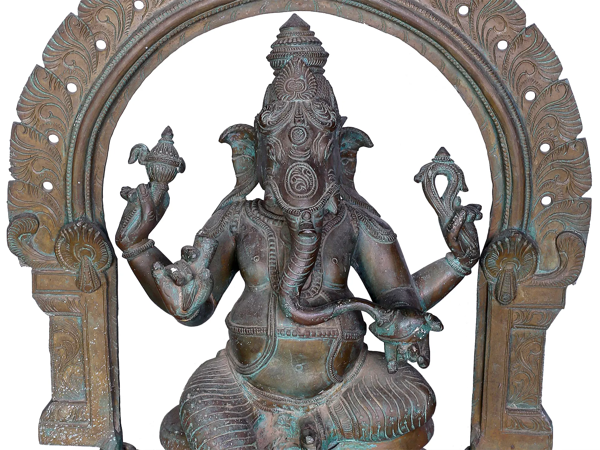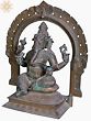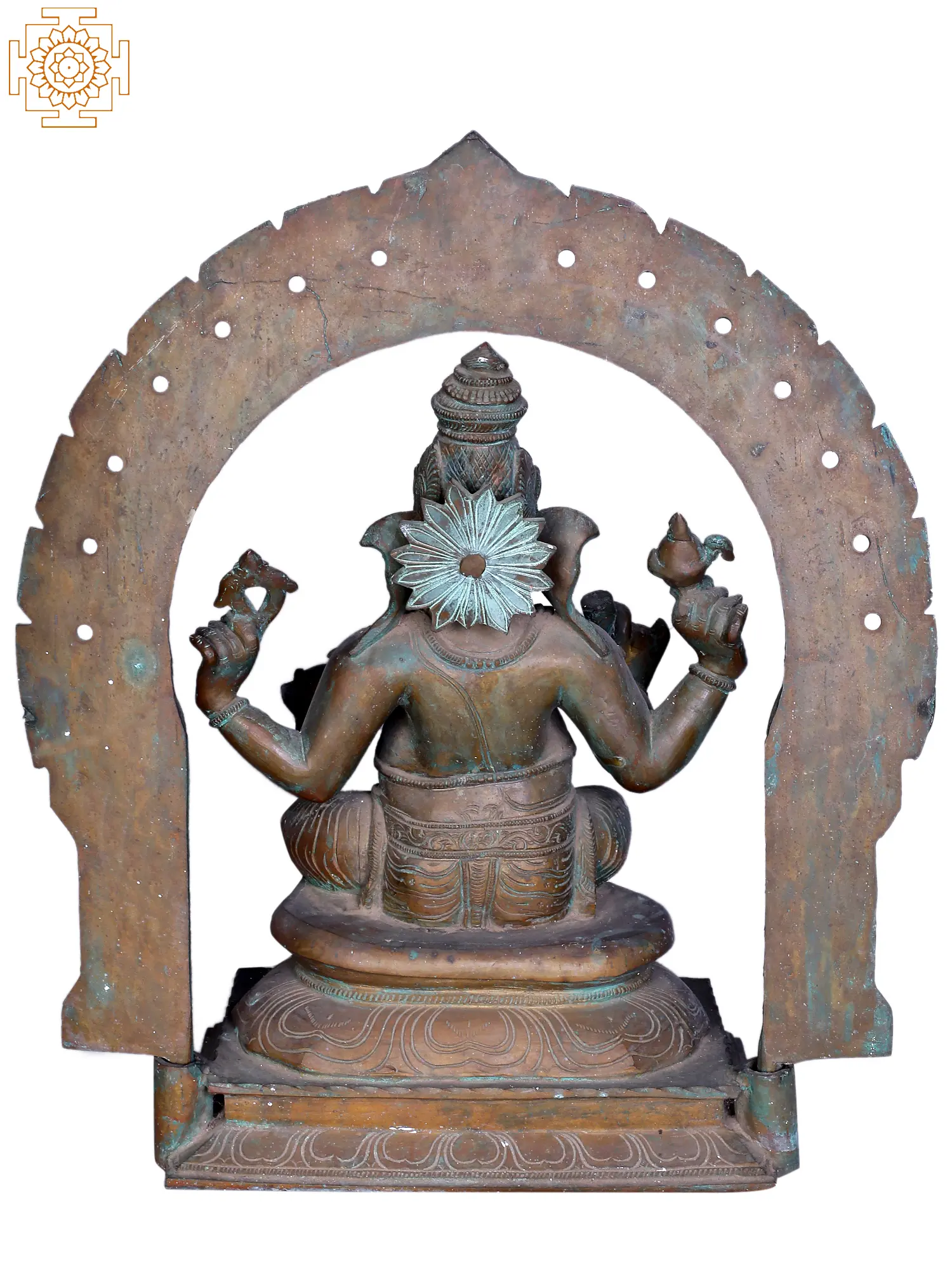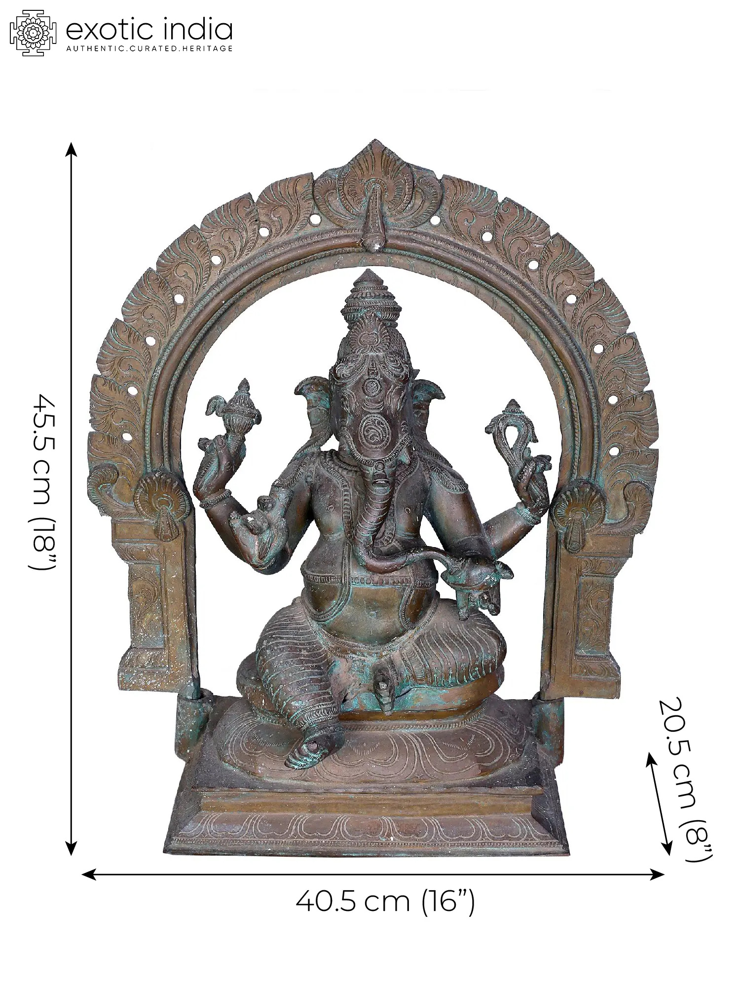 In the divine tapestry of artistic transcendence, Ganesha, also known as Bhuvanpati (the Lord of the Heaven), sits majestically on the Kirtimukha throne, a celestial symphony of symbolism. With a benevolent gaze, Ganpati cradles a goad and a noose, embodying mastery over obstacles. His broken tusk, is a testament to sacrifice for wisdom. Adorned in regal attire, his ample belly symbolises cosmic abundance. His big belly, an emblem of cosmic abundance, conceals profound mysteries. Amidst this celestial tableau, the Elephant God indulges in the sweetness of “Modak”, invoking joy and fulfillment. Crafted using the ancient “Madhuchista Vidhana (Lost-Wax) technique”, this “Panchaloha Bronze”, masterpiece encapsulates Ganesha’s multifaceted essence—obstacle remover, cosmic monarch, and harbinger of blissful beginnings, inviting you to transcend mundane realms and savour the divine nectar of life.