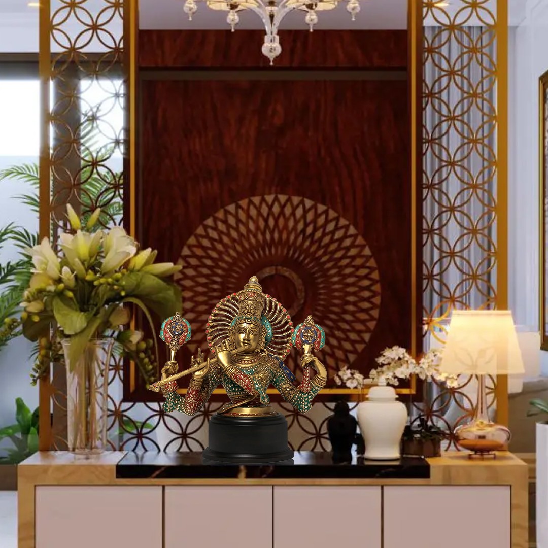 14" Black and Gold Lord Venugopal (Krishna) Playing Flute with Cow | Brass Statue