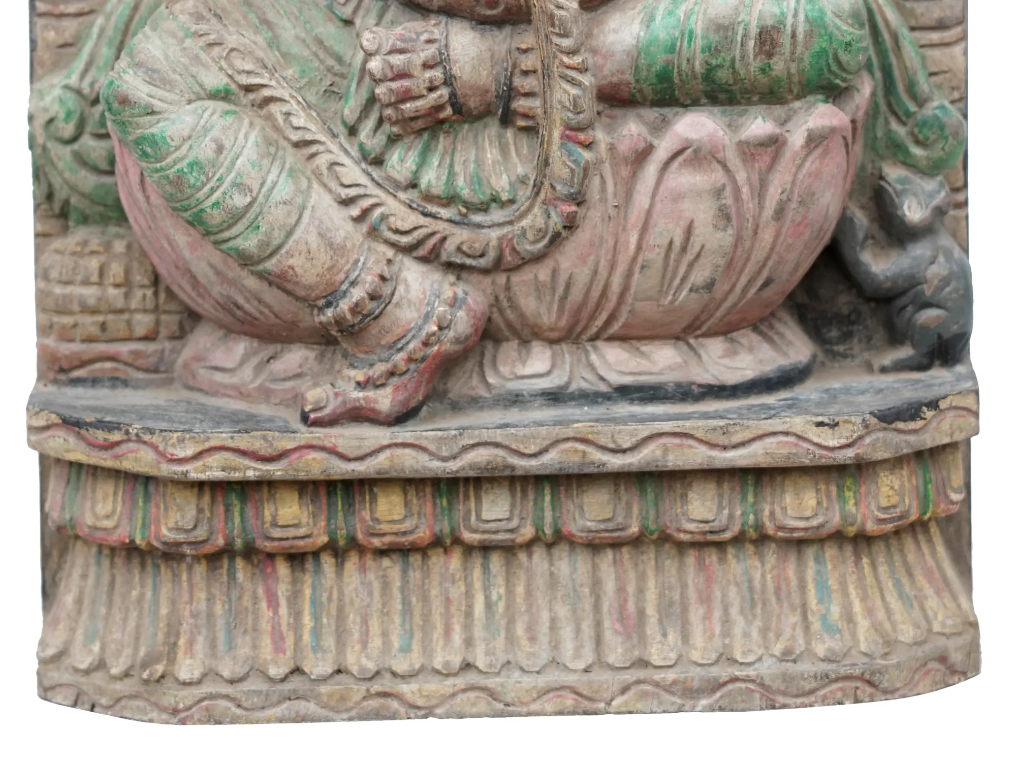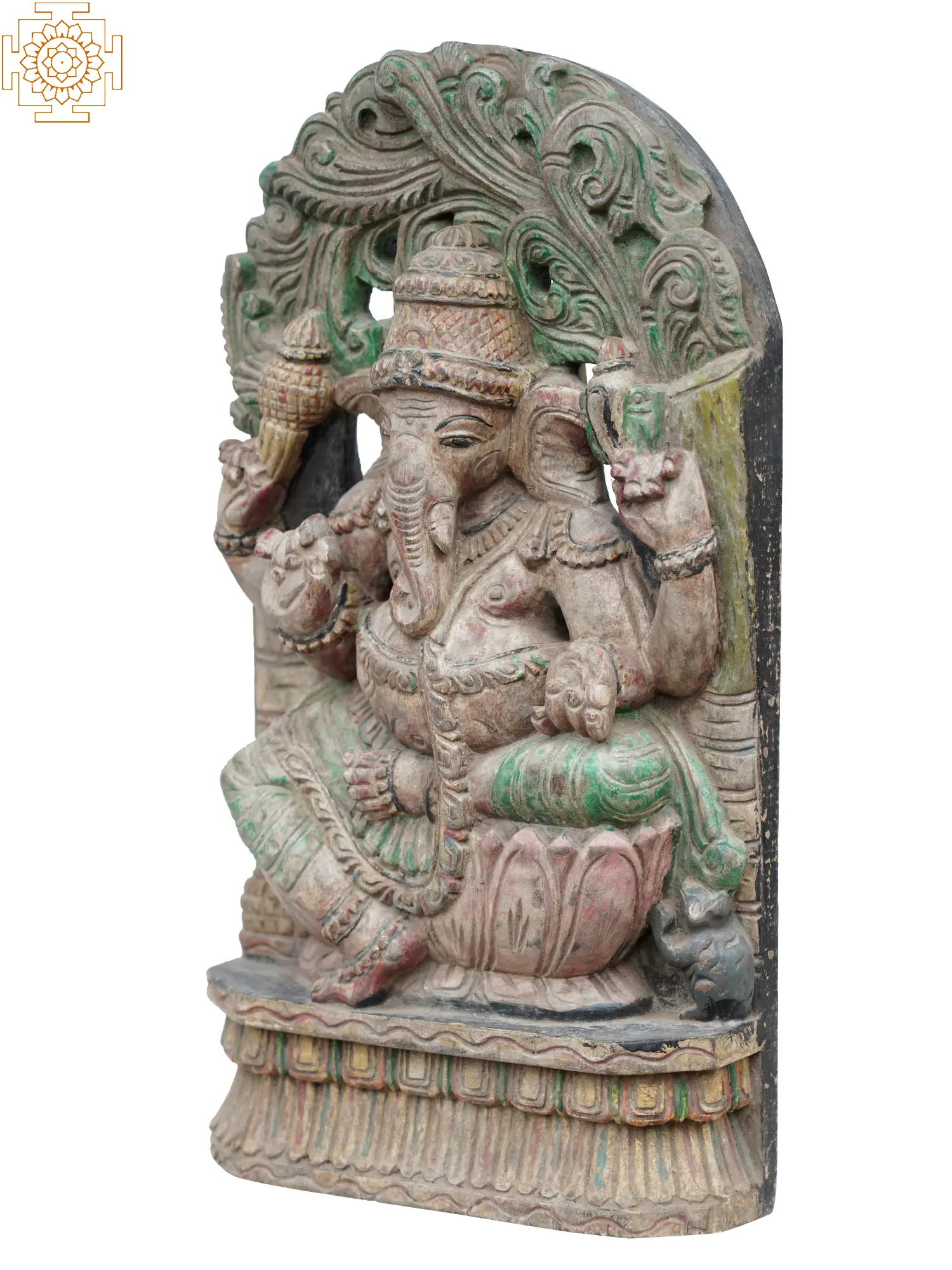 The most auspicious and benevolent son of Uma and Shiva, Lord Ganesha for his devotees is the manifestation of the Kalpataru- the wish-granting tree that fulfills all the desires, worldly or spiritual. Inspired by the majesty of Ganesha, this wooden statue of Ganpati presents him under a bustling vine, a symbol of Kalpataru or Kalpavriksha in art. Beautifully adorned, Ganesha is in his Chaturbhuja or four-armed form, with a green dhoti, towering crown, and Tripunda amplifying his divine aura.