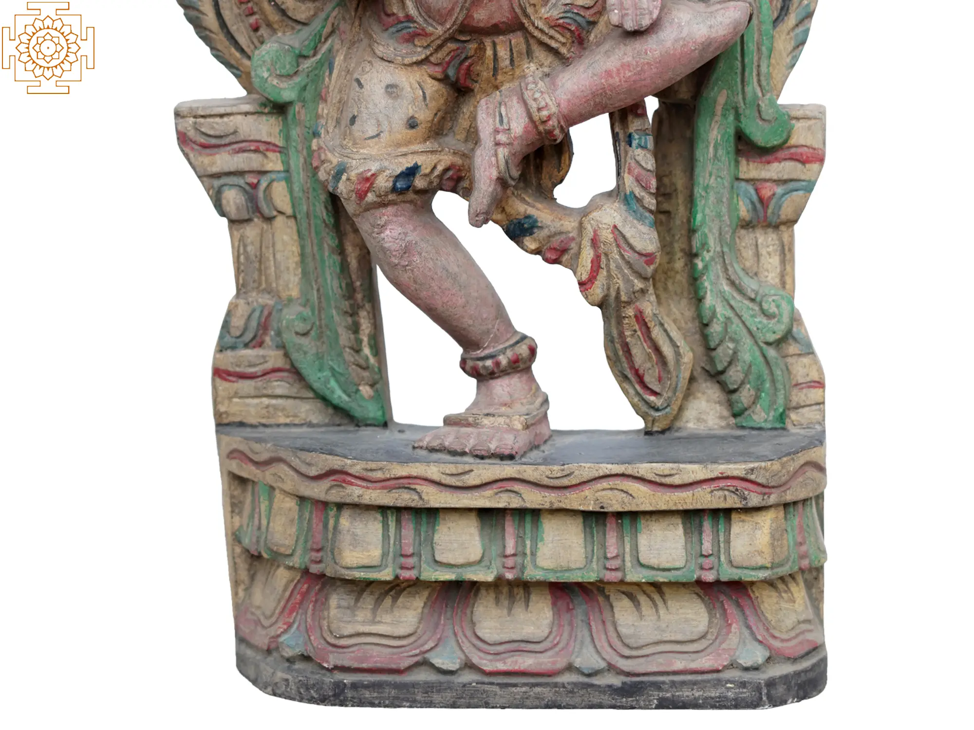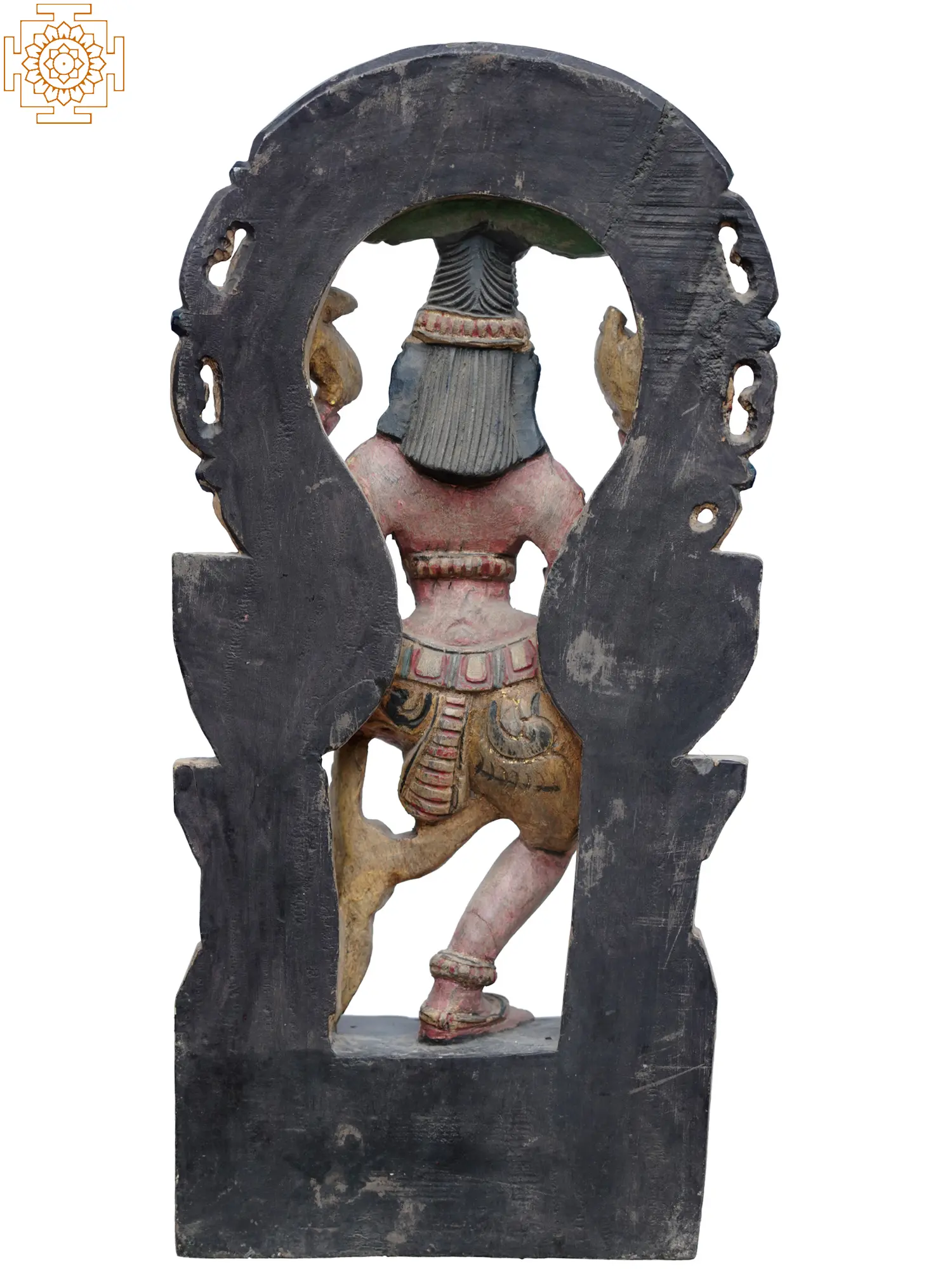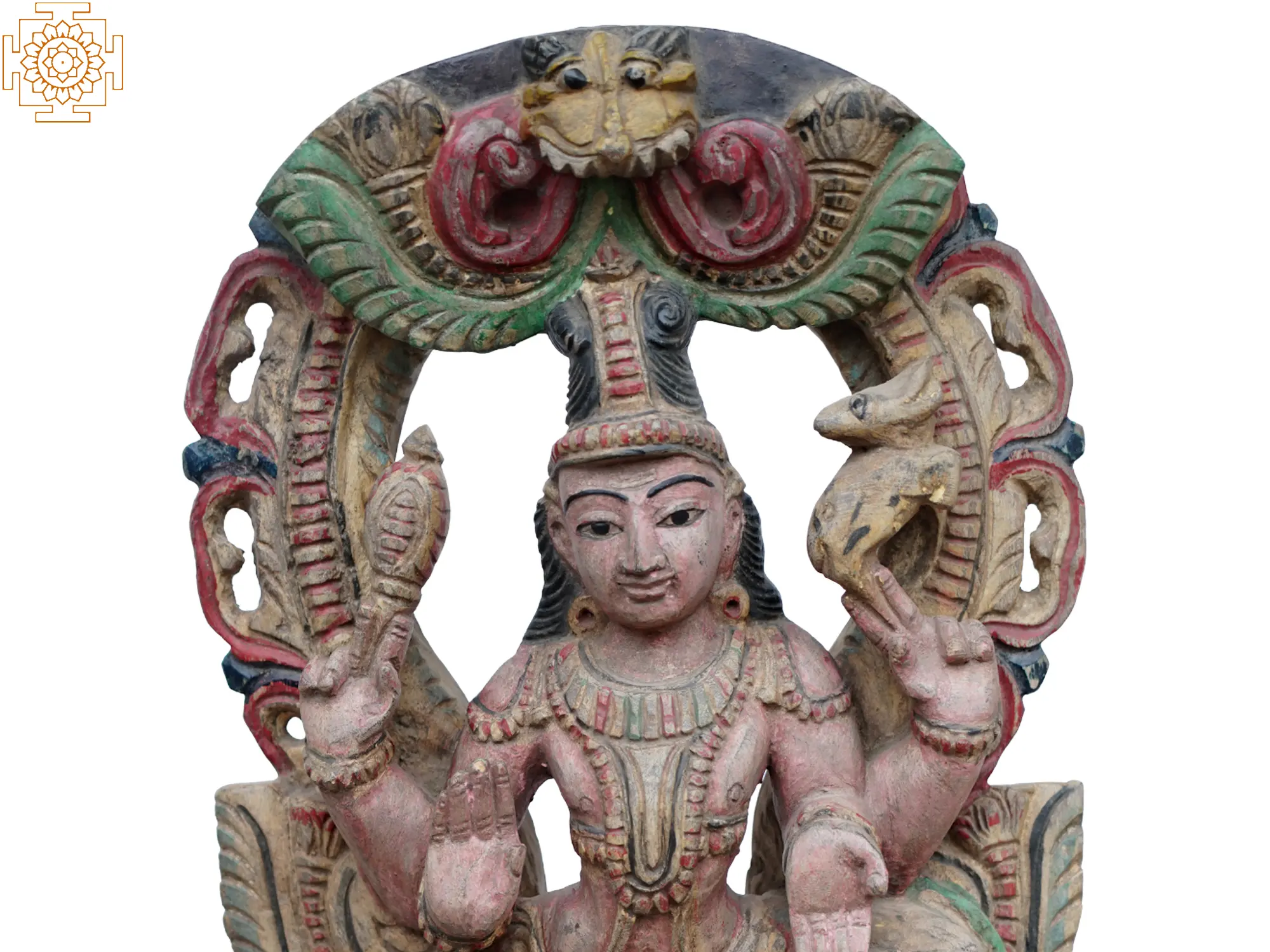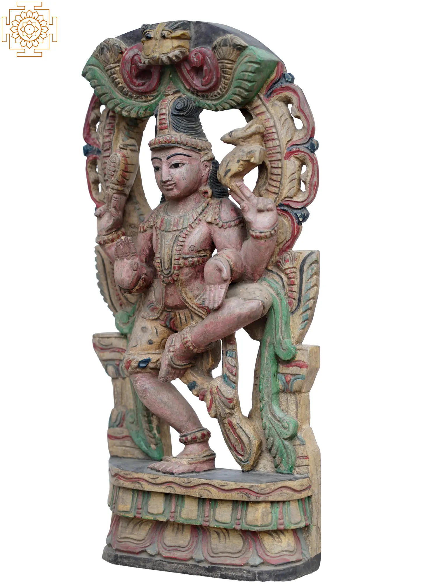 The dance of Shiva is an ancient symbol of divine activity and cosmic motion in Hinduism. In this wooden statue, instead of the more popular Nataraja or the Lord of Dance iconography, Shiva strikes a unique and graceful dancing pose, lifting his right leg in the air. Shiva is in his Pashupati form, holding the goad (ankusha), Pashu (antelope or deer), and the gesture of giving boons and removing fear.