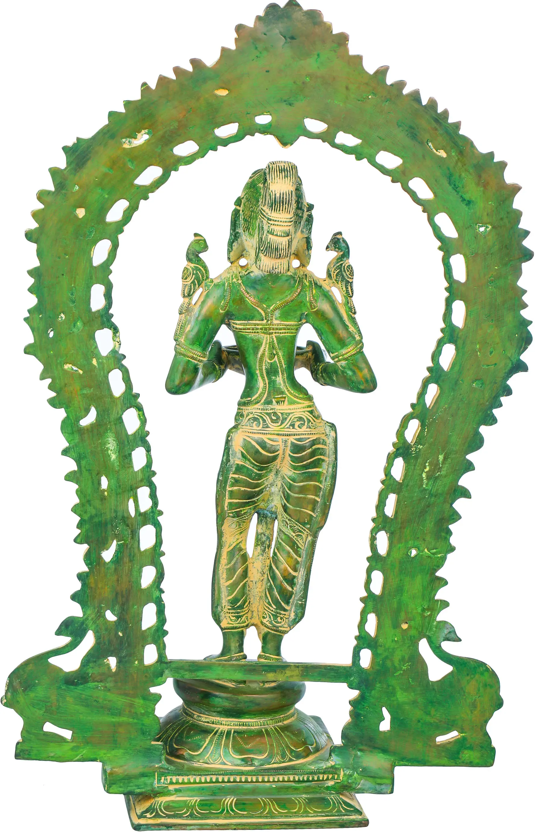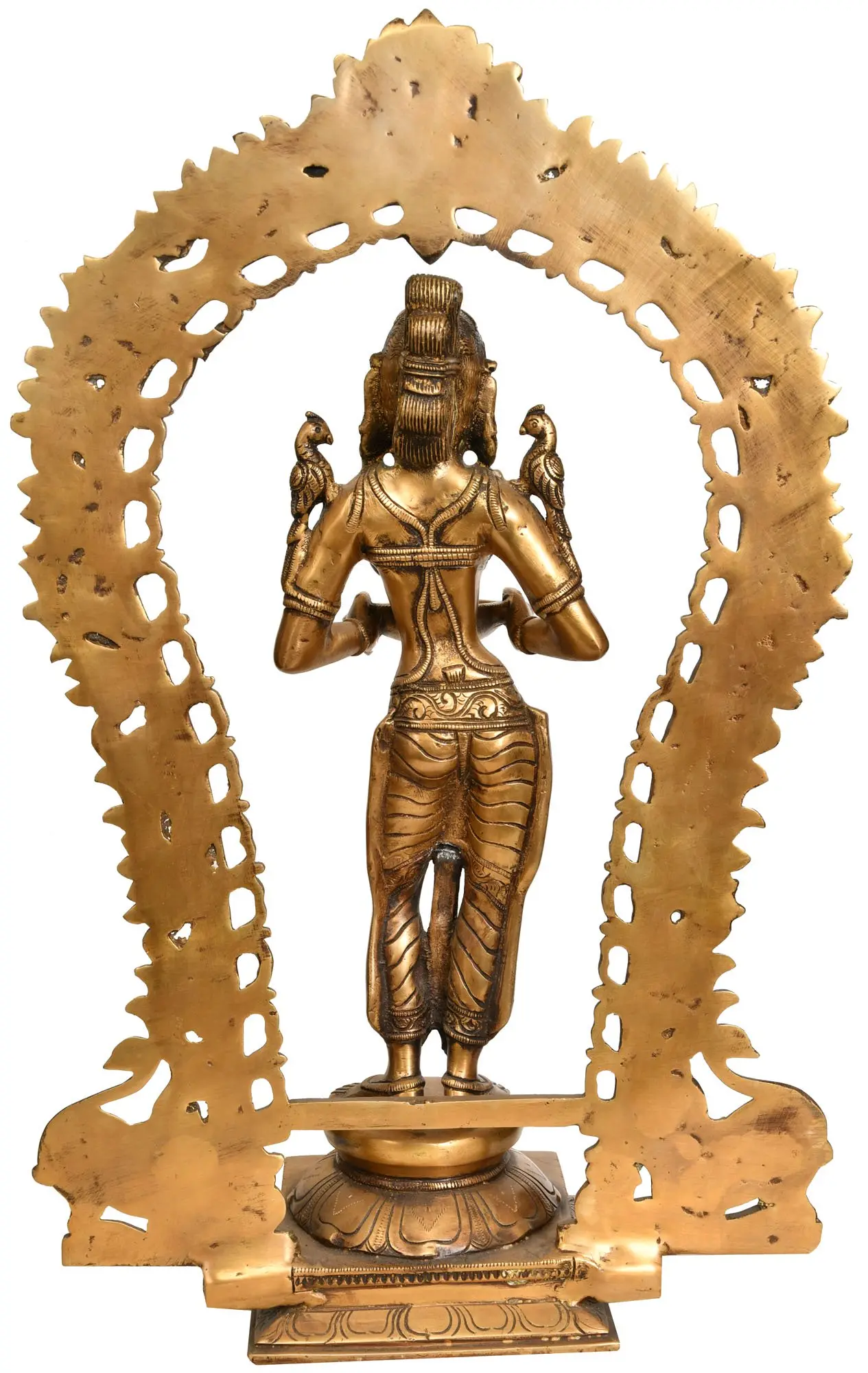 This Deepalakshmi, made in brass, portrays a divine image of a maiden holding a leaf-shaped lamp. Her image is associated with prosperity and growth hence she is compared with the sacred image of Goddess Lakshmi. Deepalakshmi stands gracefully on a lotus podium beneath an ornate kirtimukha (celestial face) throne, flanked by two yalis (mythical lion-like creatures) at the base. This intricate sculpture symbolizes auspiciousness, light, and prosperity in Hinduism. Deepalakshmis have historical significance as they were traditionally used in temples and homes to hold oil lamps during ceremonies and festivals, signifying the dispelling of darkness and the illumination of one's life with spiritual and material prosperity.