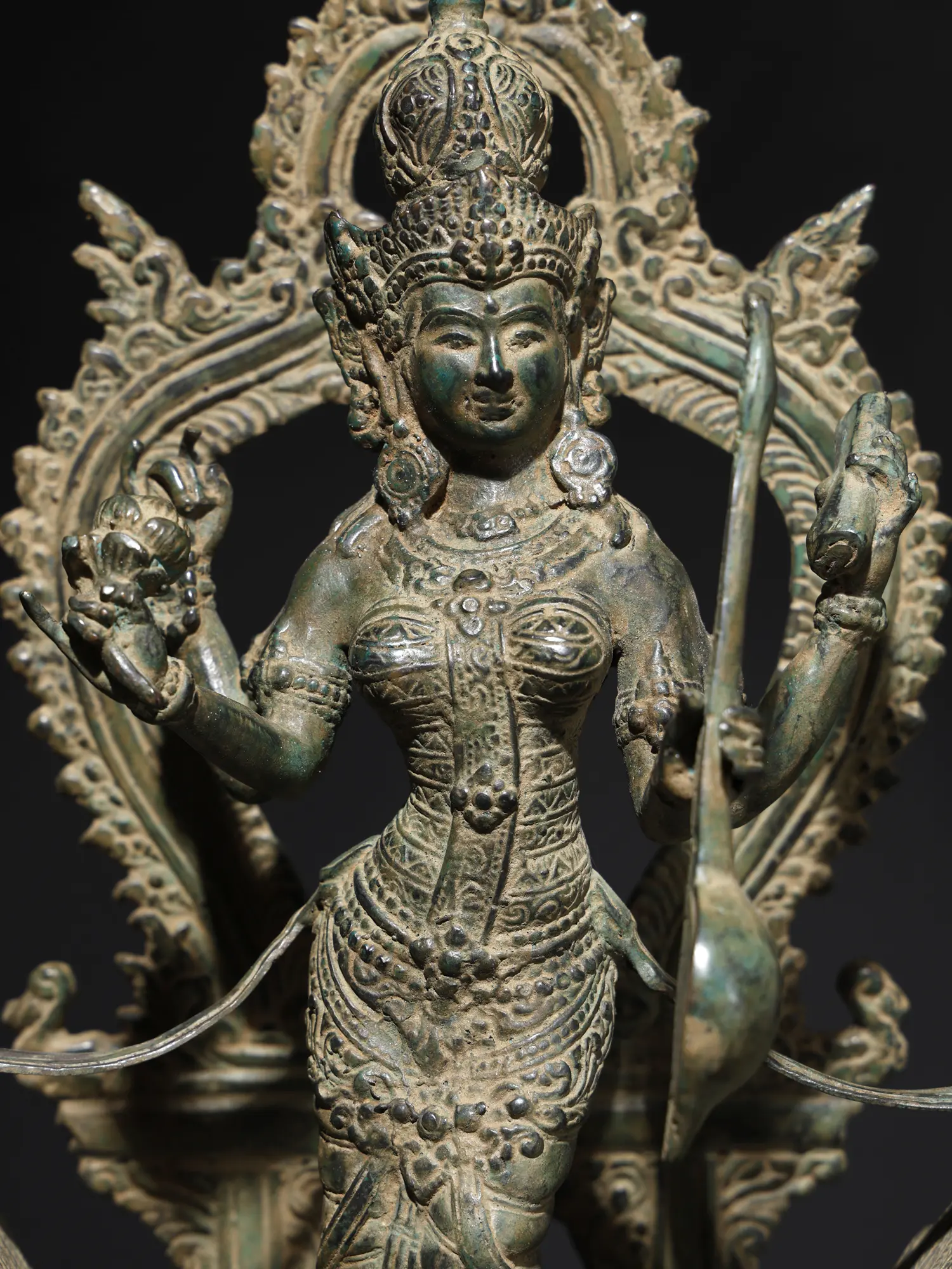 The Hindu goddess of wisdom- Saraswati, in Southeast Asia, is a revered deity, including in Indonesia, a country whose ethereal iconography of Hamsavahini (she who rides a swan) can be seen in this magnificent brass.